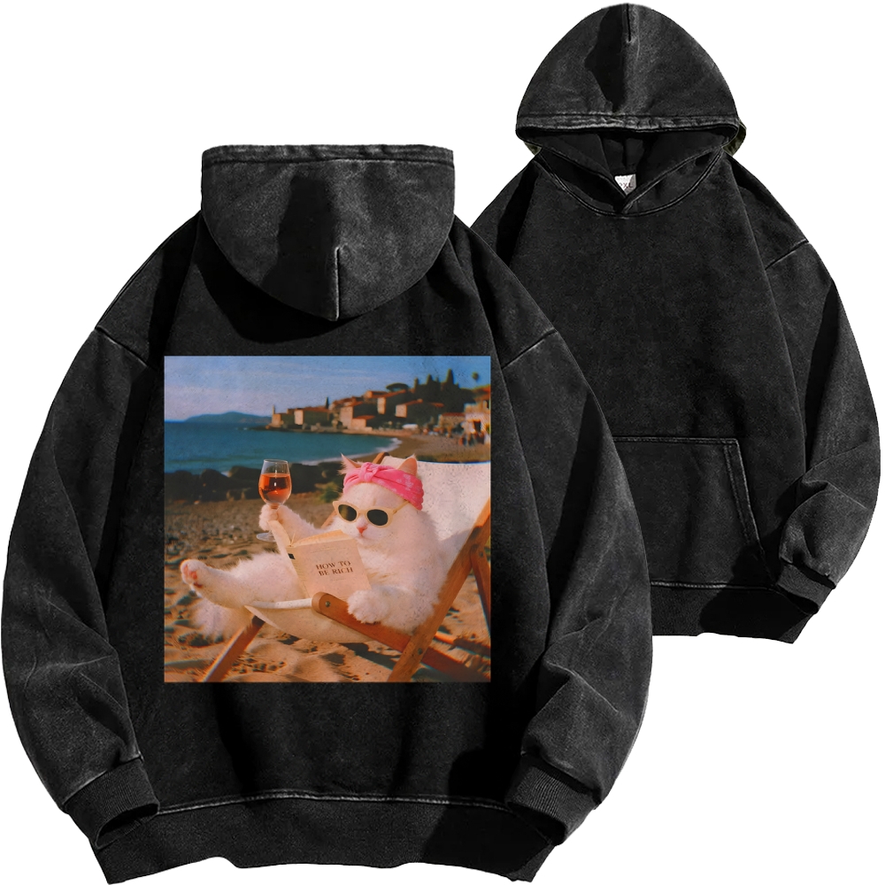 Wacky Cat Front And Back Printing Vintage Washed Hoodie