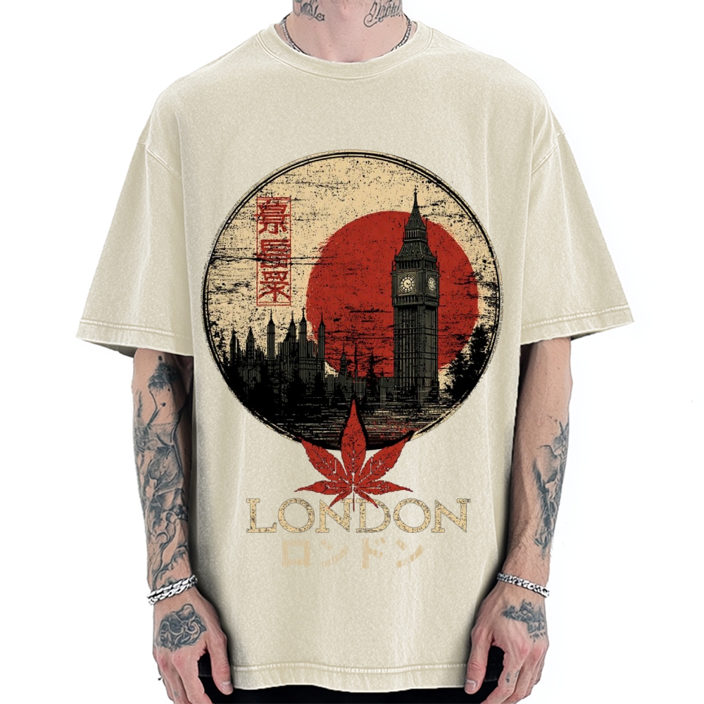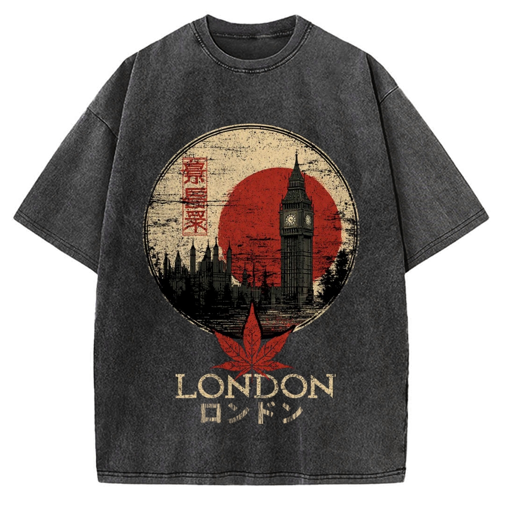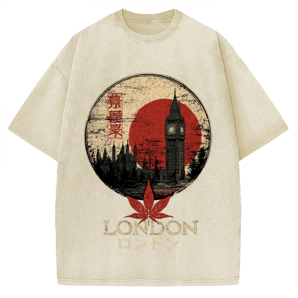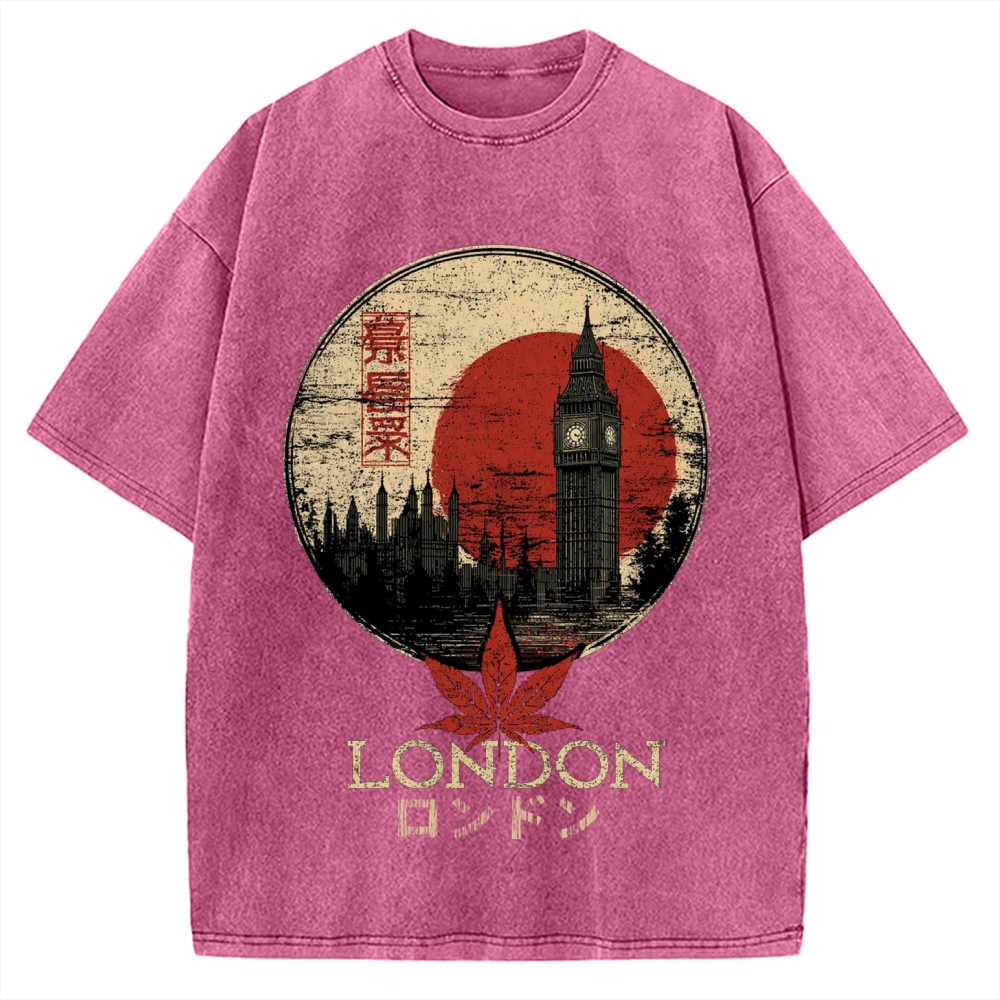 Red leaves London Japanese style painting Ukiyo-e Vintage Washed T-shirt