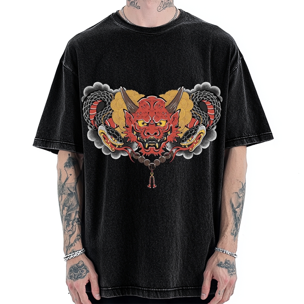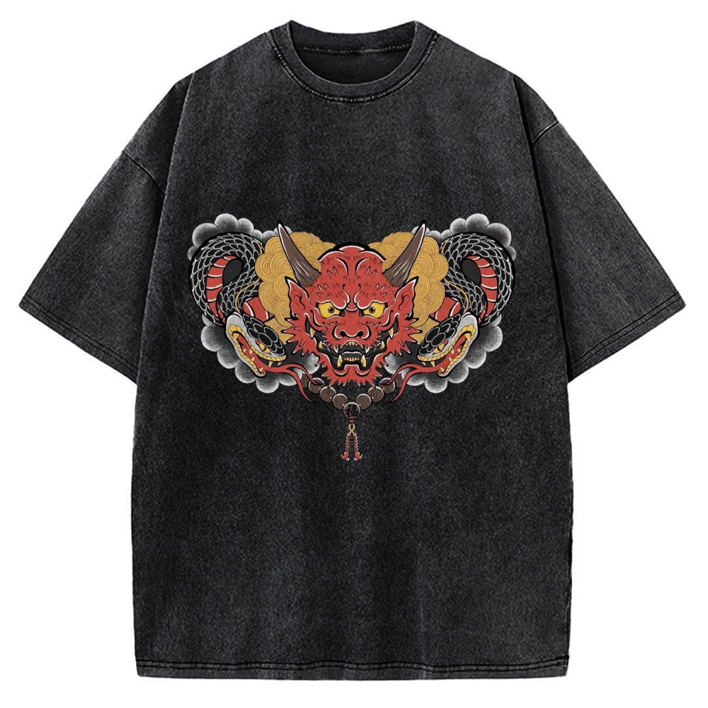 Japanese yokai shirt Oni demon Harajuku fashion Vintage Washed T-shirt