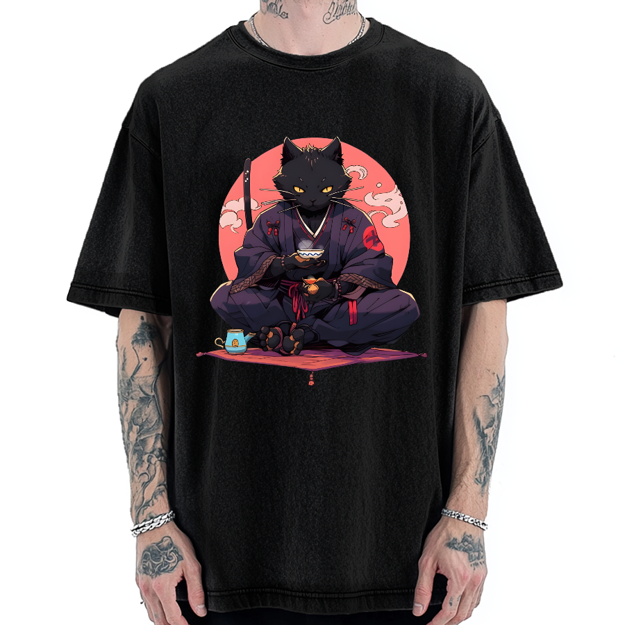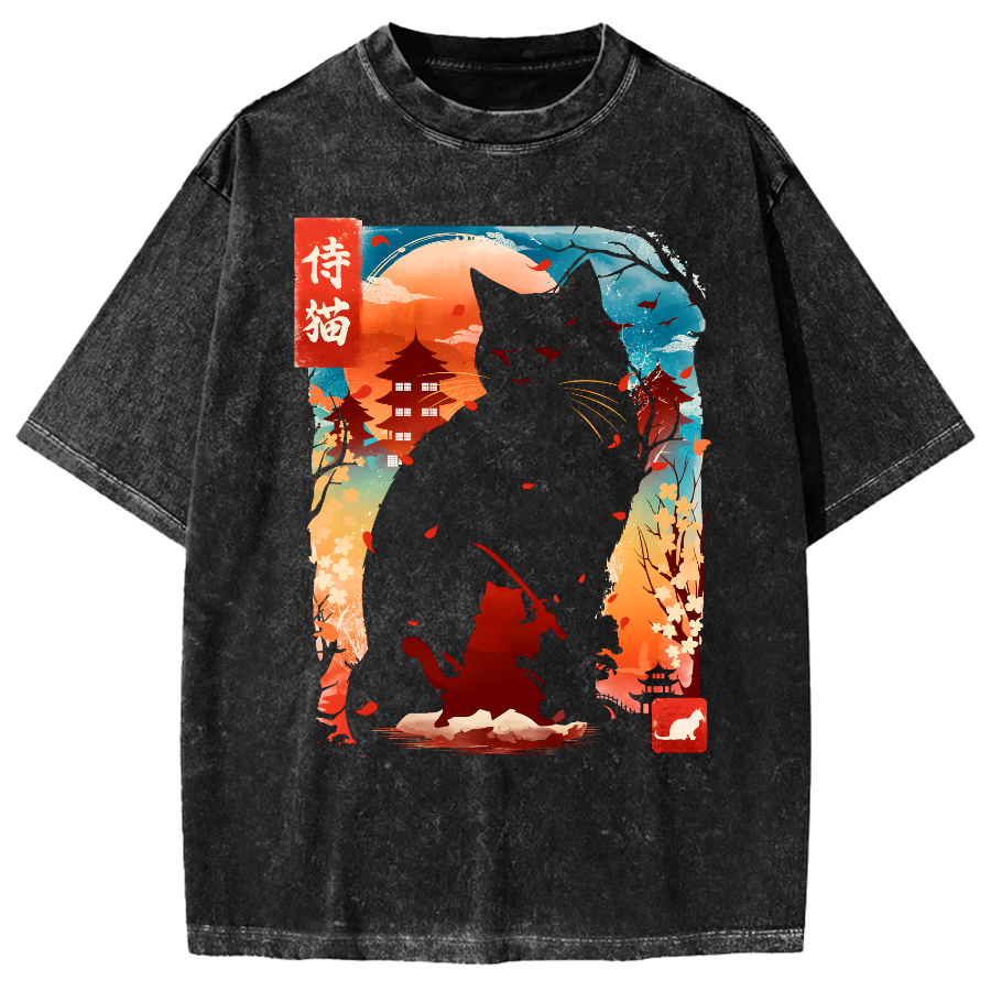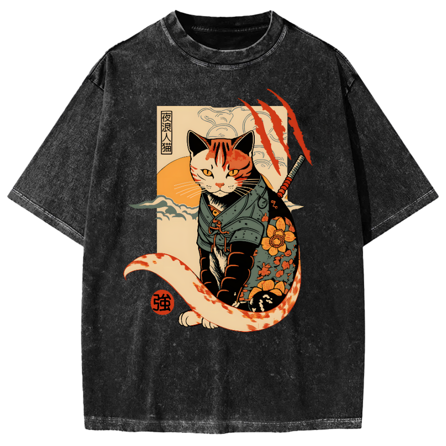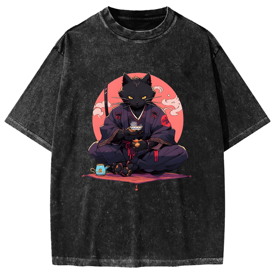 Black Cat Warrior Samurai Vintage Washed T-shirt