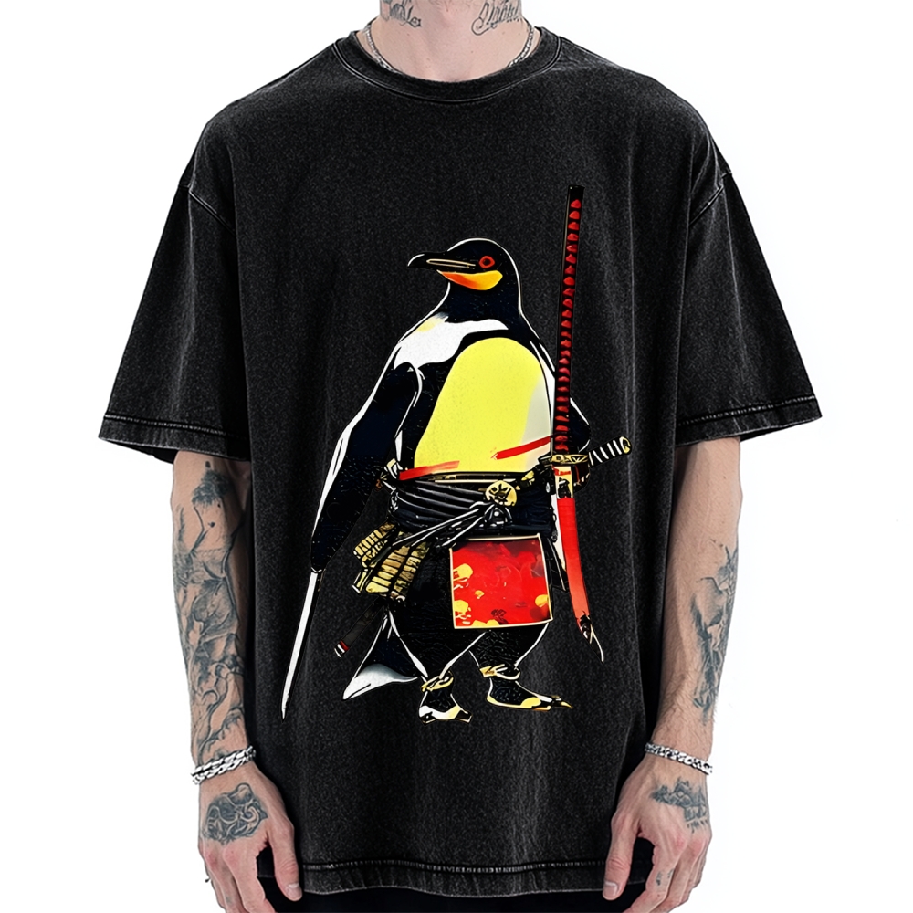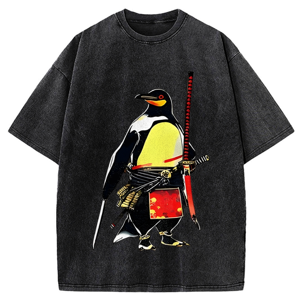 Japanese Classic Ukiyo-e Neon Pop Art Samurai Cat Vintage Washed T-shirt
