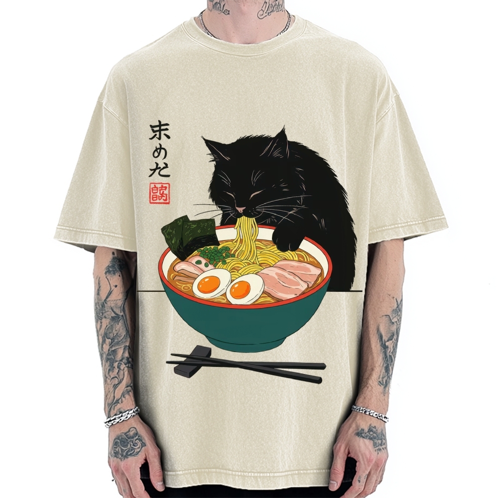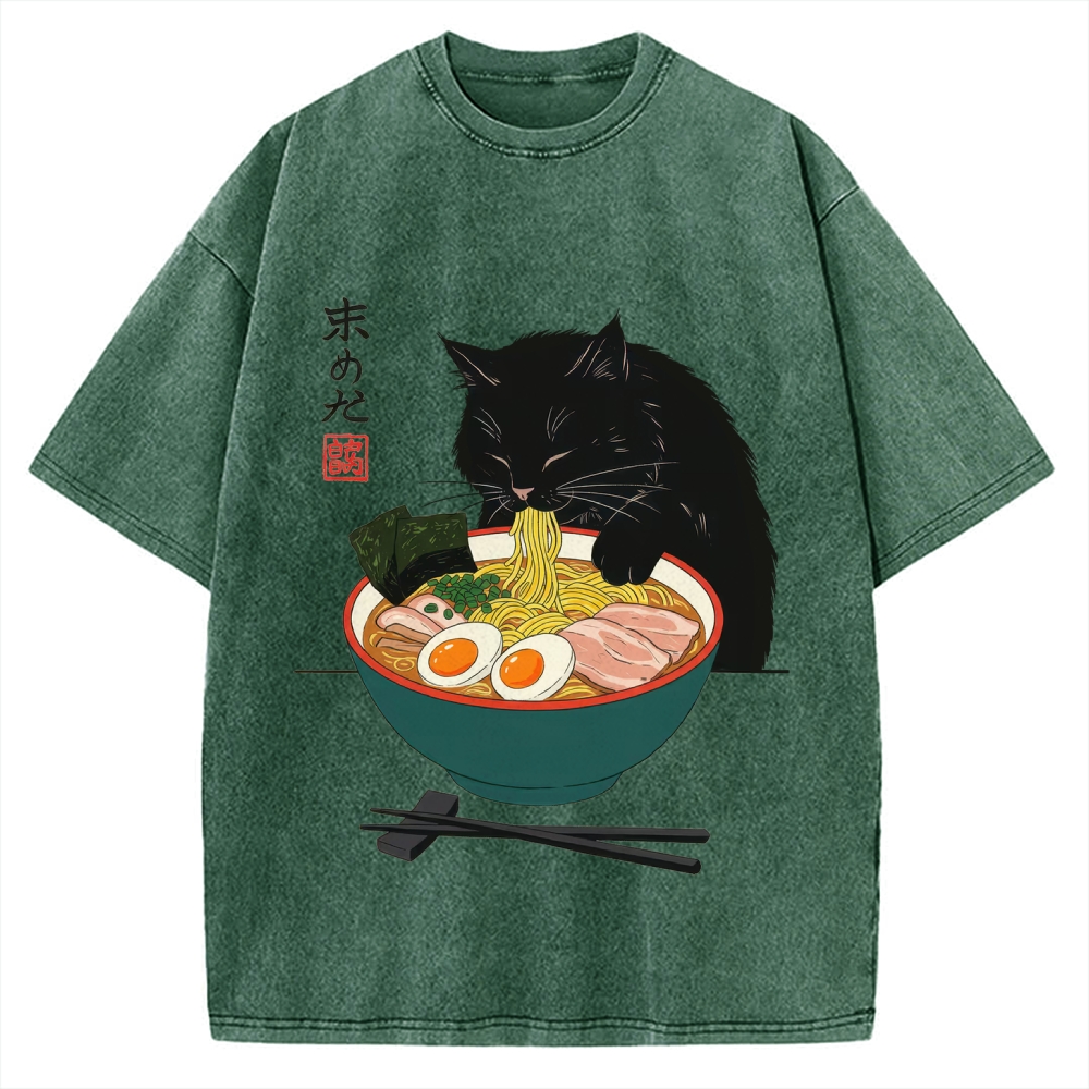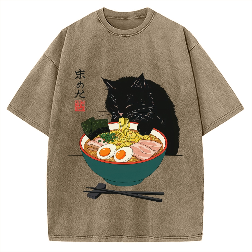 Black Cat Eating Ramen Vintage Washed T-shirt