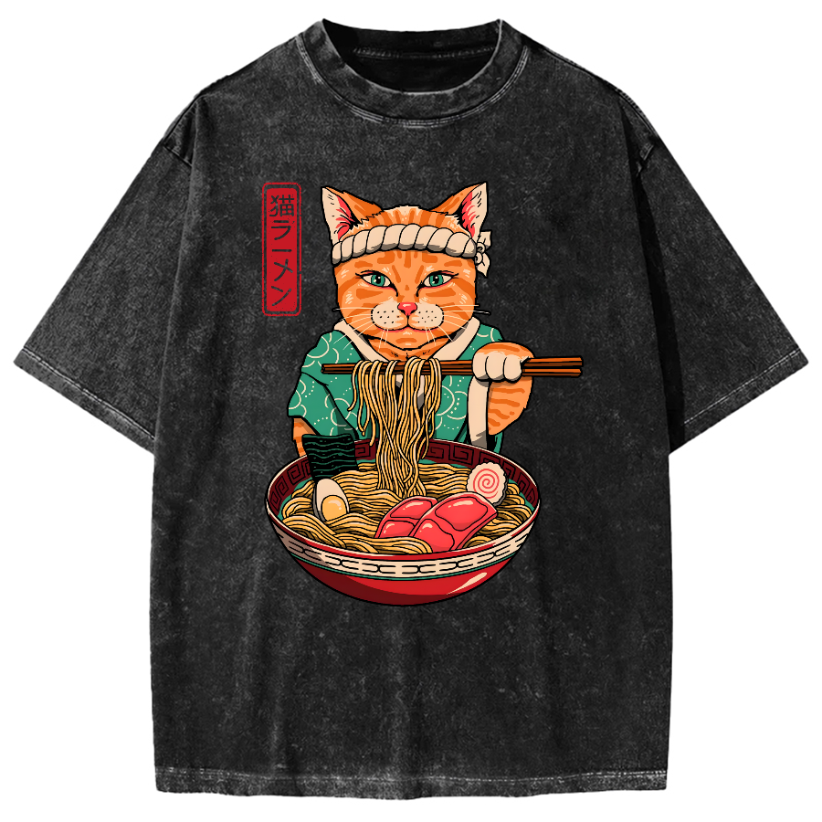 Cat Eating Ramen Japanese Ukiyoe Vintage Washed T-shirt
