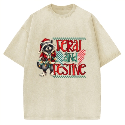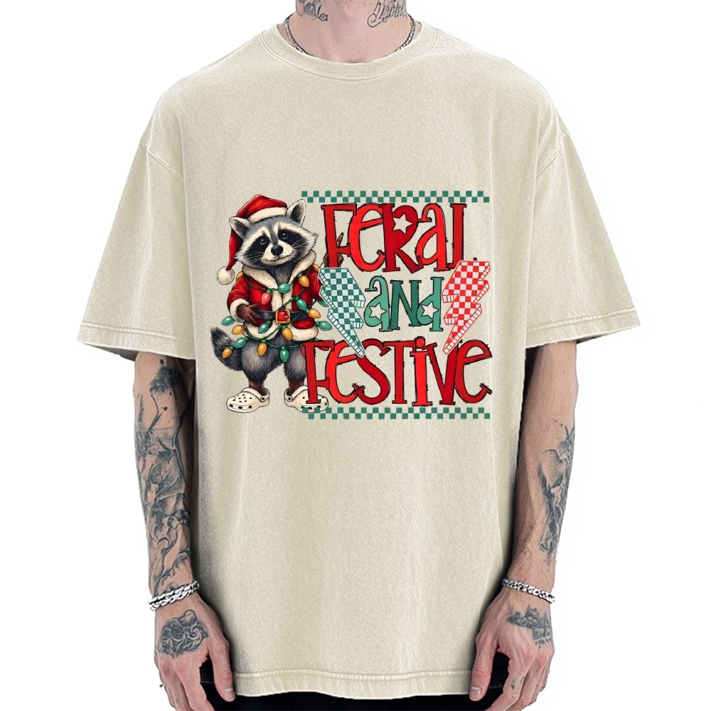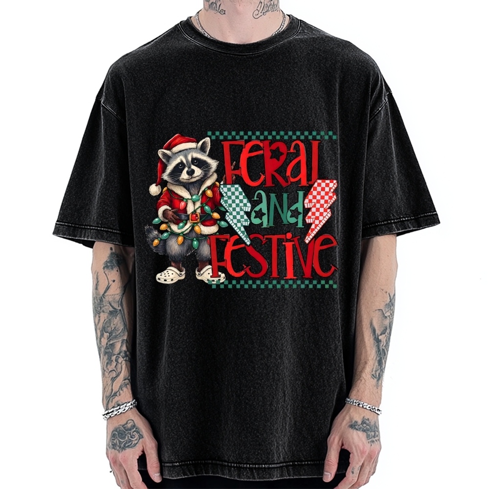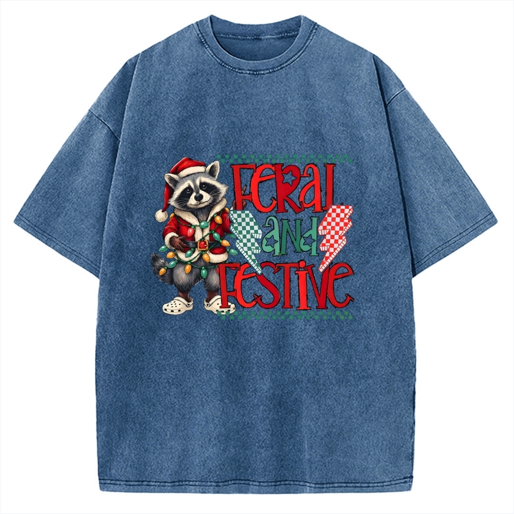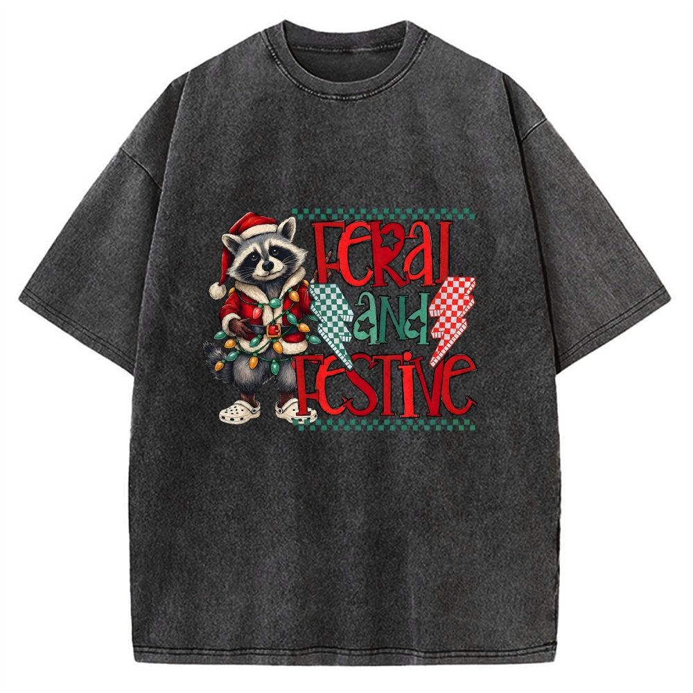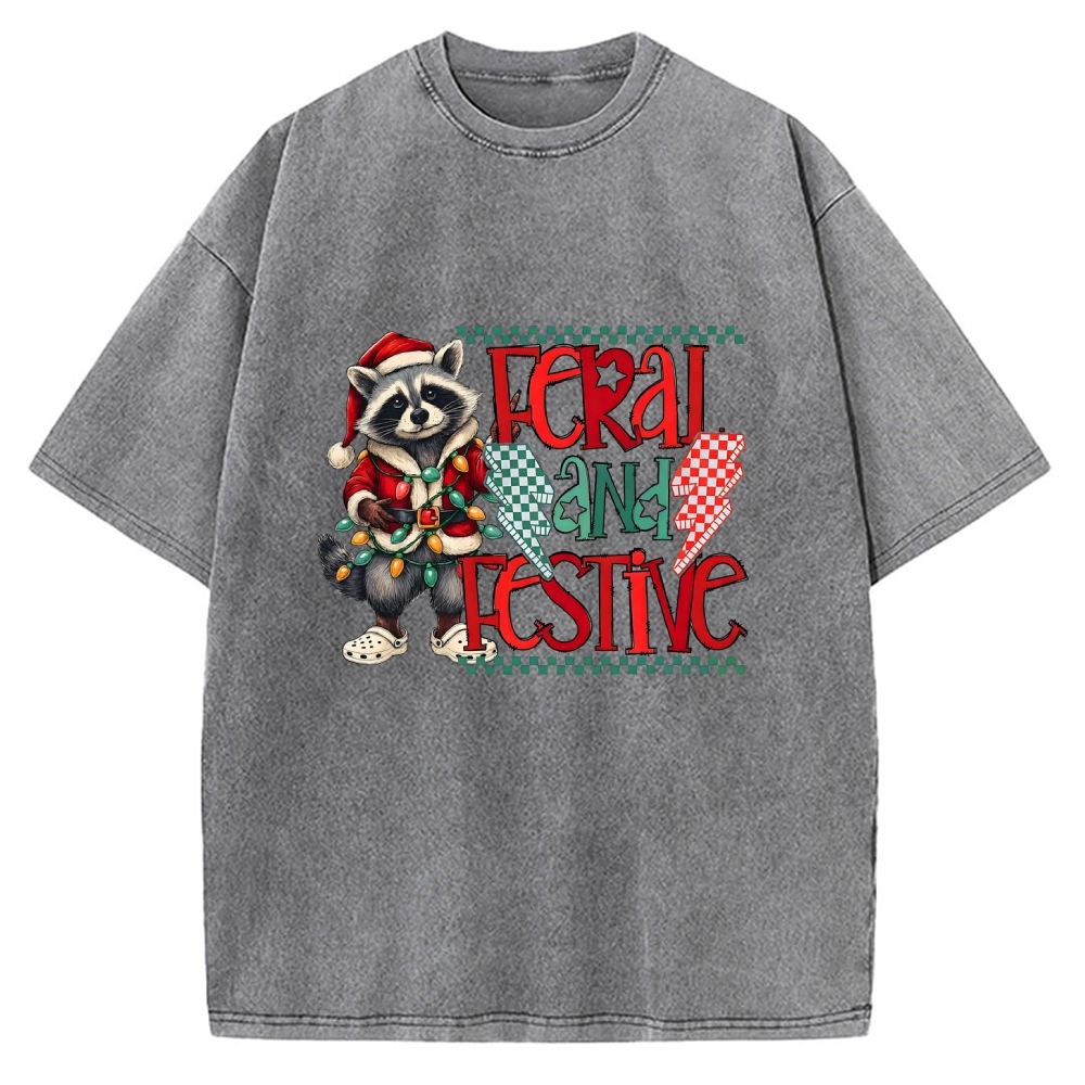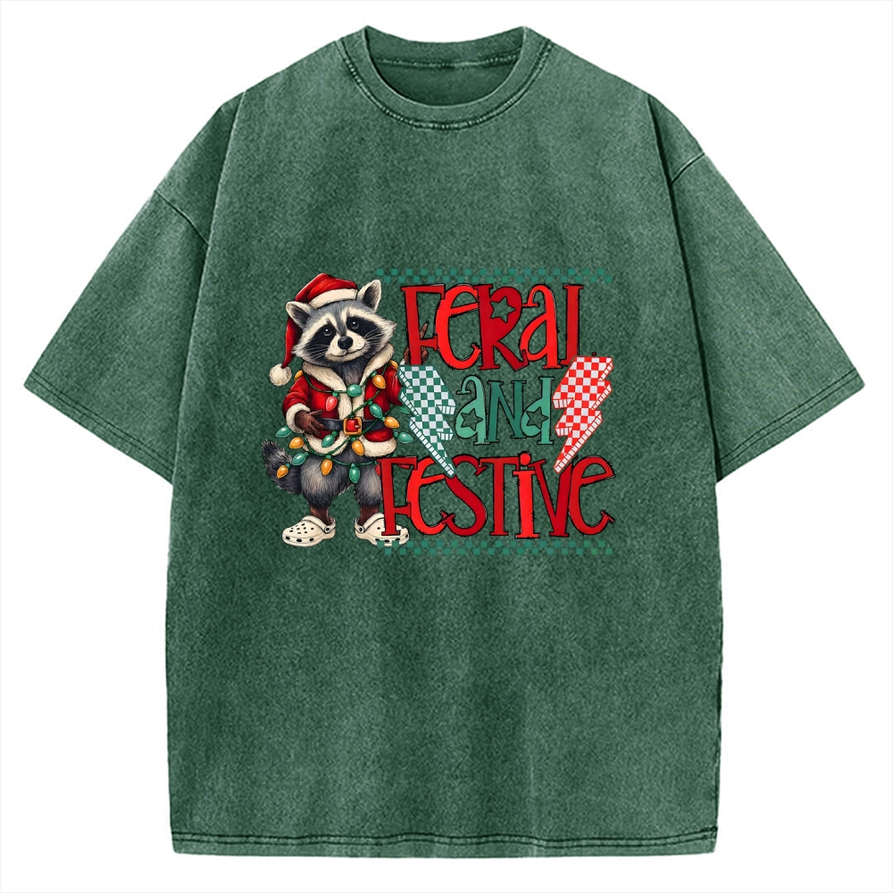Feral and Festive Raccoon Funny Christmas Vintage Washed T-shirt