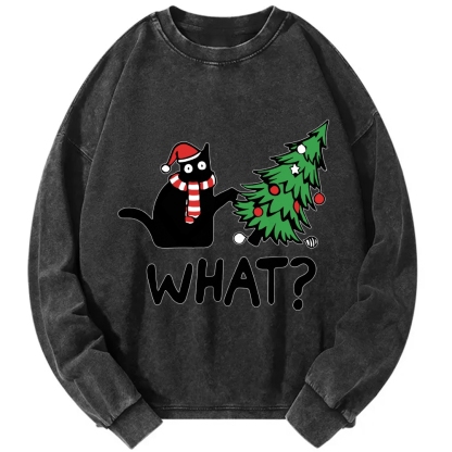 Funny Black Cat Gifts Pushing Christmas Tree Over Cat What Vintage Washed Sweatshirts