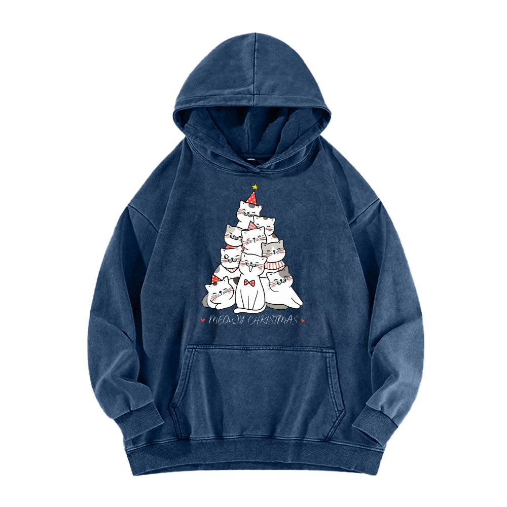 Kawaii Christmas Tree Cute Cat Vintage Washed Hoodie