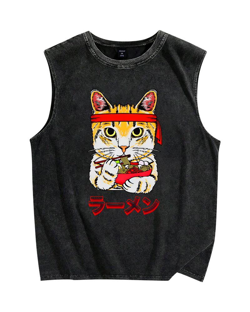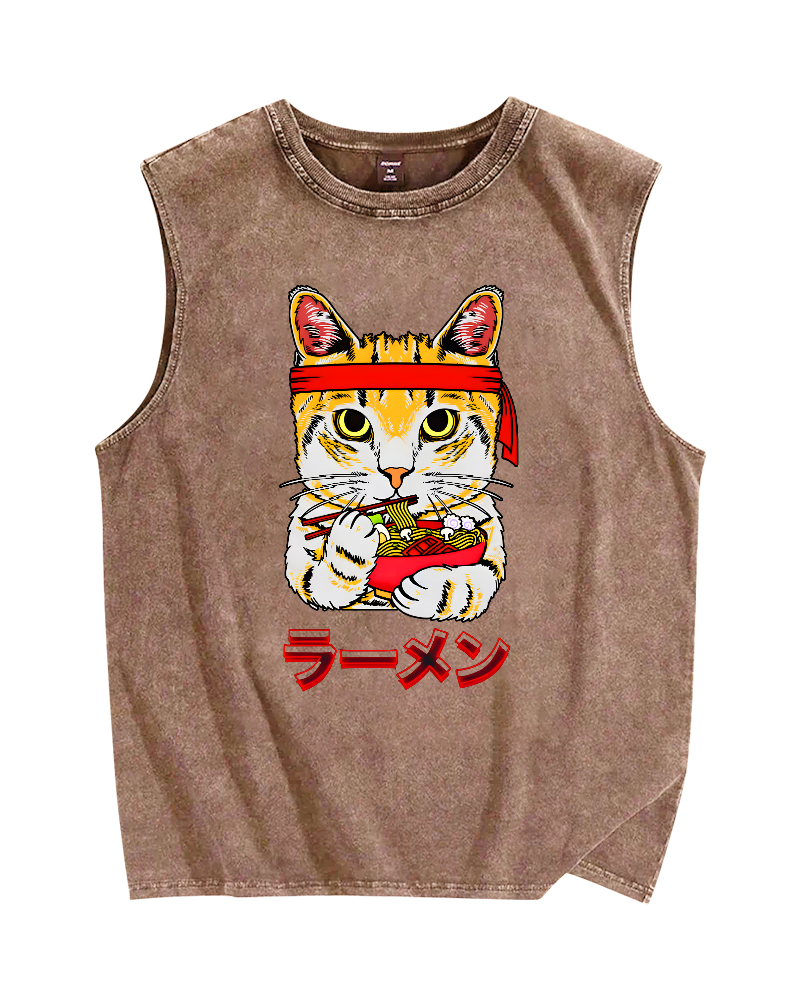 Cat Lamian Noodles Japan Vintage Distressed Washed Tank Top