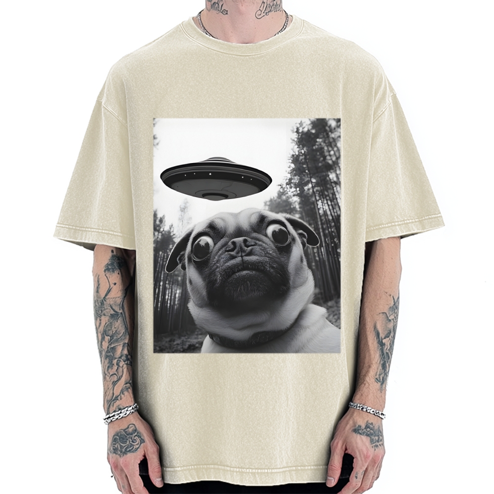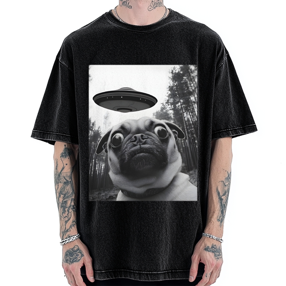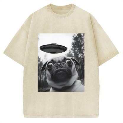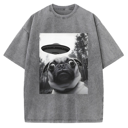 Funny Humor Pug Selfie with Alien UFO Vintage Washed T-shirt