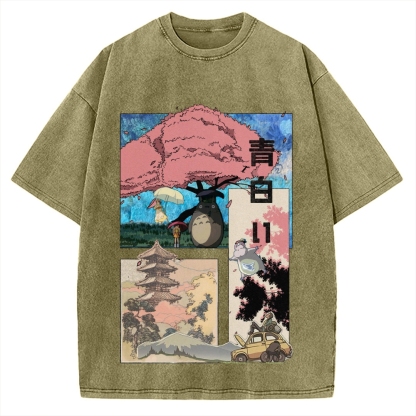Japanese Anime Mixed Style Collage Ukiyo-E Vintage Washed T-shirt