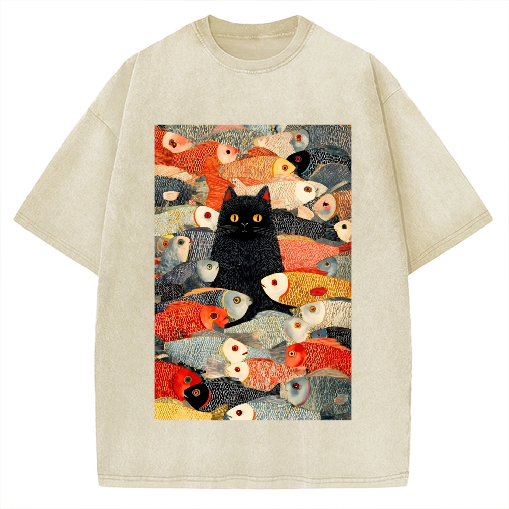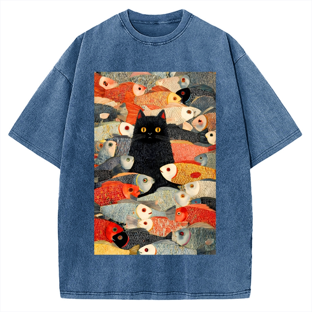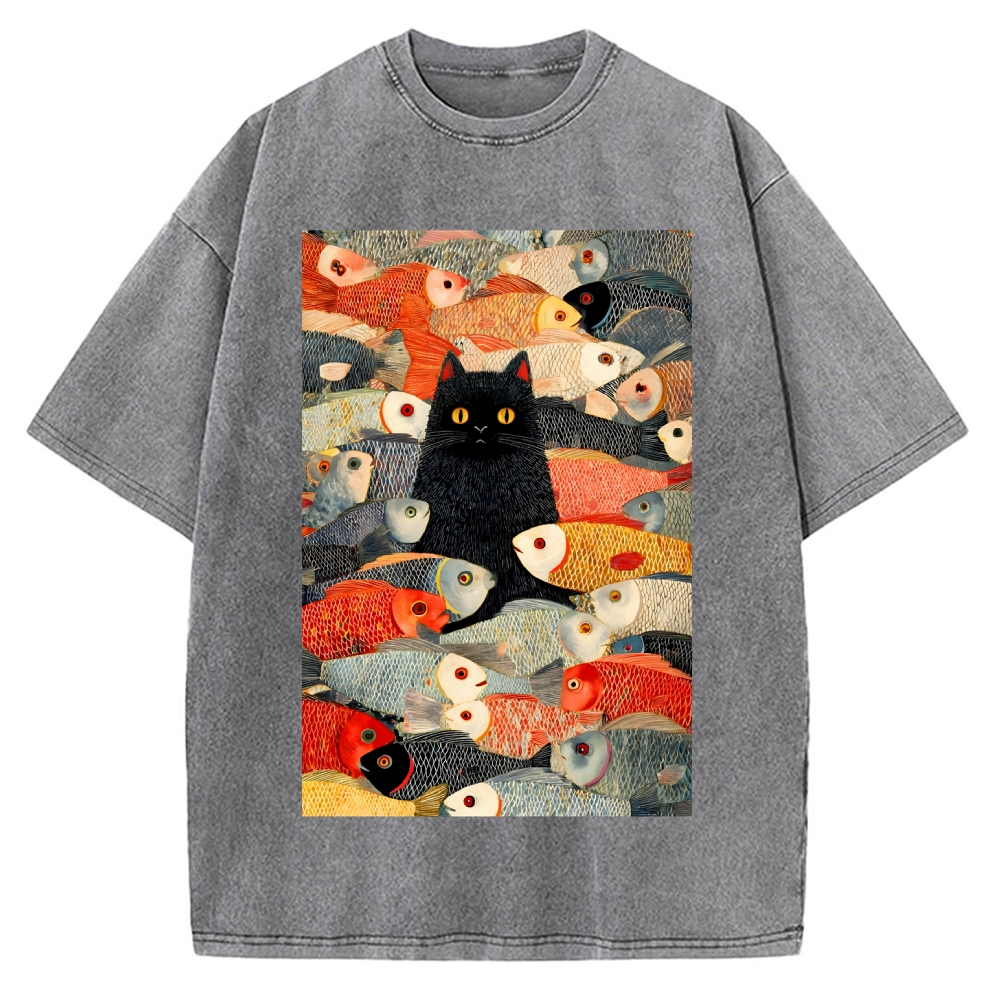 Japanese Black Cat Koi Fish Printed Vintage Washed T-shirt
