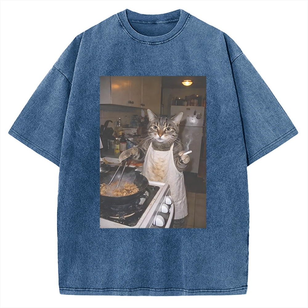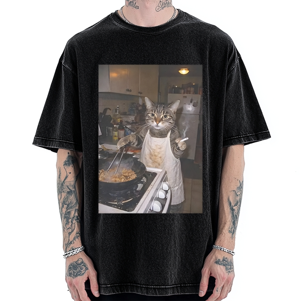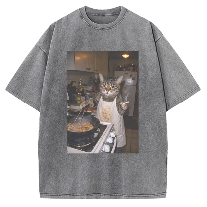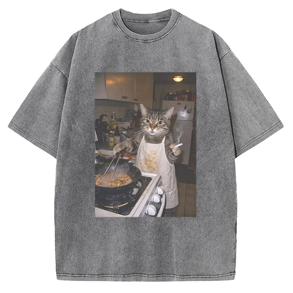 Retro Cooking Cat Meme Graphic Vintage Washed T-shirt