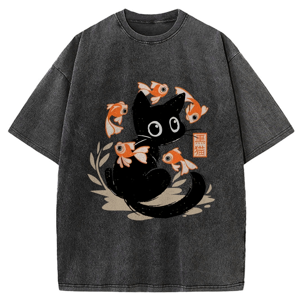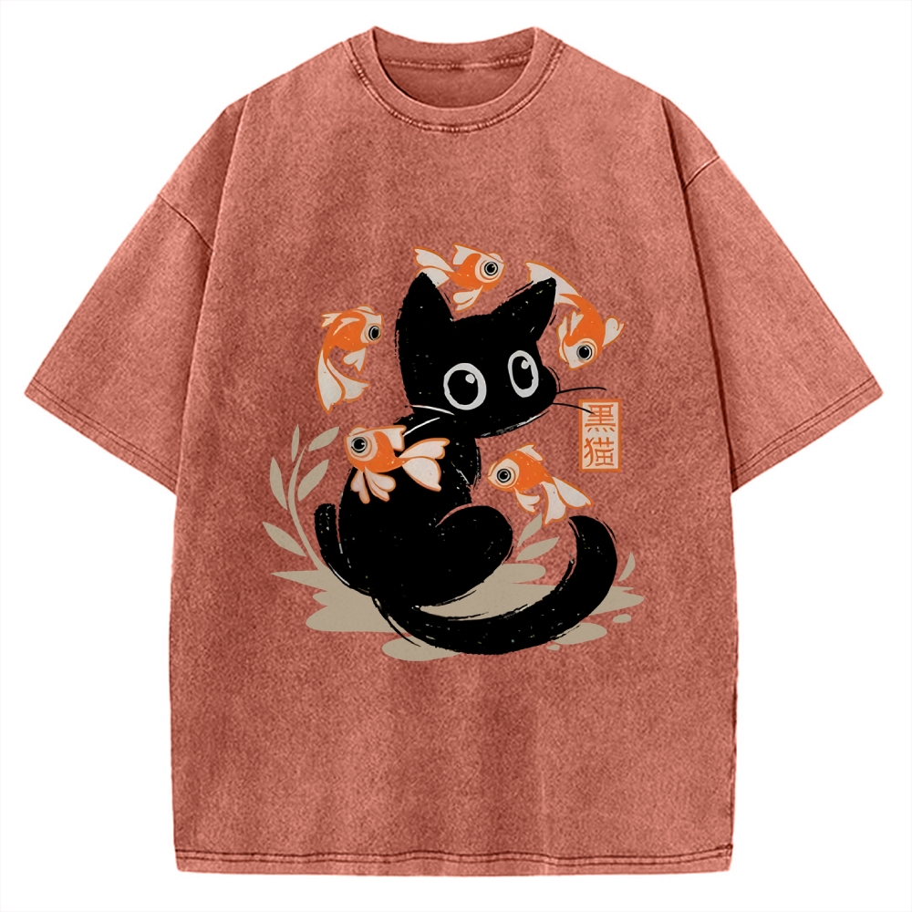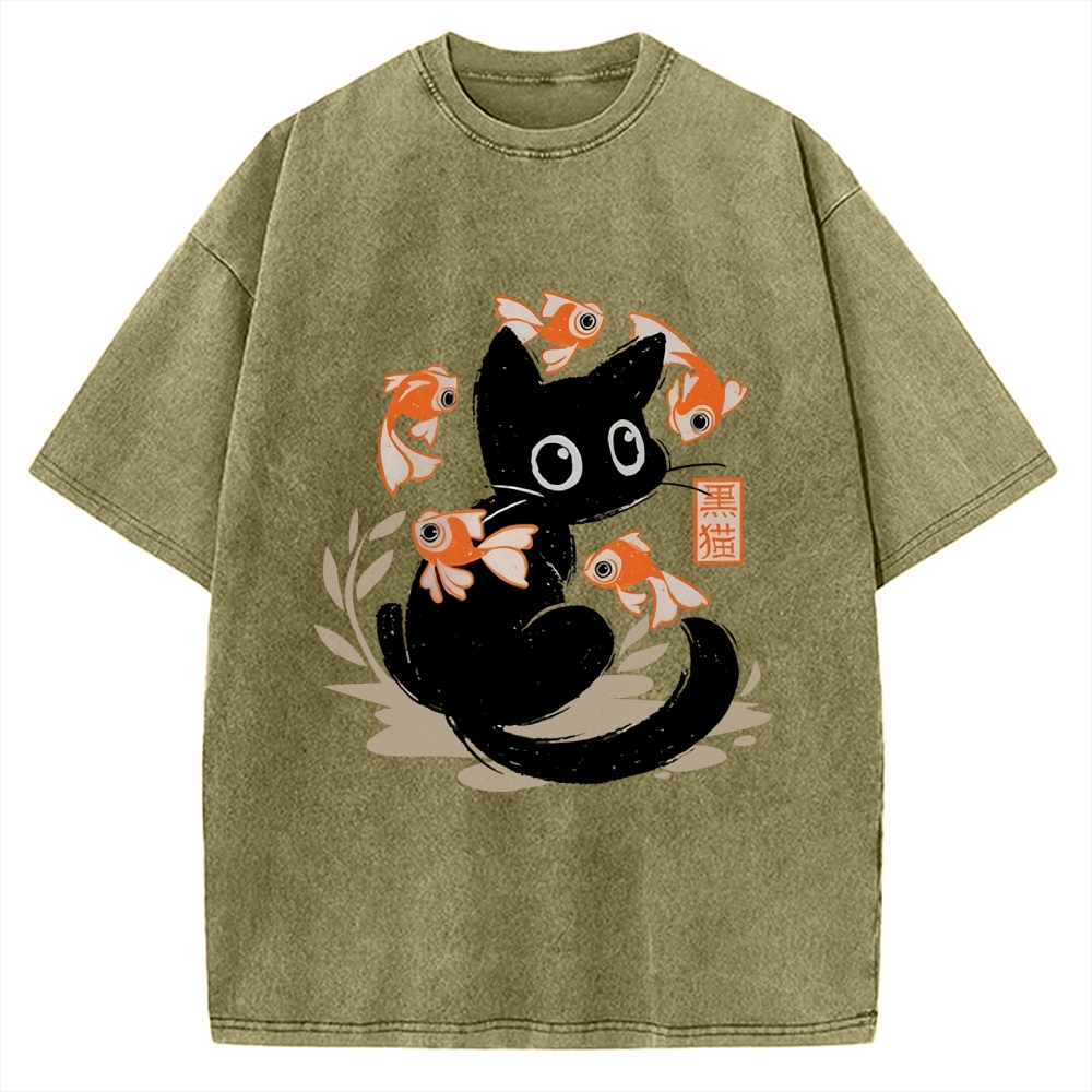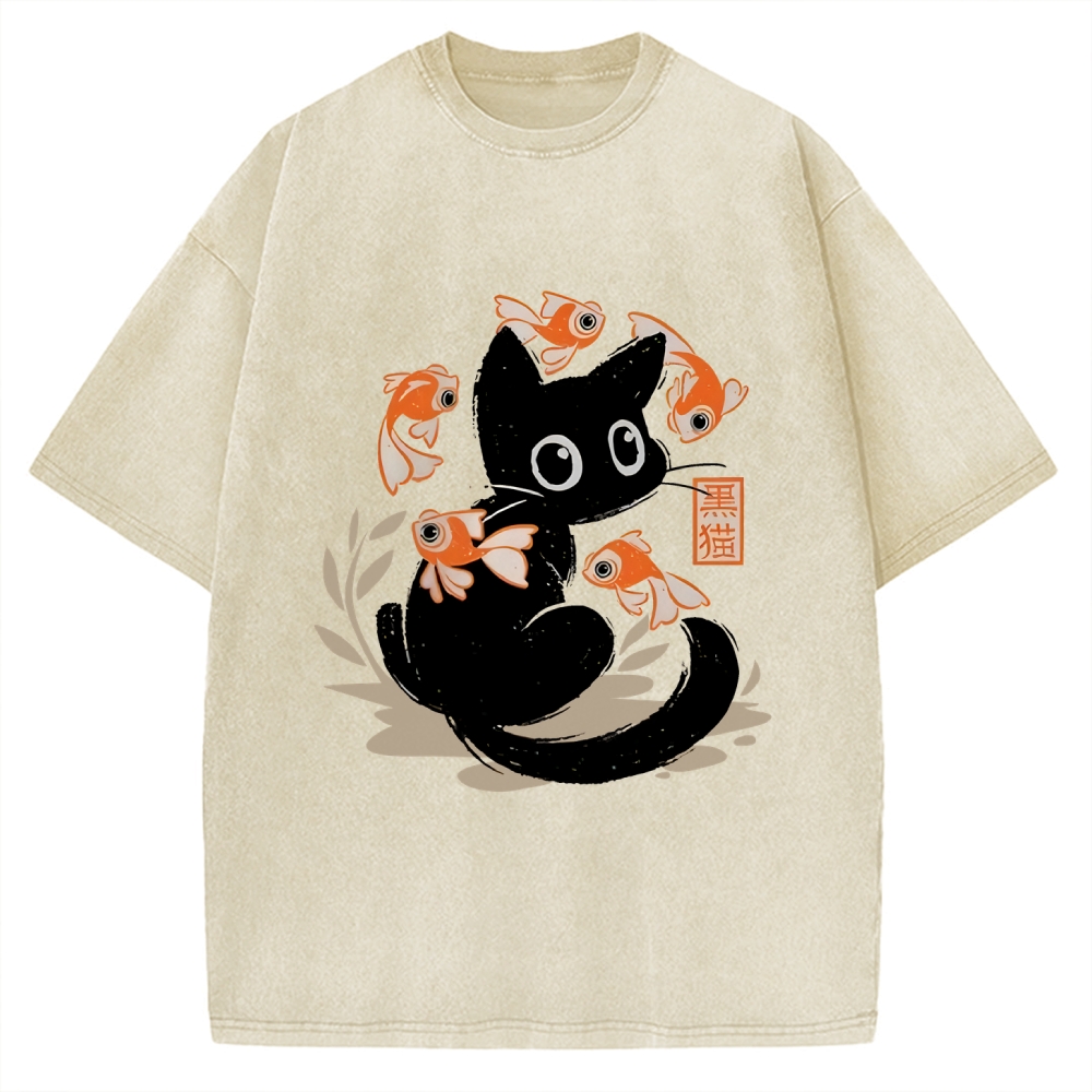 Curious Black Cat Among Fish Vintage Washed T-shirt