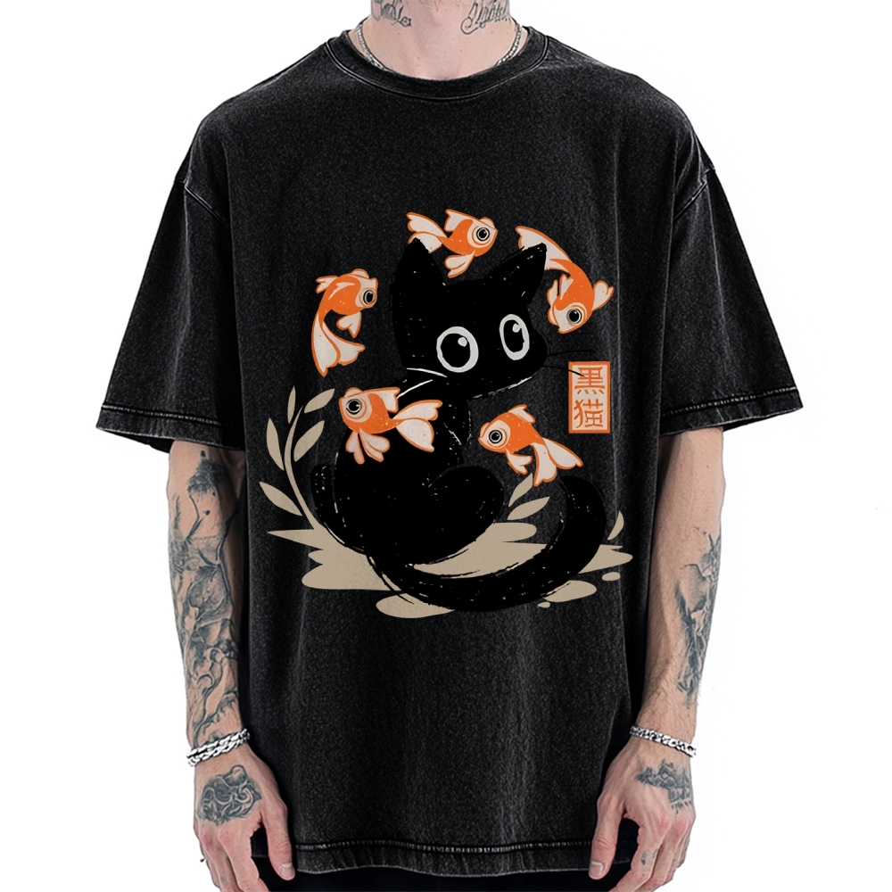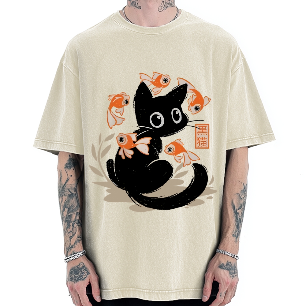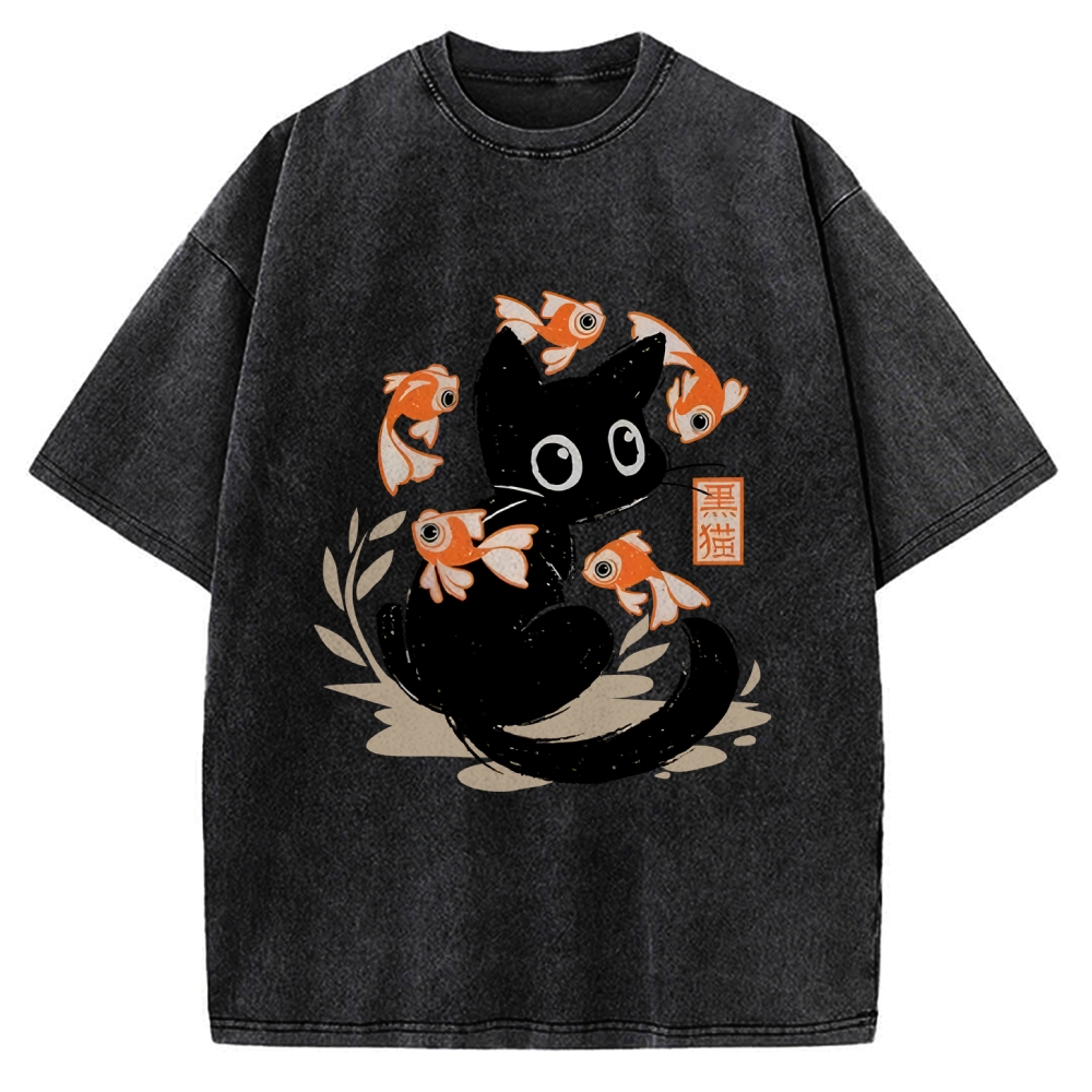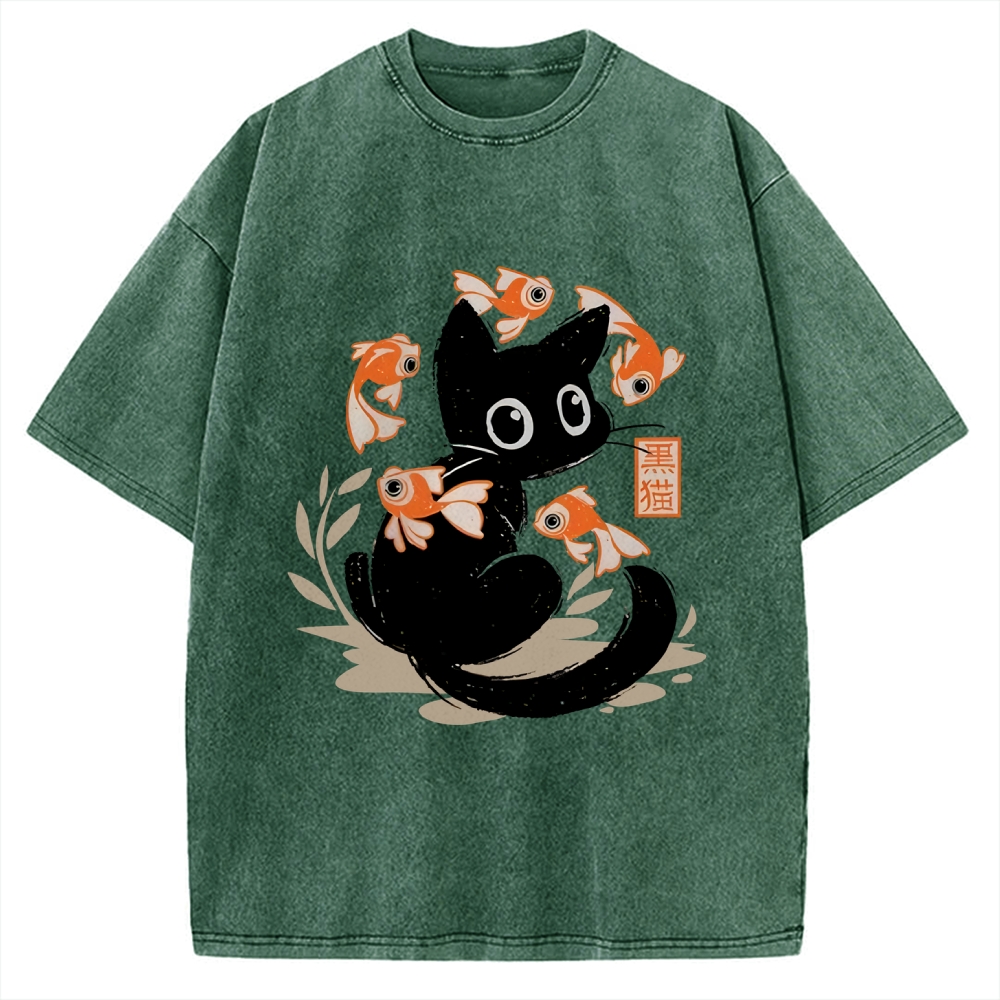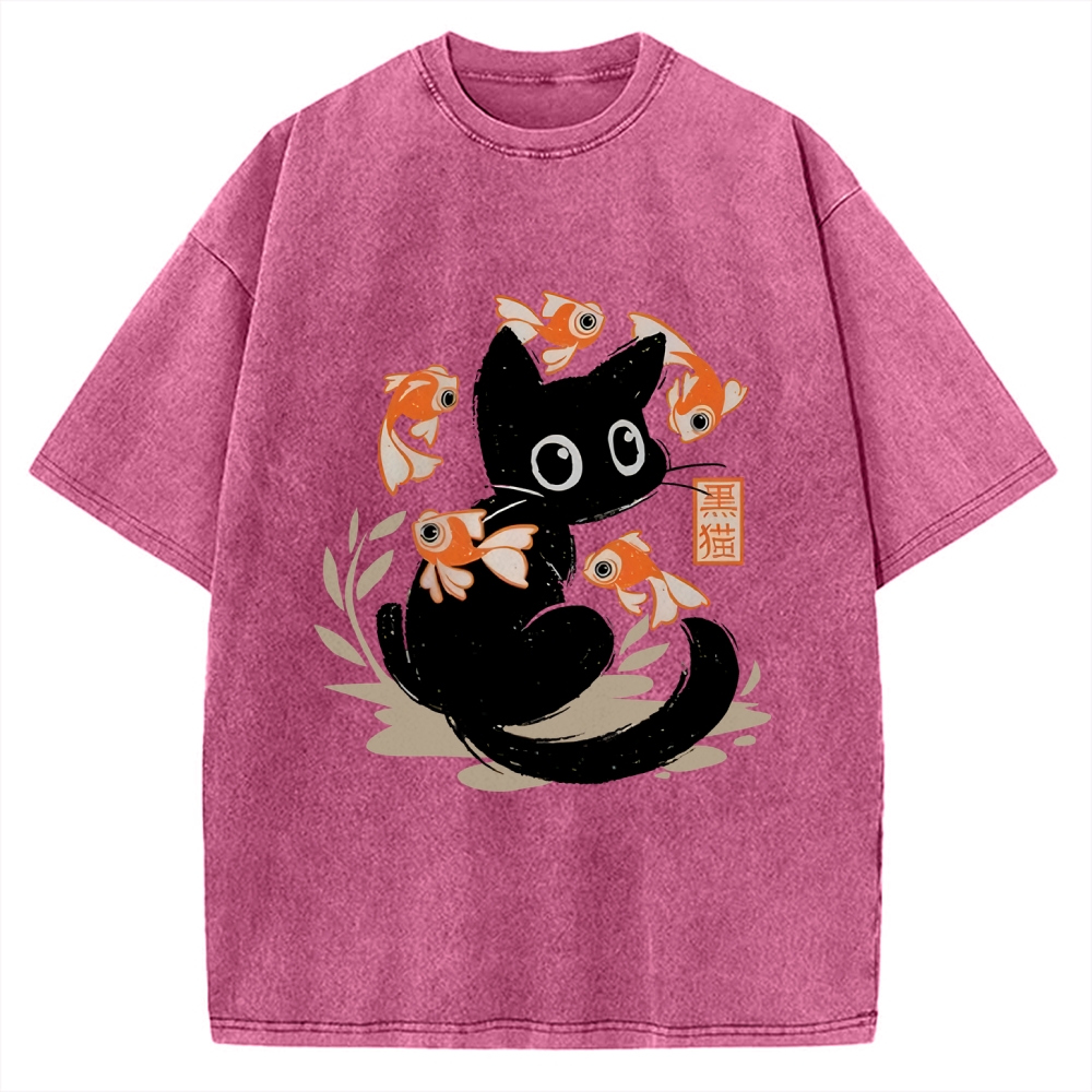 Curious Black Cat Among Fish Vintage Washed T-shirt