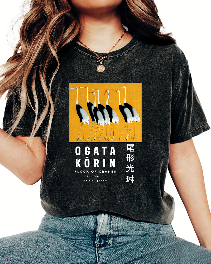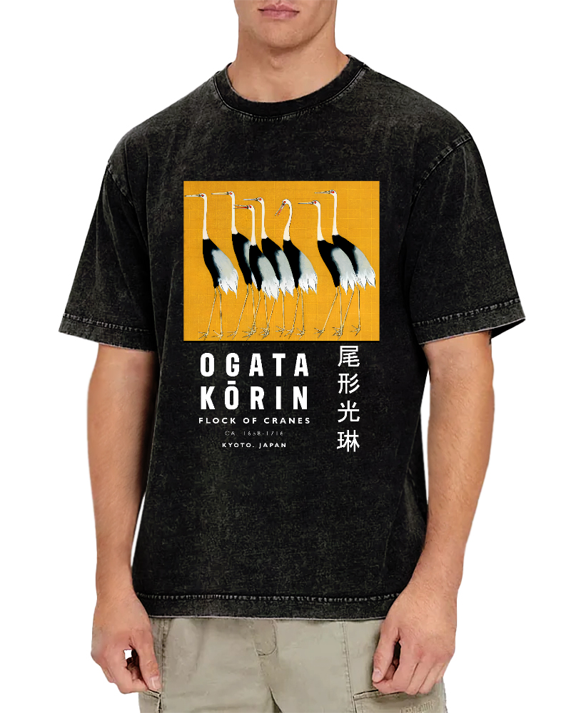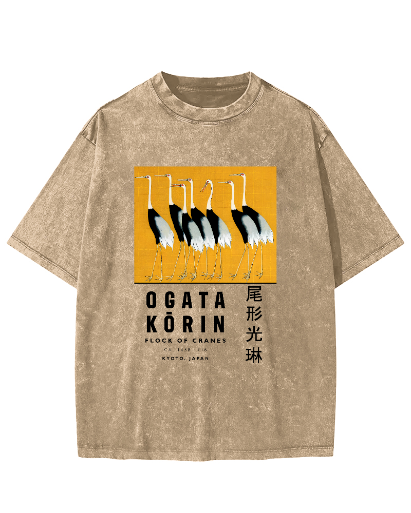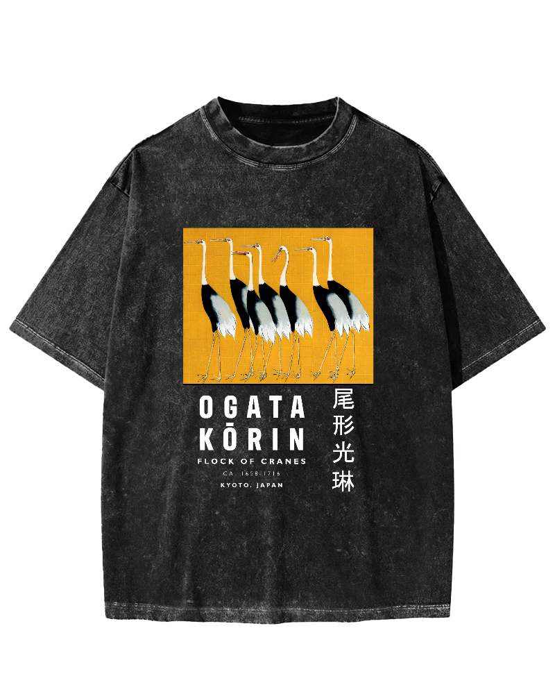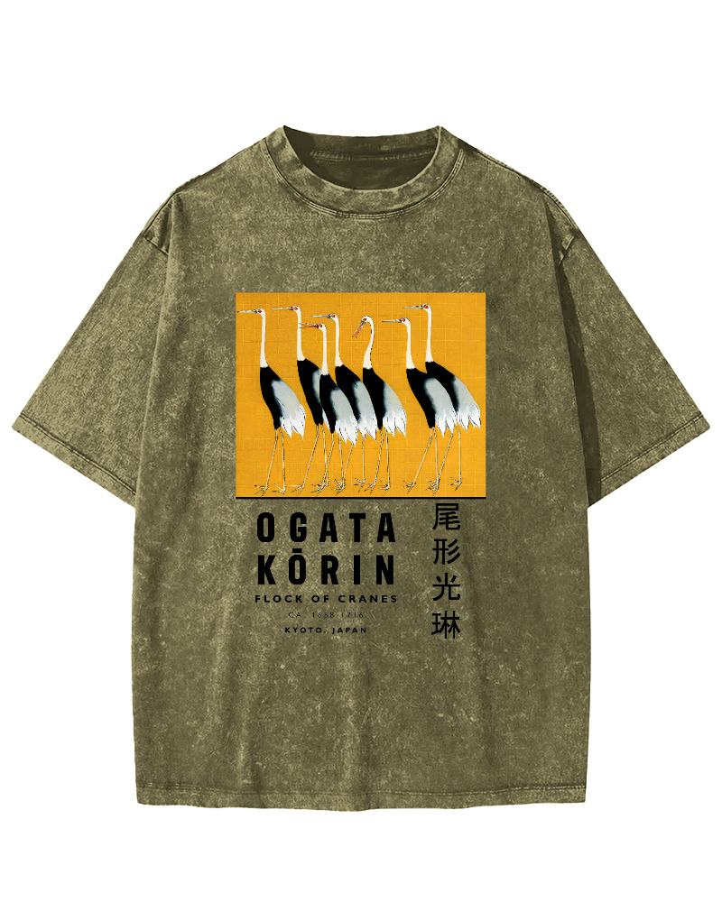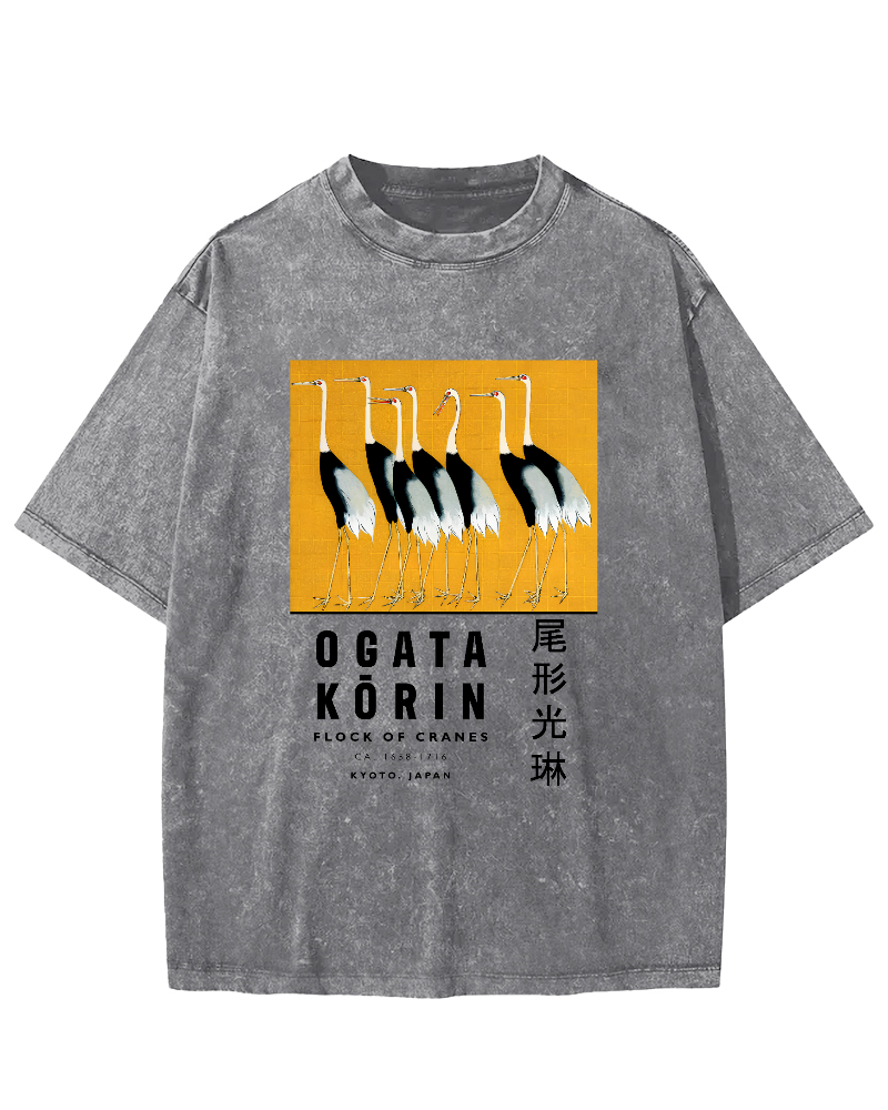 Tail shaped Guanglin Red crowned Crane Art Vintage Washed T-shirt