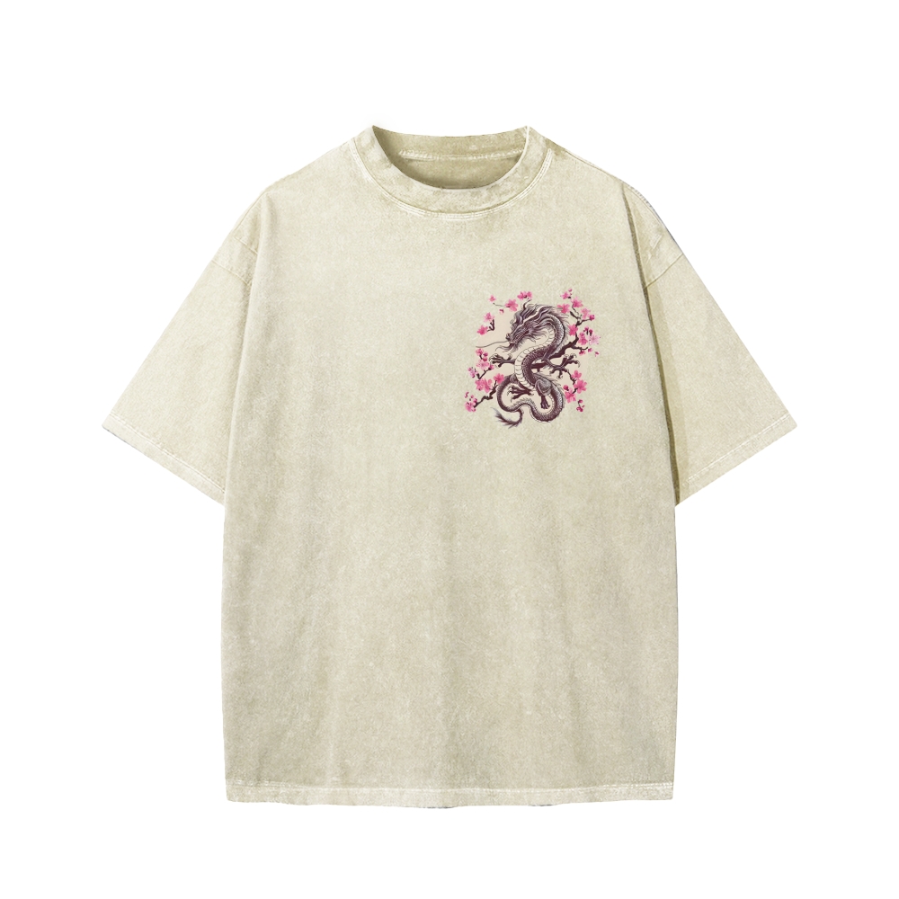 Japanese Sakura Dragon Front And Back Printing Washed T-shirt