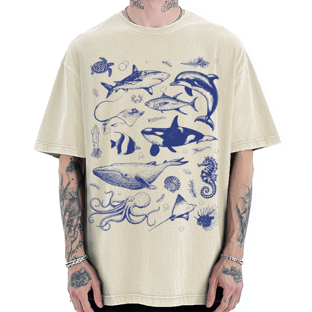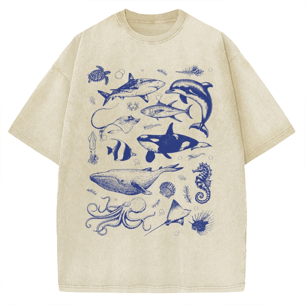 Vintage 90s Ocean Animals :Retro Tattoo Style Vintage Washed T-shirt
