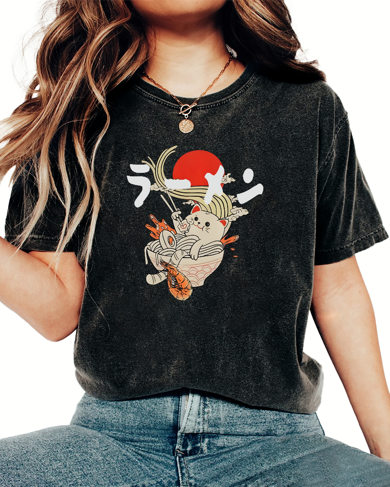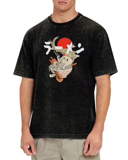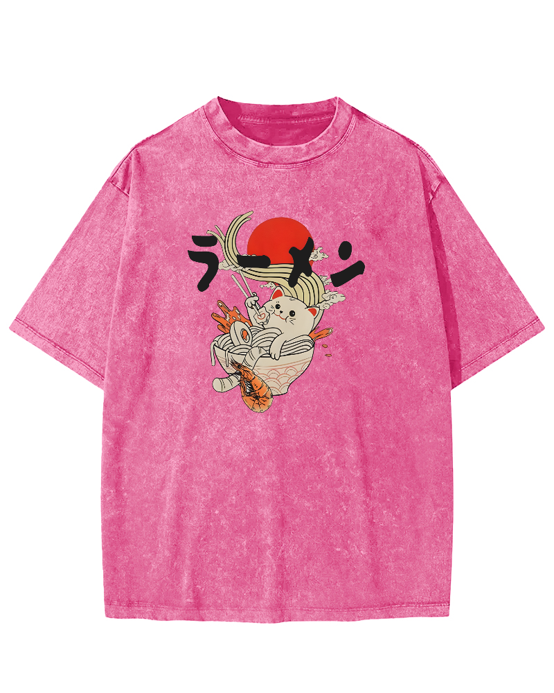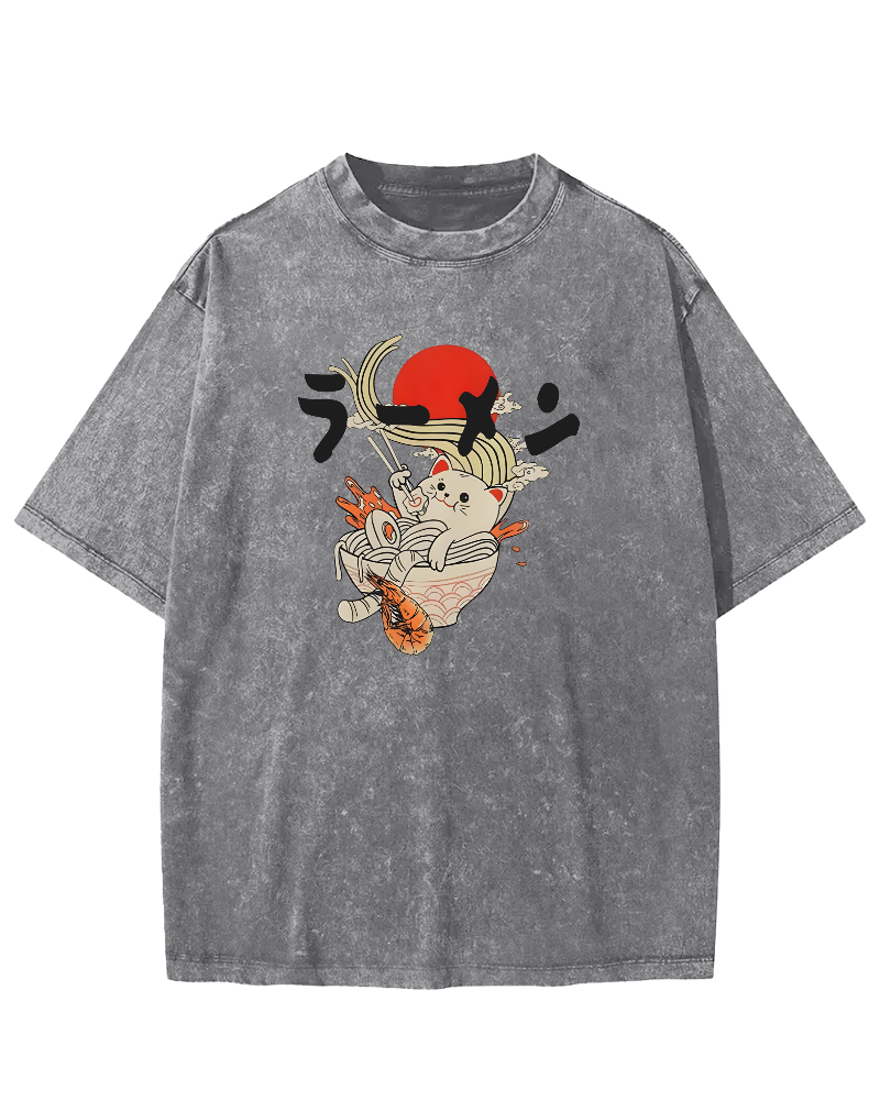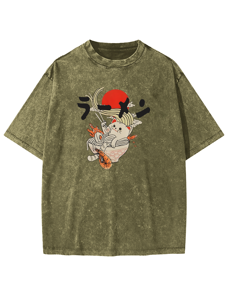 Lamian Noodles and Cat Art Vintage Washed T-shirt