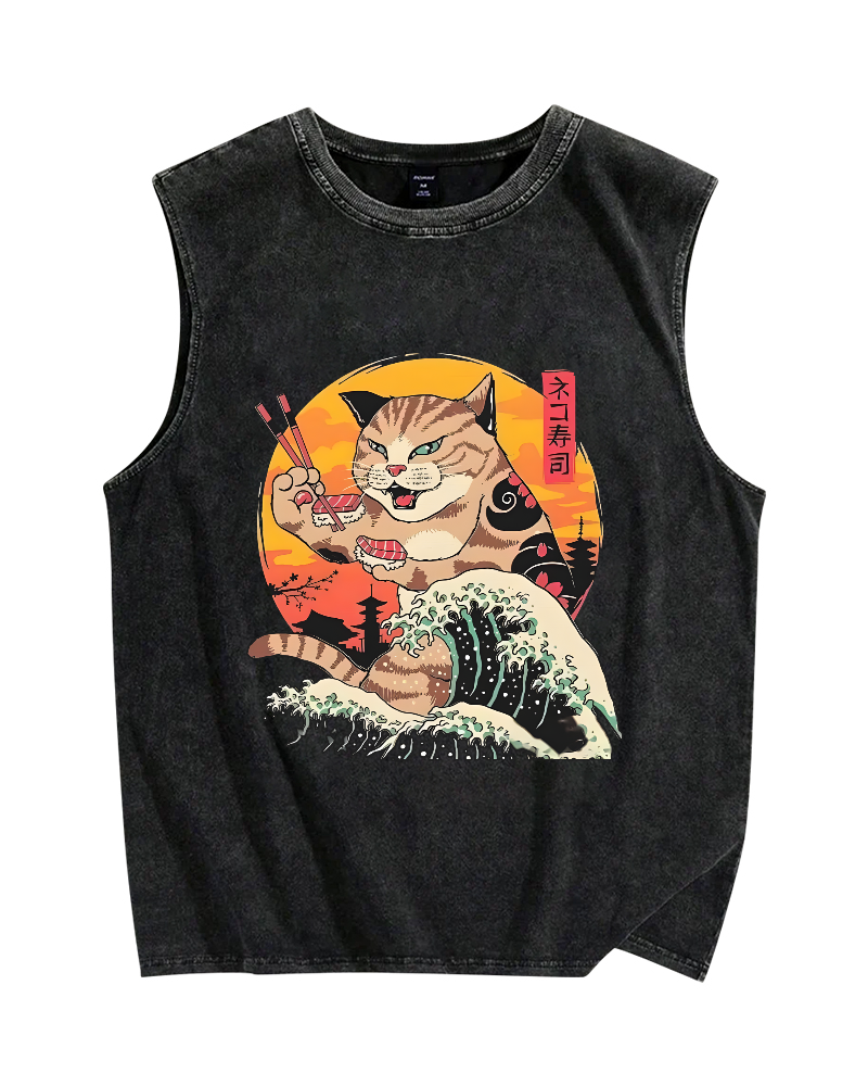 Cat Sushi Wave Vintage Distressed Washed Tank Top