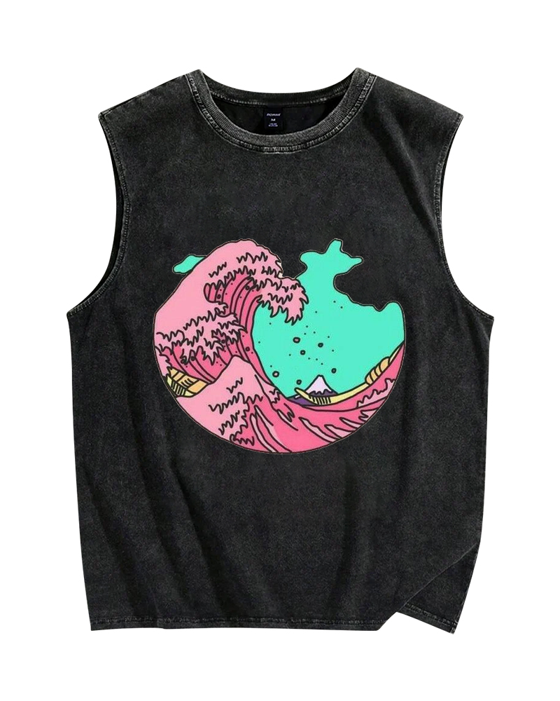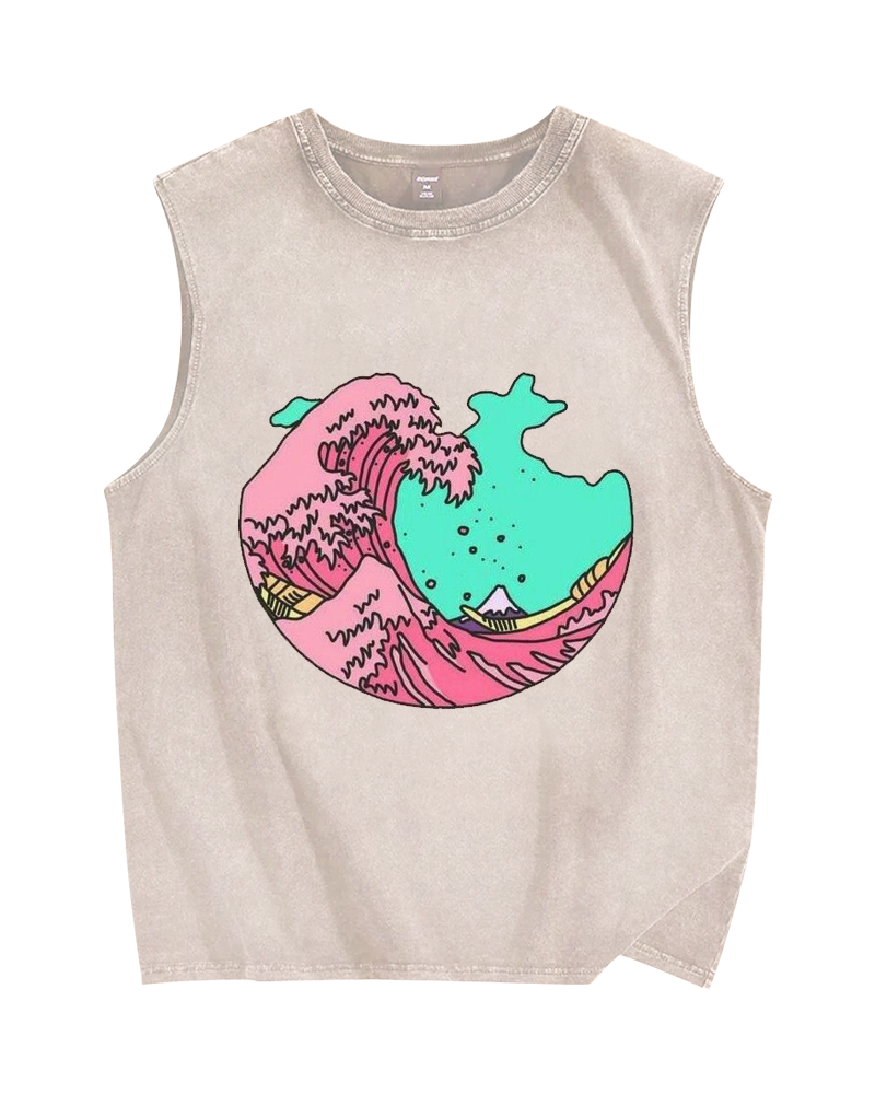 Pink waves of Kanagawa Vintage Distressed Washed Tank Top