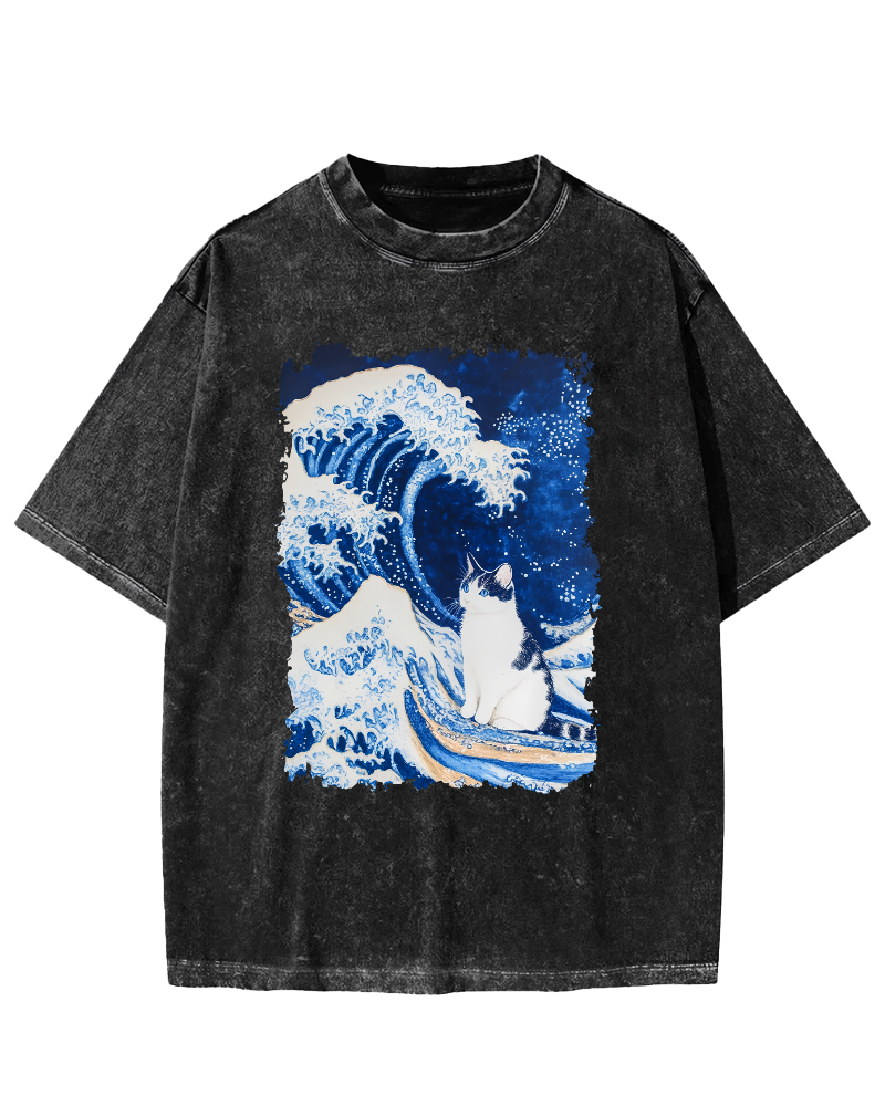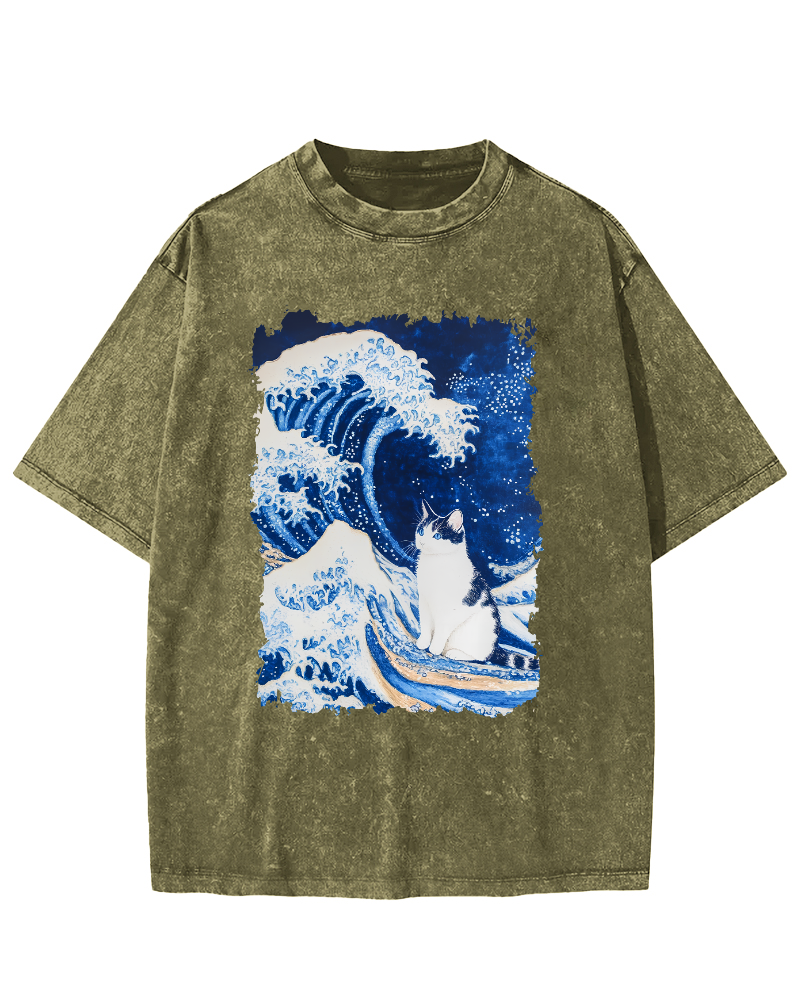 Giant Wave Japanese Cat Art Vintage Washed T-shirt