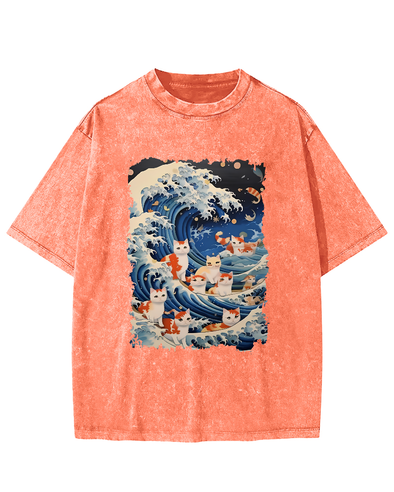 Waves and Cats in Japanese Art Vintage Washed T-shirt