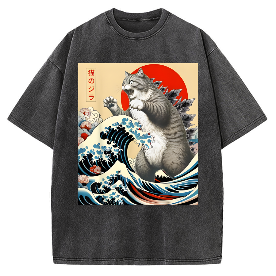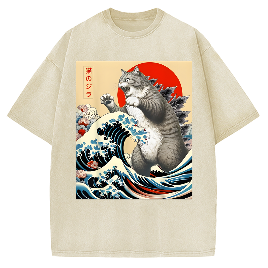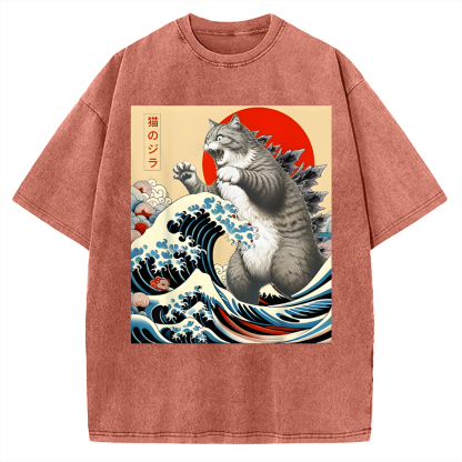 Catzilla Cat Japanese Art Funny Cat Vintage Washed T-shirt