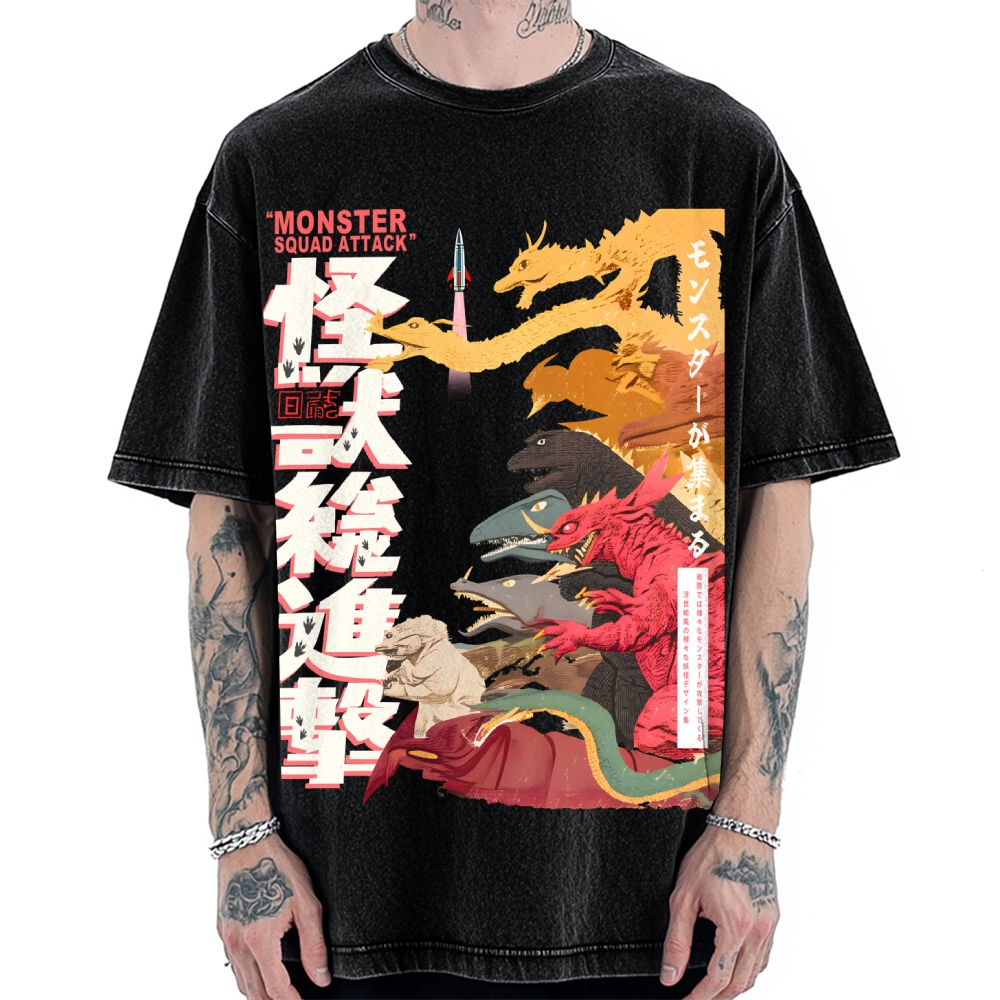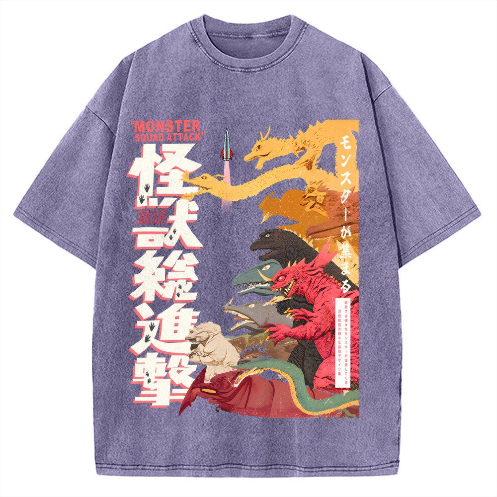 Monster Attacks Showa Retro Ukiyo-e Vintage Washed T-shirt