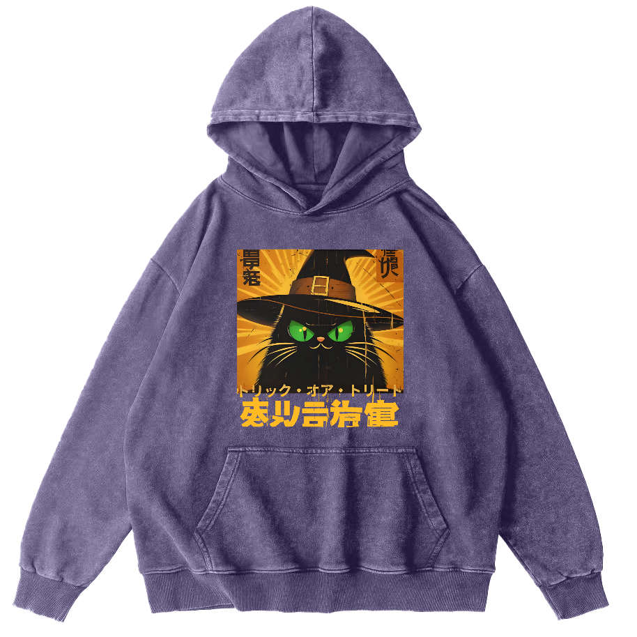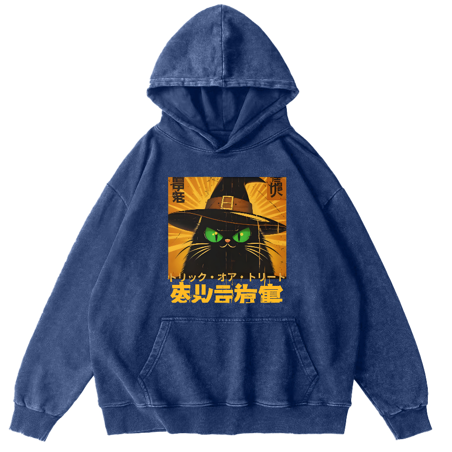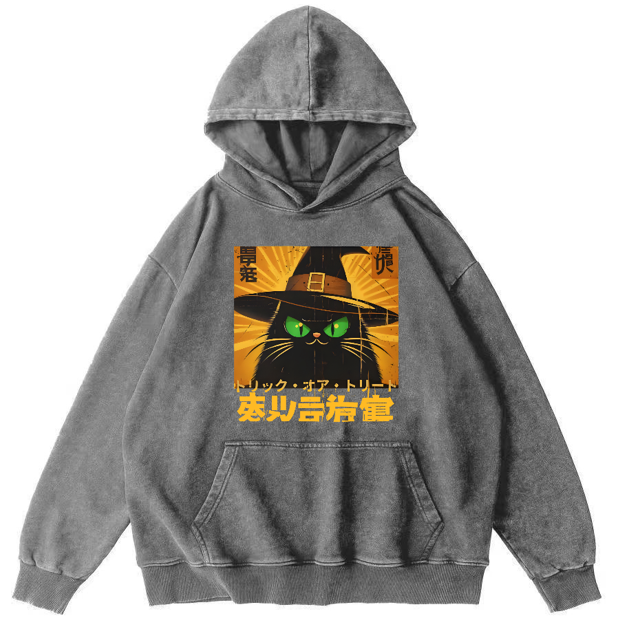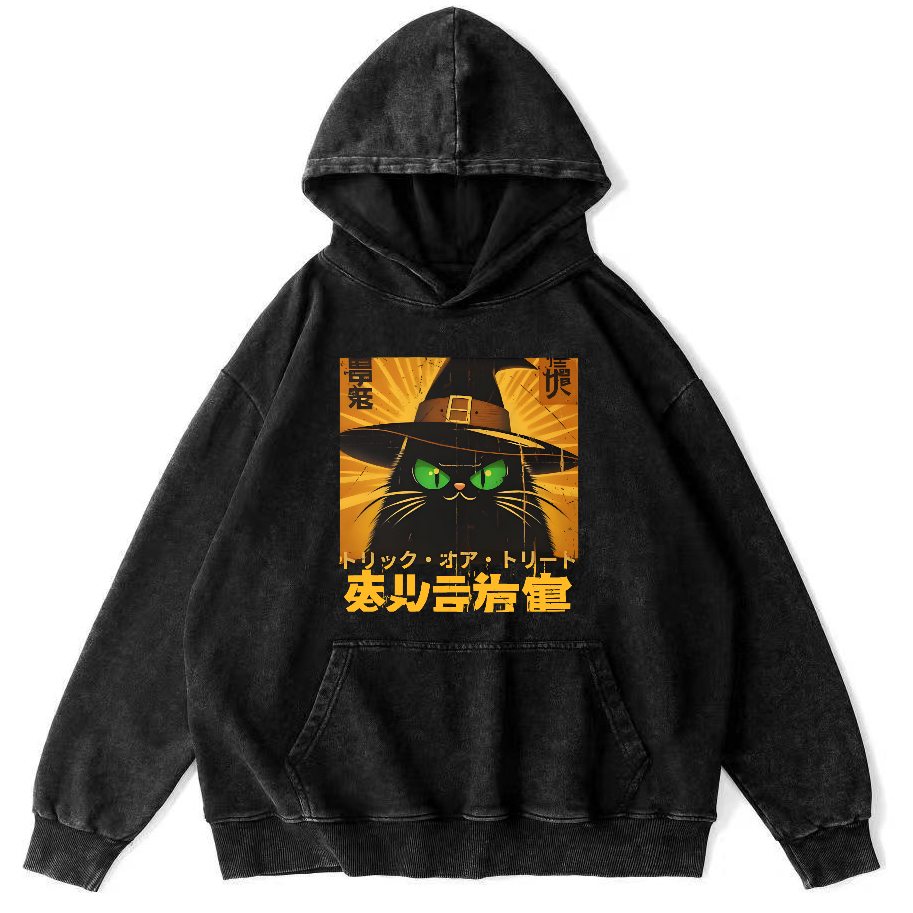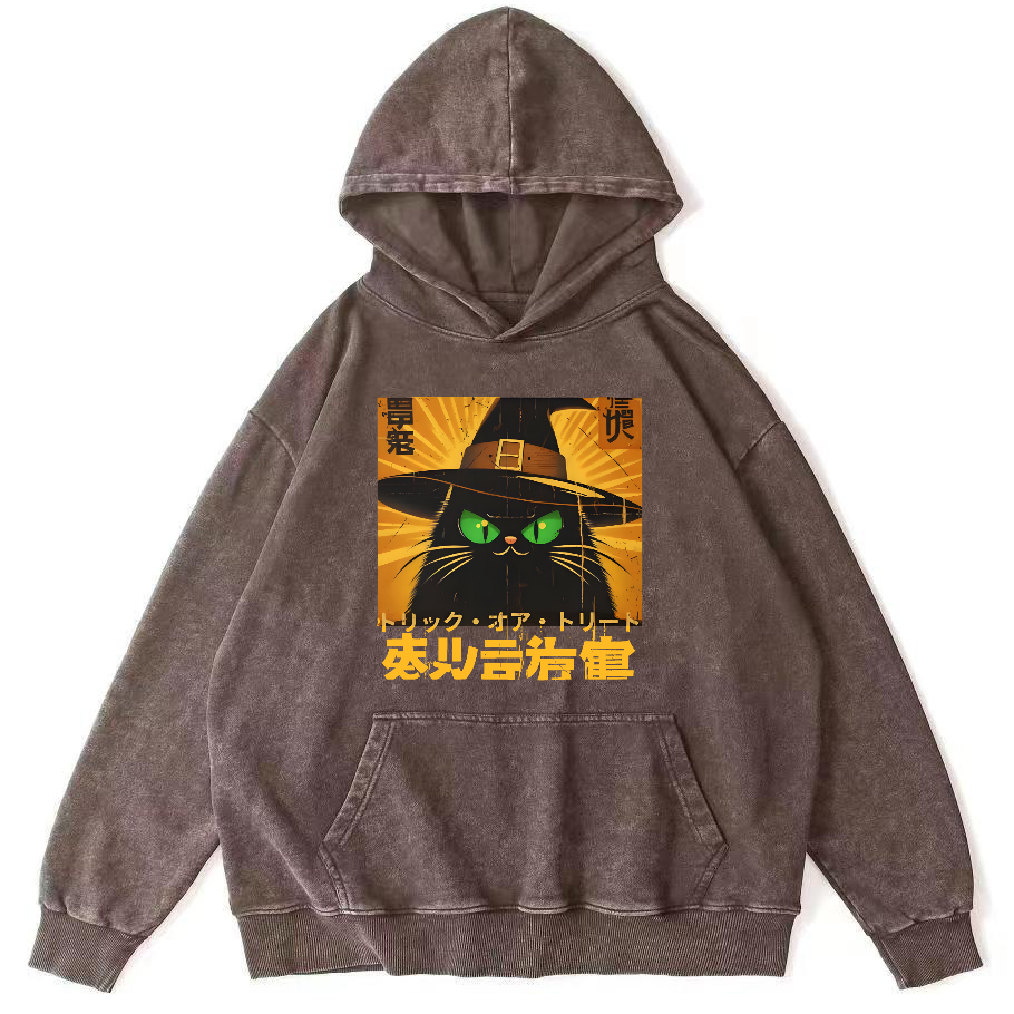 Retro Japanese Witch Cat Vintage Washed Hoodie
