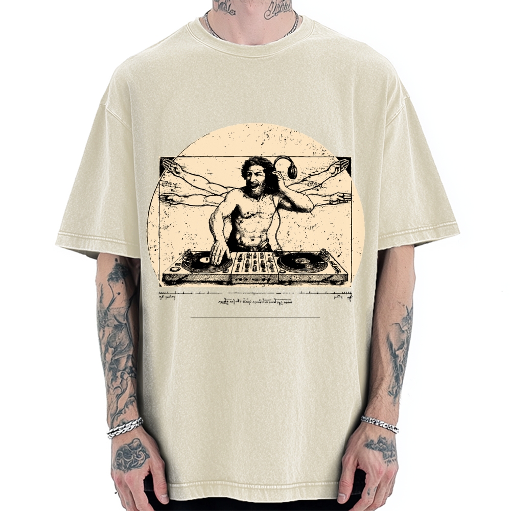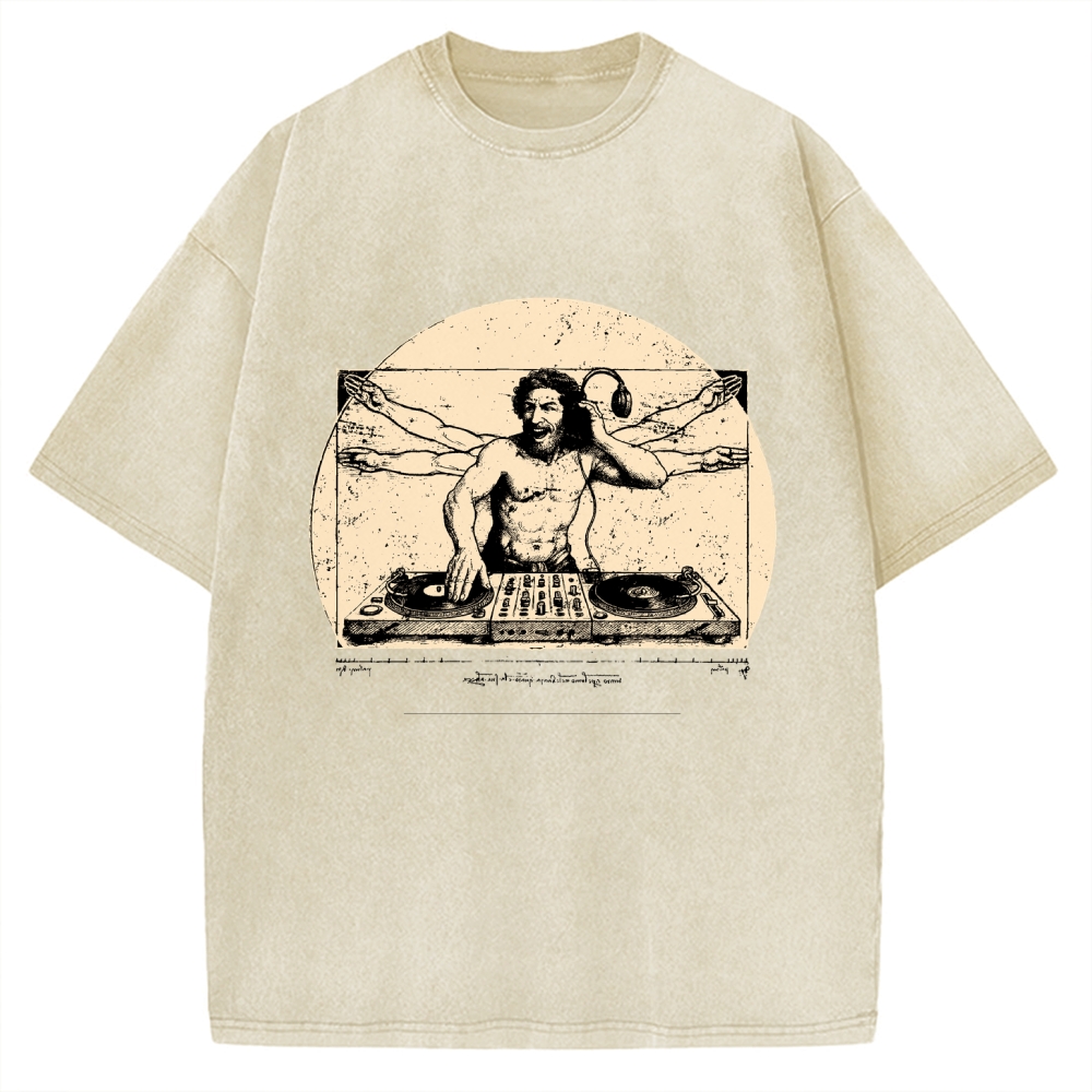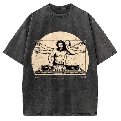 Vitruvian DJ T-Shirt Funny Da Vinci Music Mashup Vintage Washed T-shirt