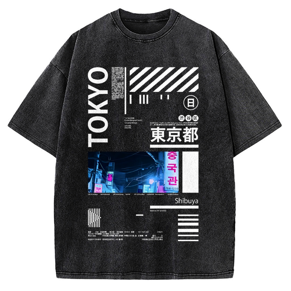 Night in Tokyo Street Front And Back Printing Washed T-shirt