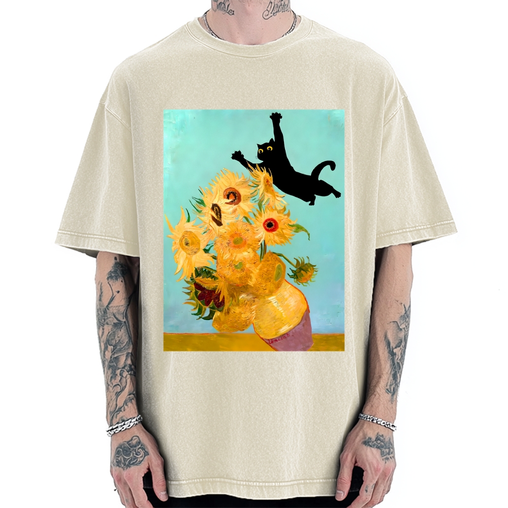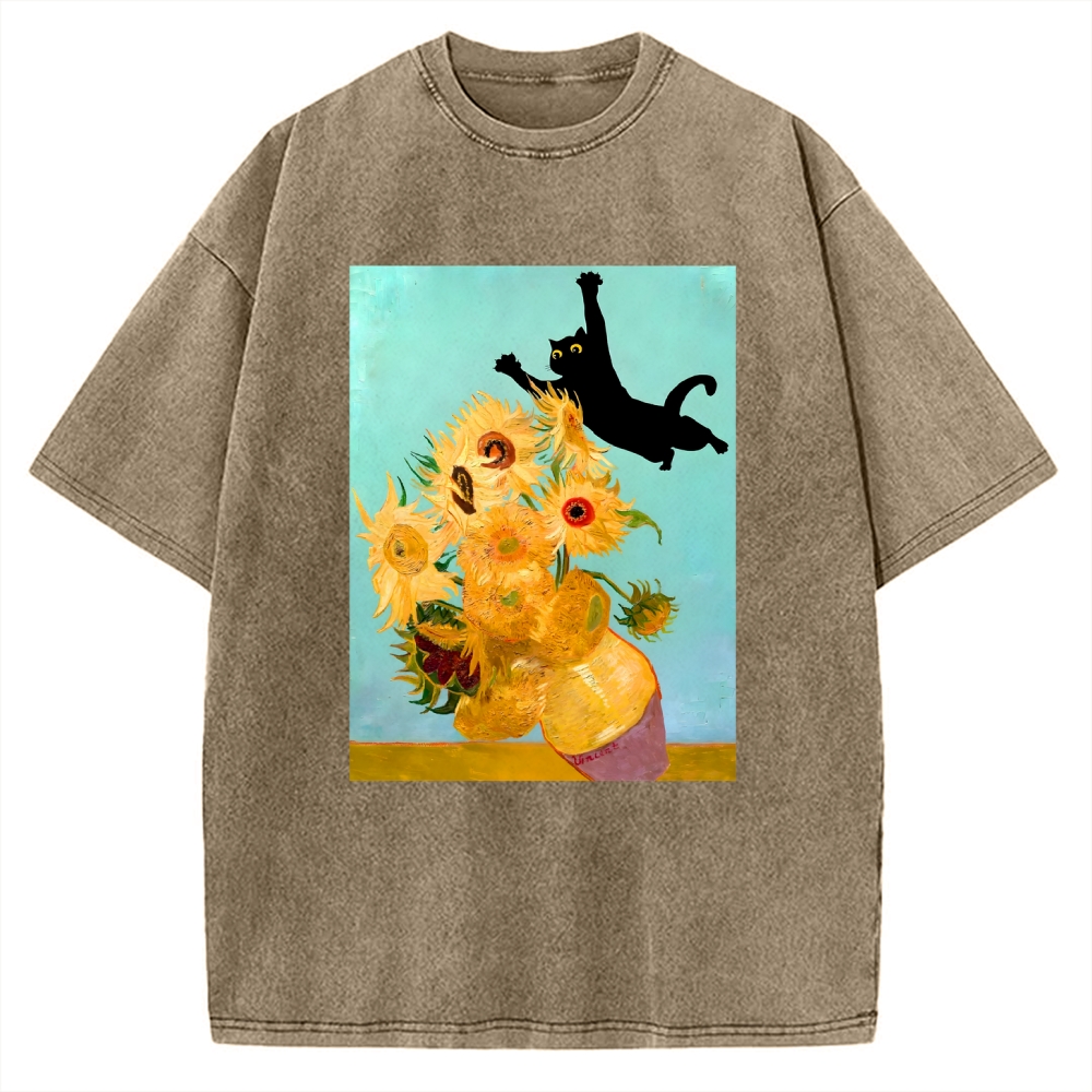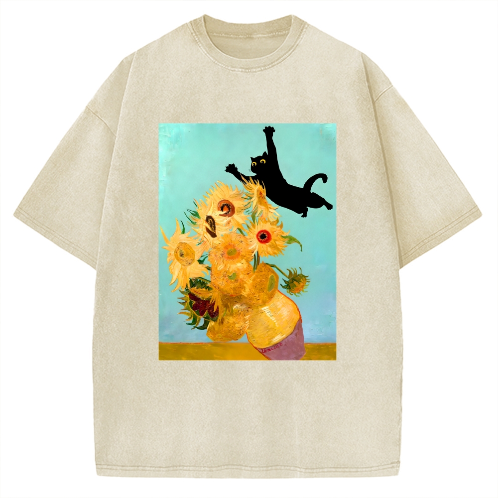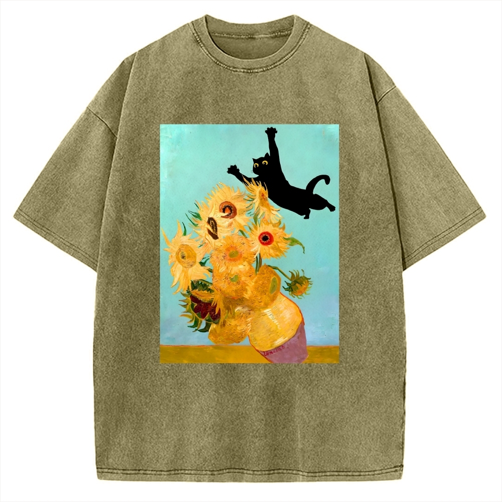 A Black Cat Accidentally Enters Van Gogh's Sunflower Painting. Vintage Washed T-shirt