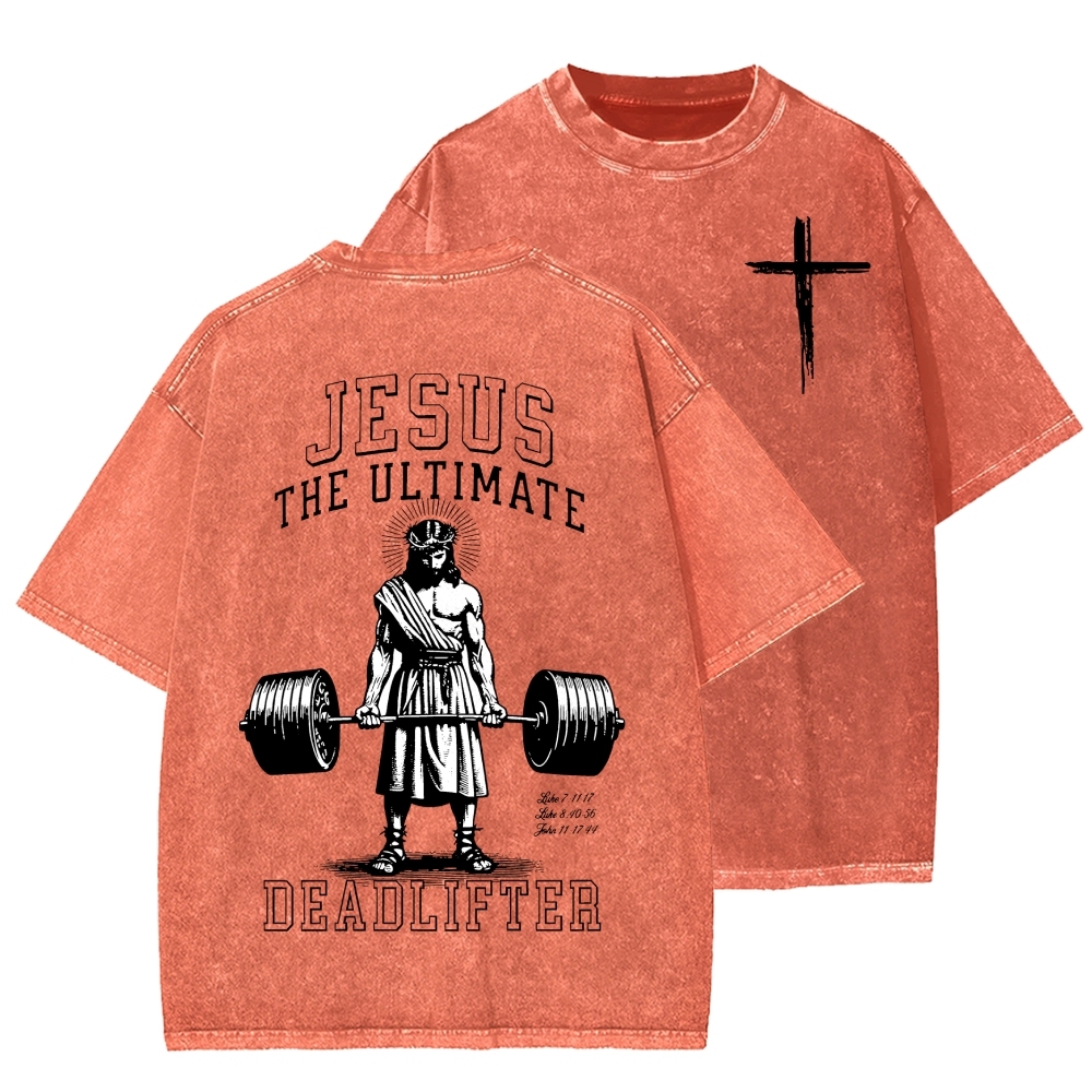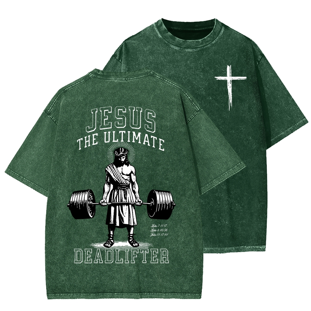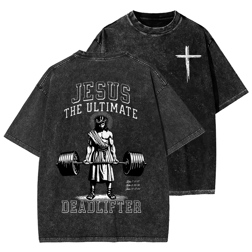 Jesus The Ultimate Deadlifter Christian Front And Back Printing Washed T-shirt