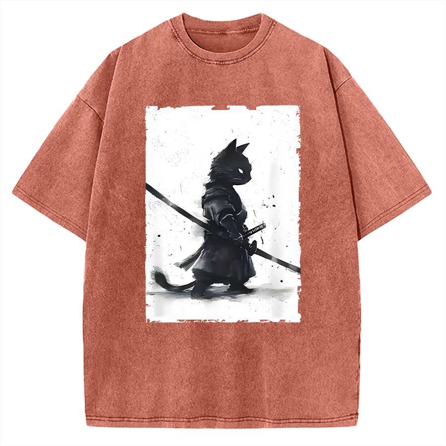 Retro Cat Samurai Japanese Vintage Washed T-shirt