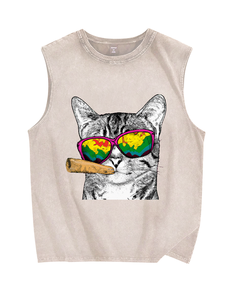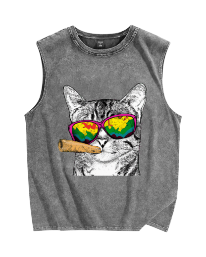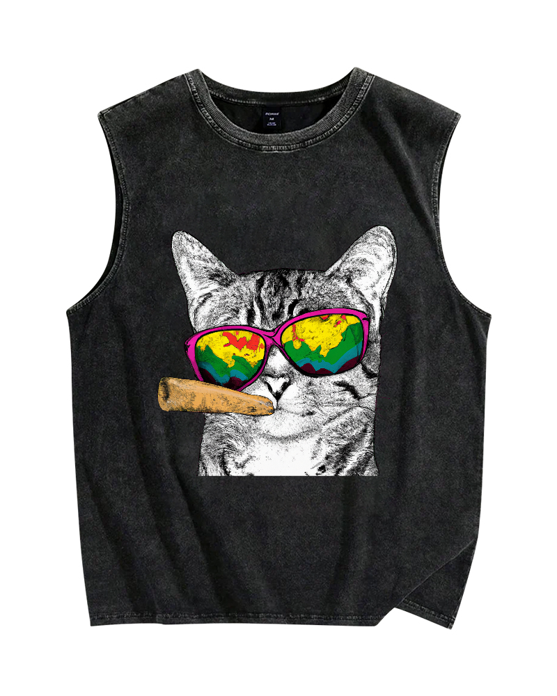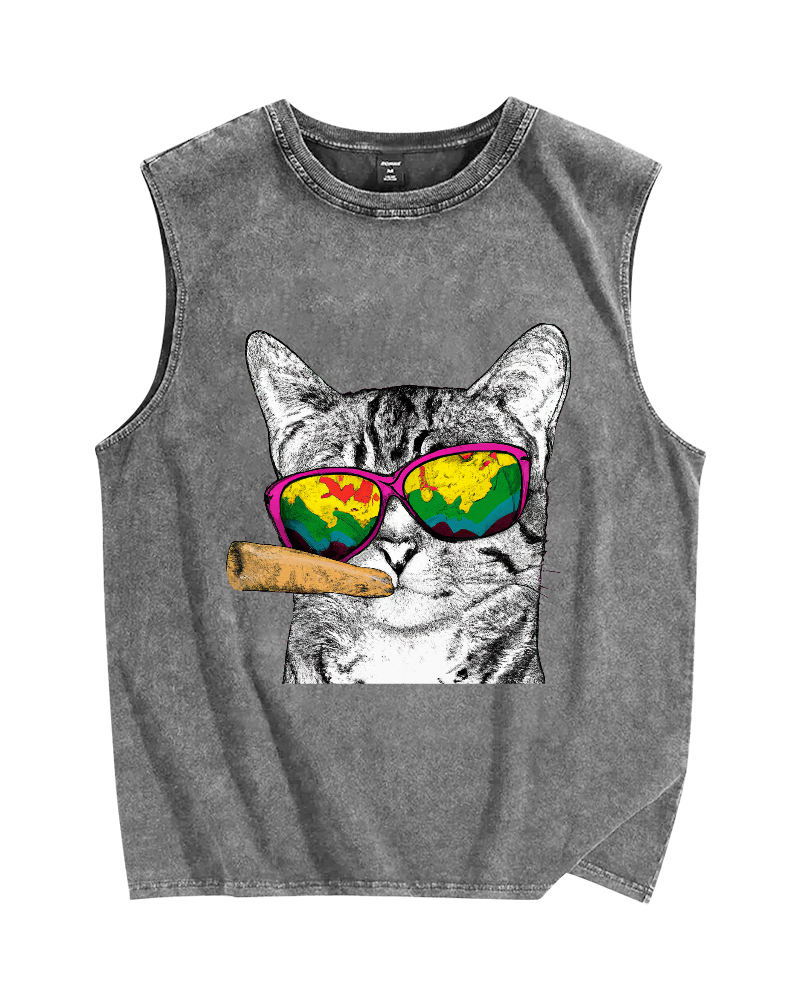 Smoking Cat Vintage Distressed Washed Tank Top
