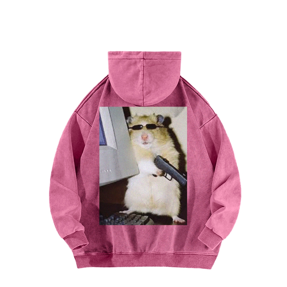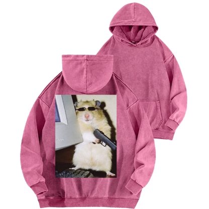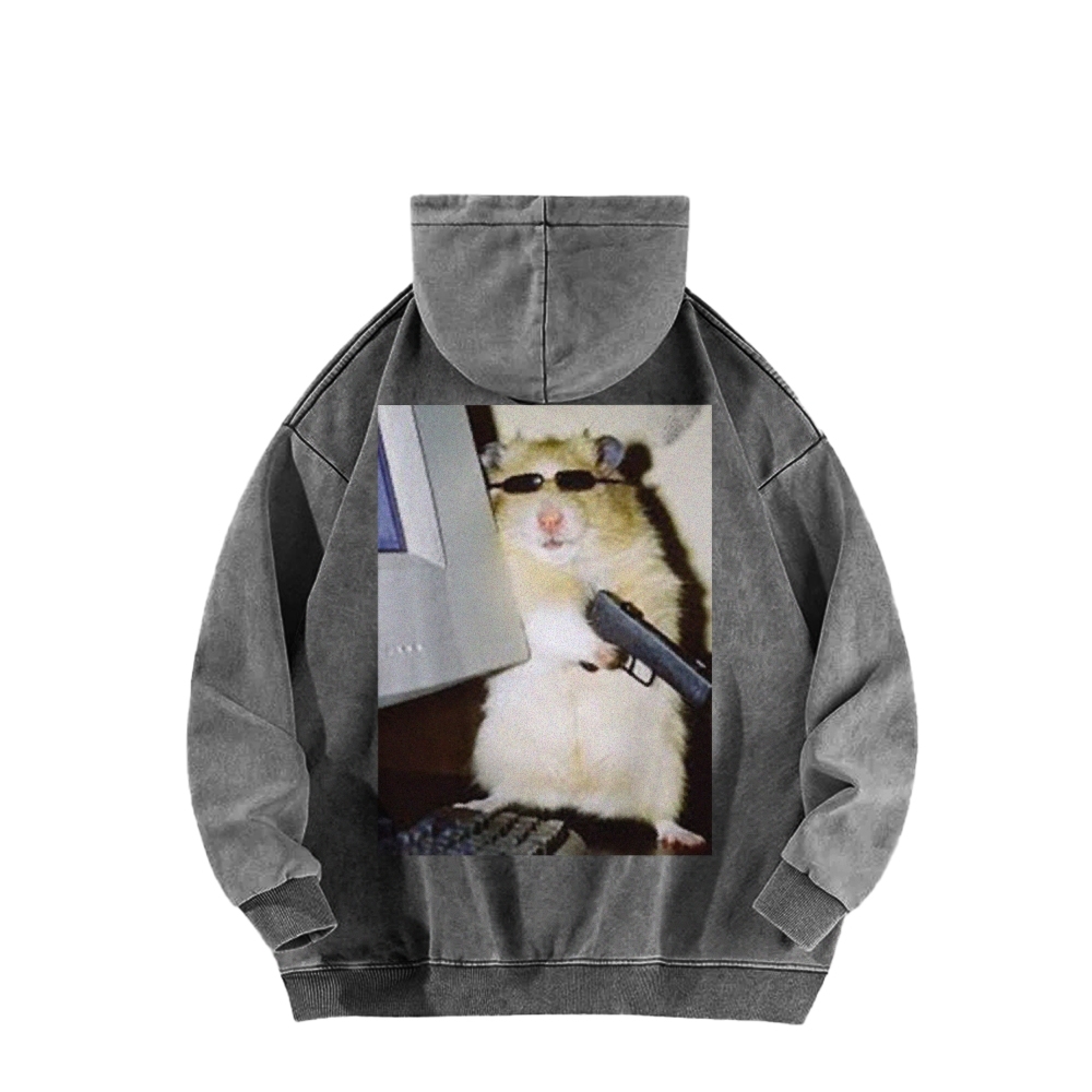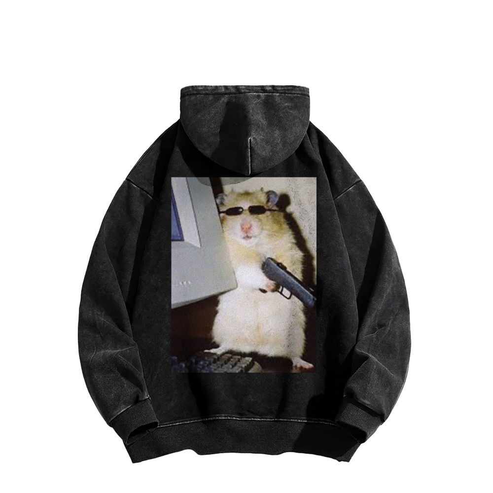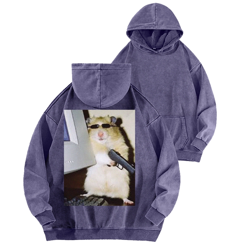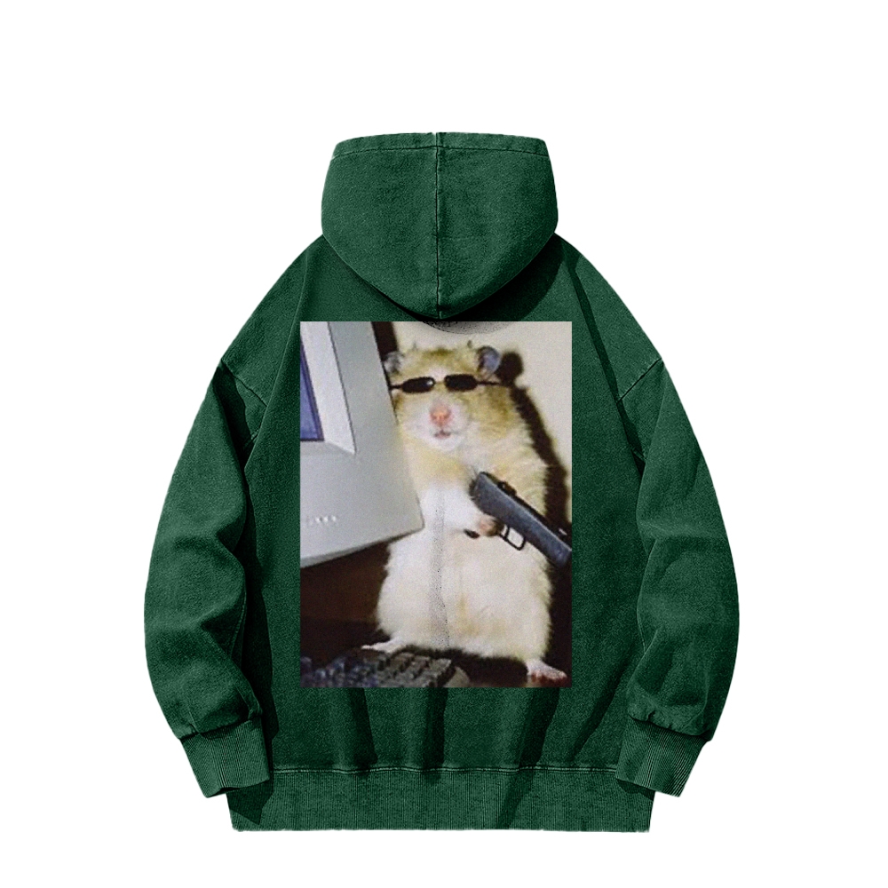 Sunglasses Killer Rat Funny Gunman Back Printing Vintage Washed Hoodie