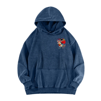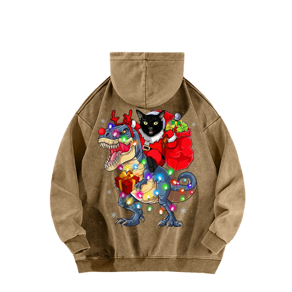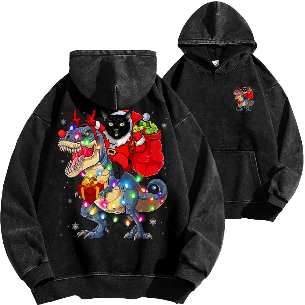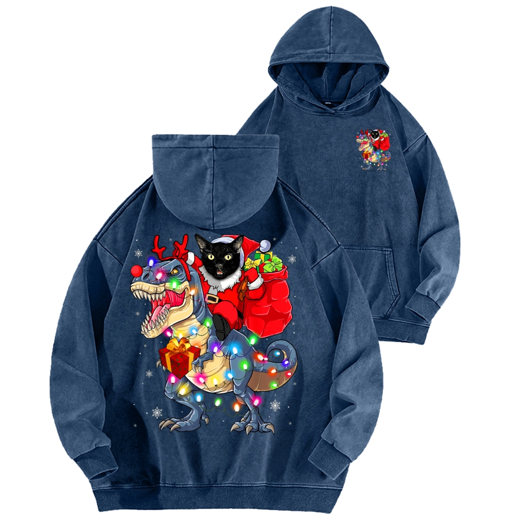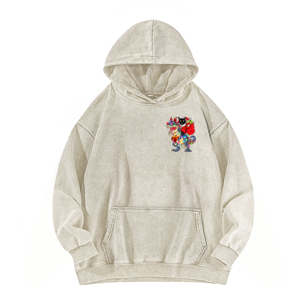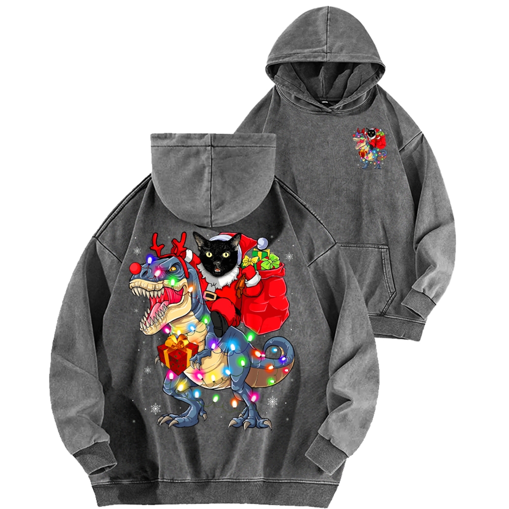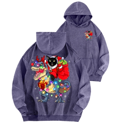 Cat Riding A Dinosaur T Rex Christmas Front And Back Printing Vintage Washed Hoodie