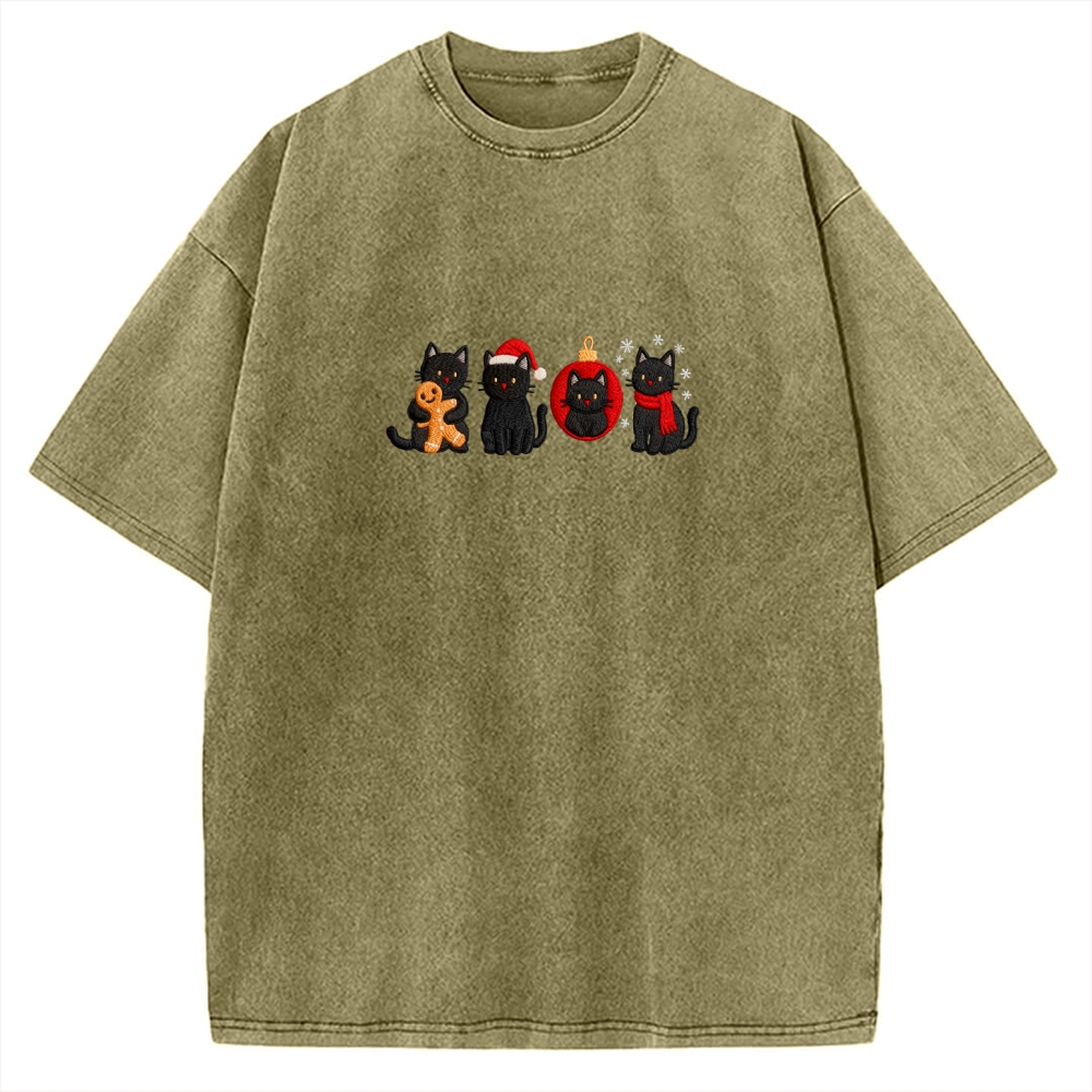 Christmas Black Cat Embroidery Vintage Washed T-shirt