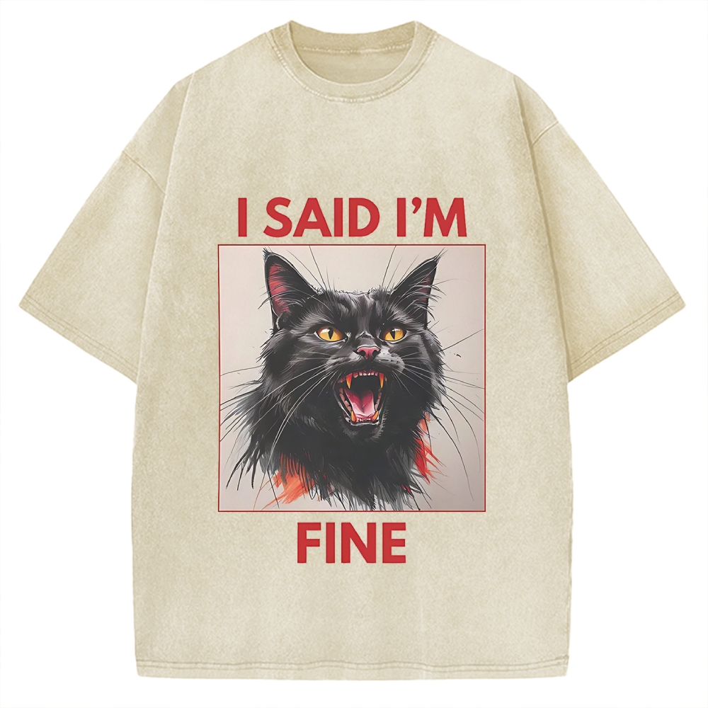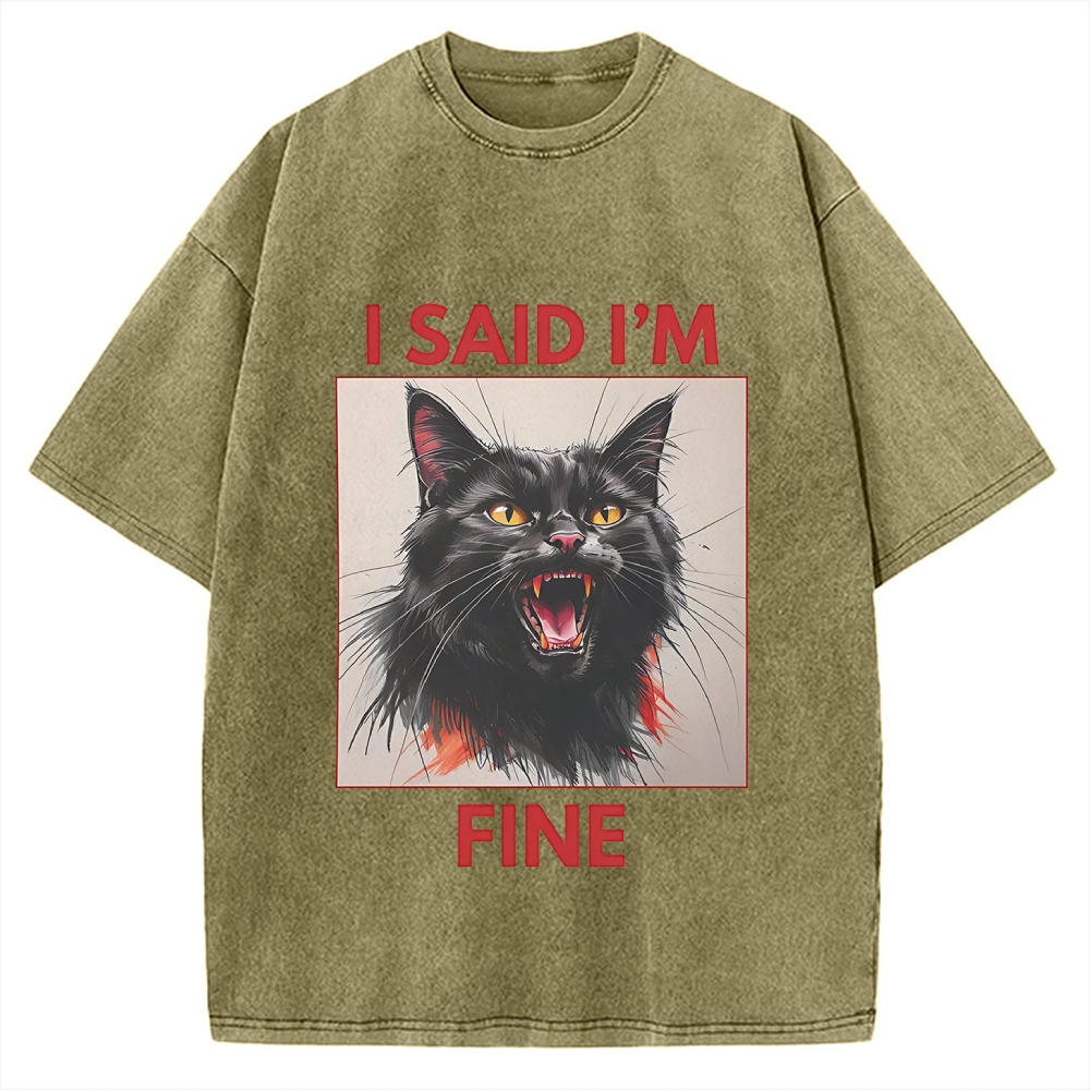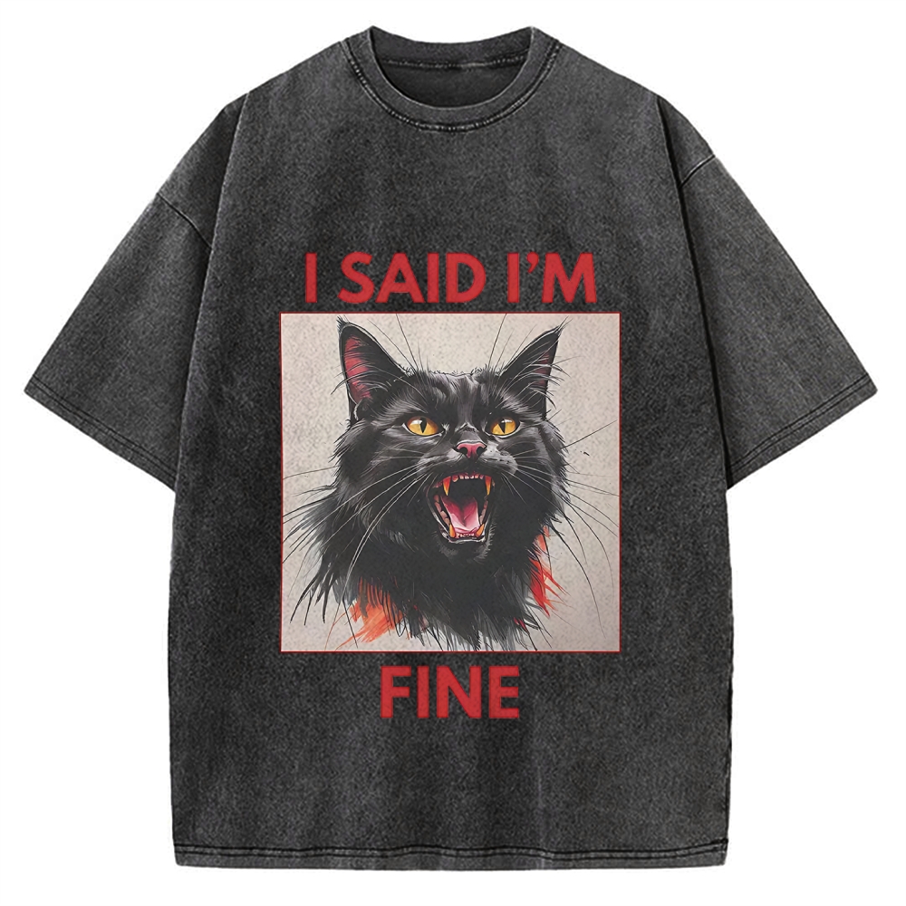 Distressed Black Cat I SAID I'M FINE! Meme Vintage Washed T-shirt