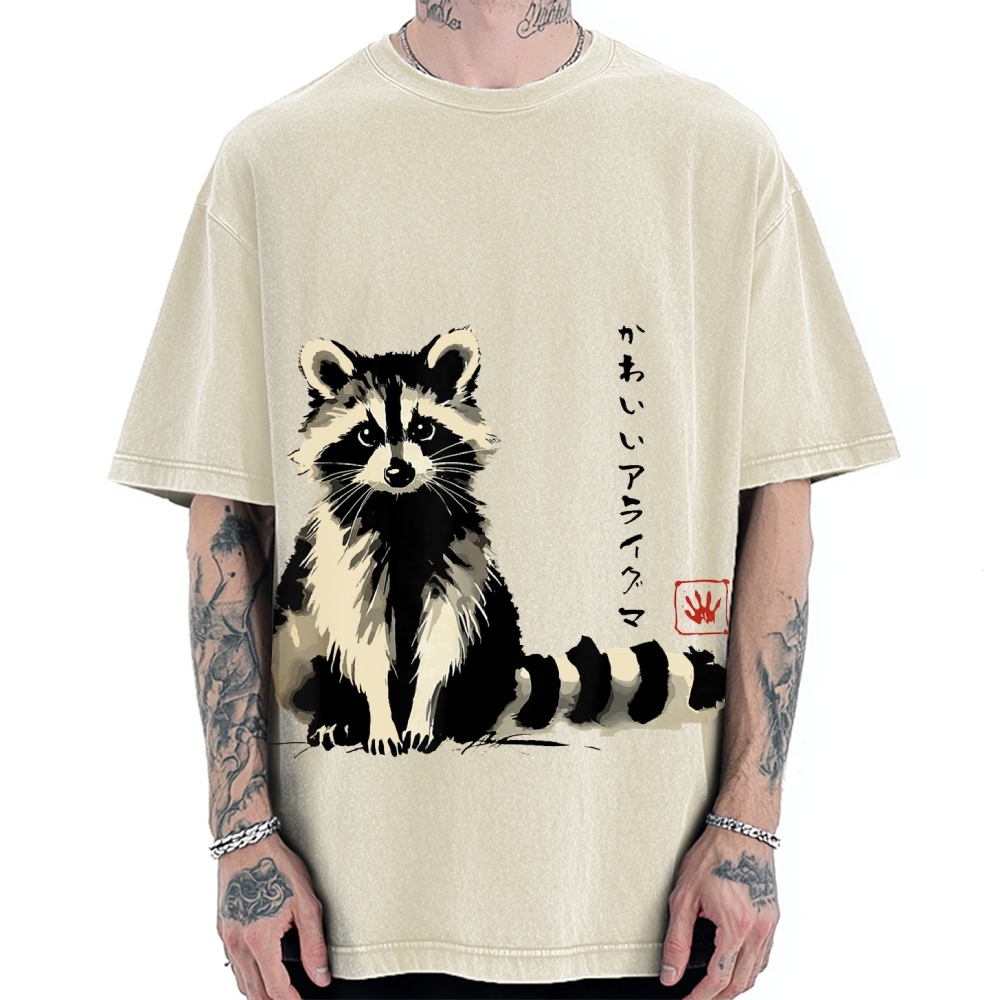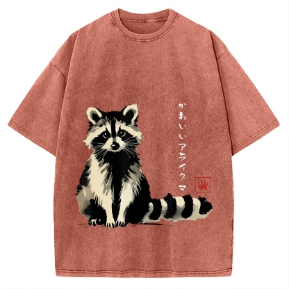 Kawaii Raccoon Anime Japanese Ink Style Funny Raccoon Vintage Washed T-shirt