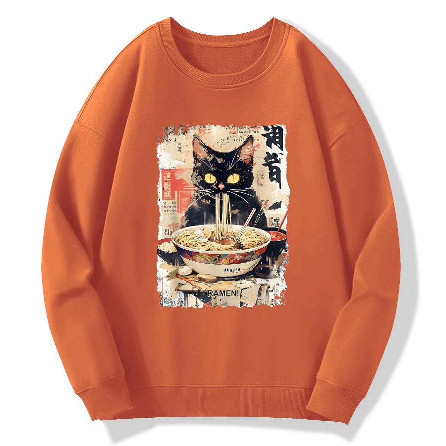 The retro style black cat likes to eat Lamian Noodles Cotton Pullover Sweatshirt