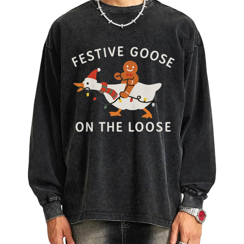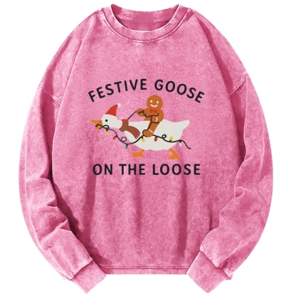 Festive Goose On The Loose Funny Christmas Vintage Washed Sweatshirts
