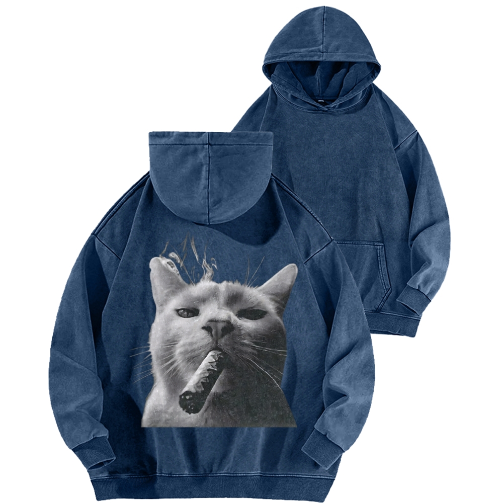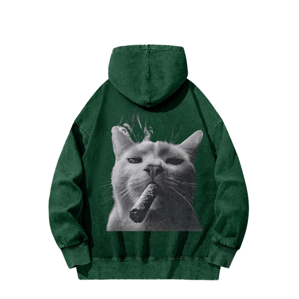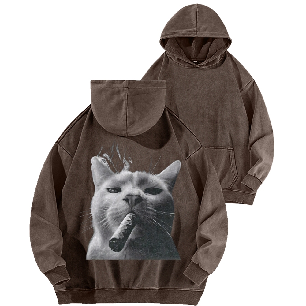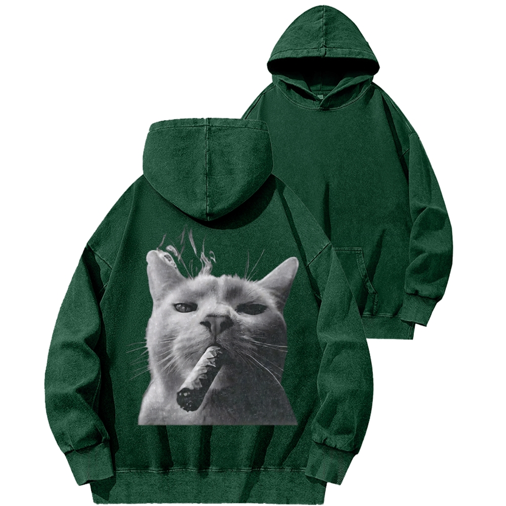 Bossy Cat Smoking Cigar Front And Back Printing Vintage Washed Hoodie