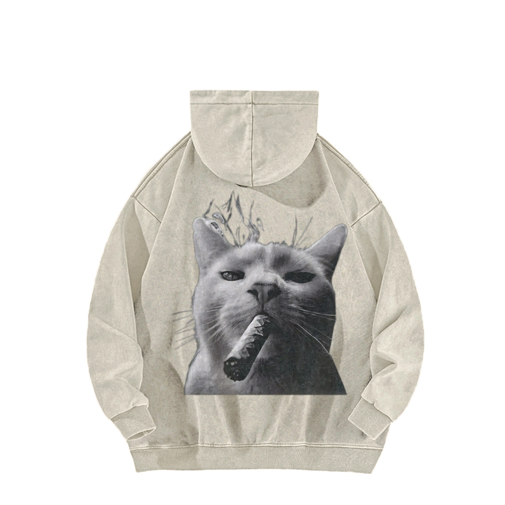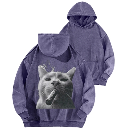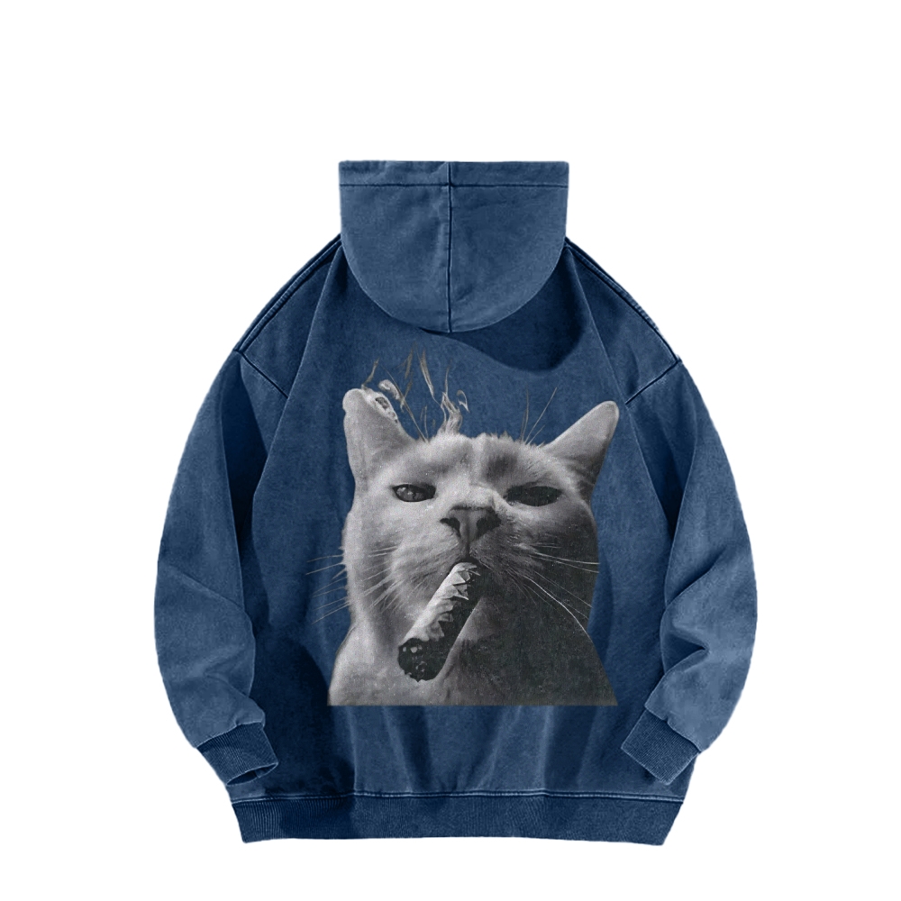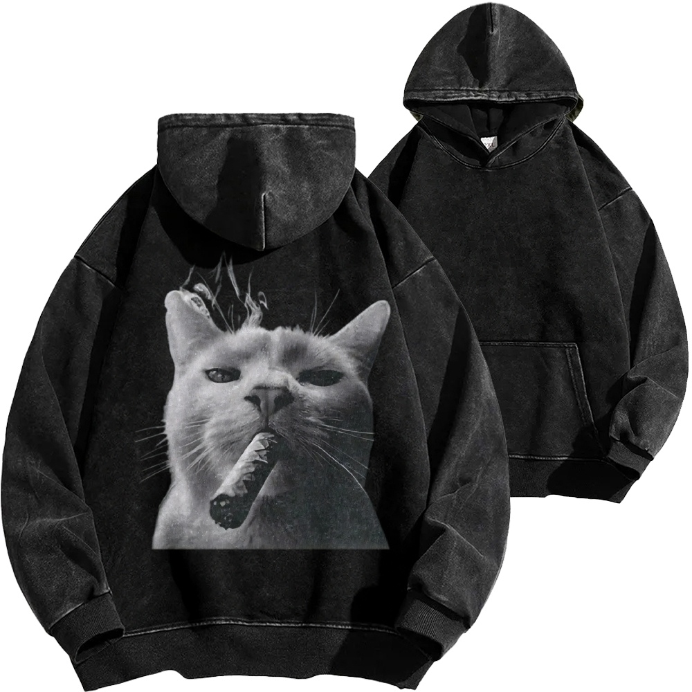 Bossy Cat Smoking Cigar Front And Back Printing Vintage Washed Hoodie