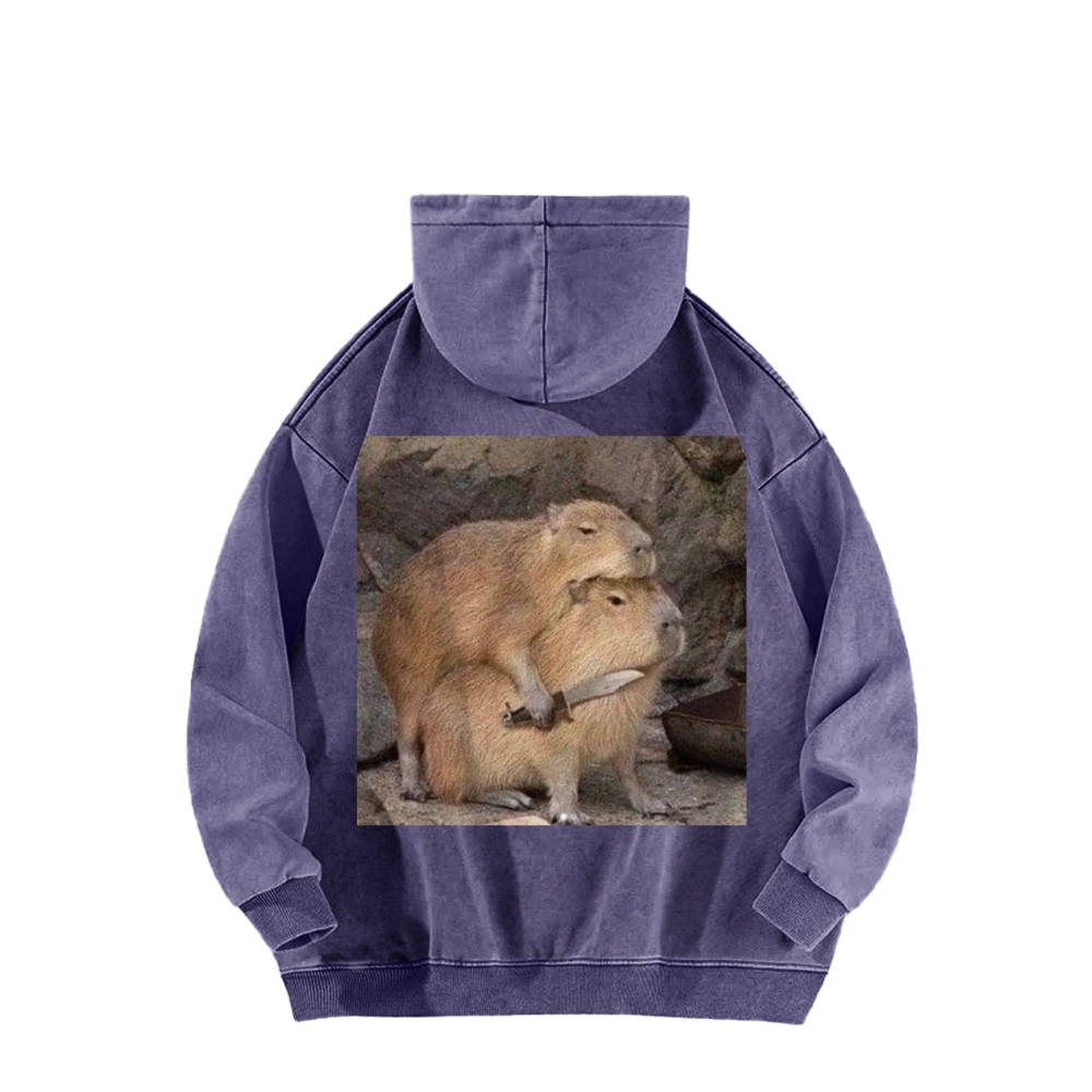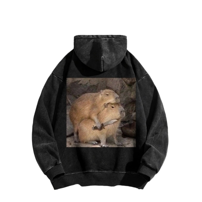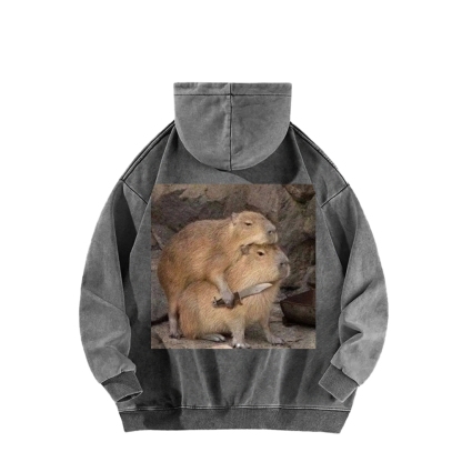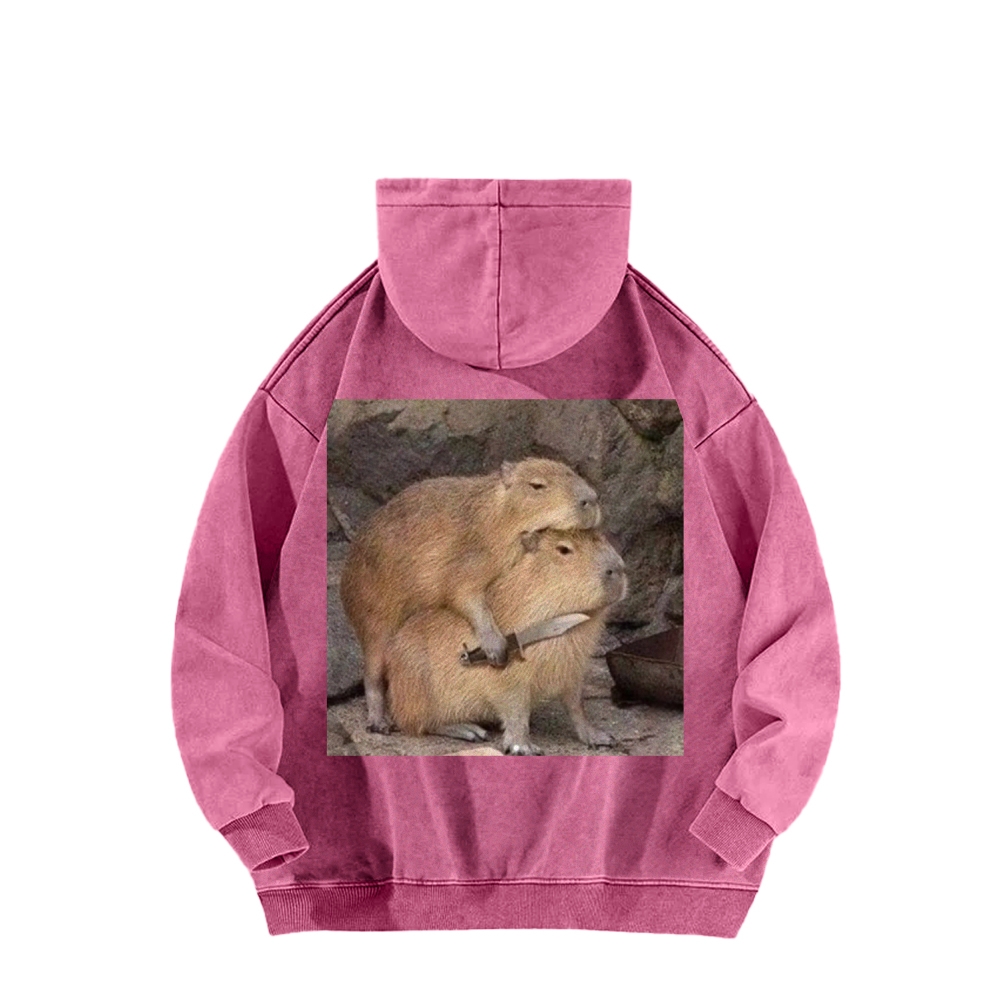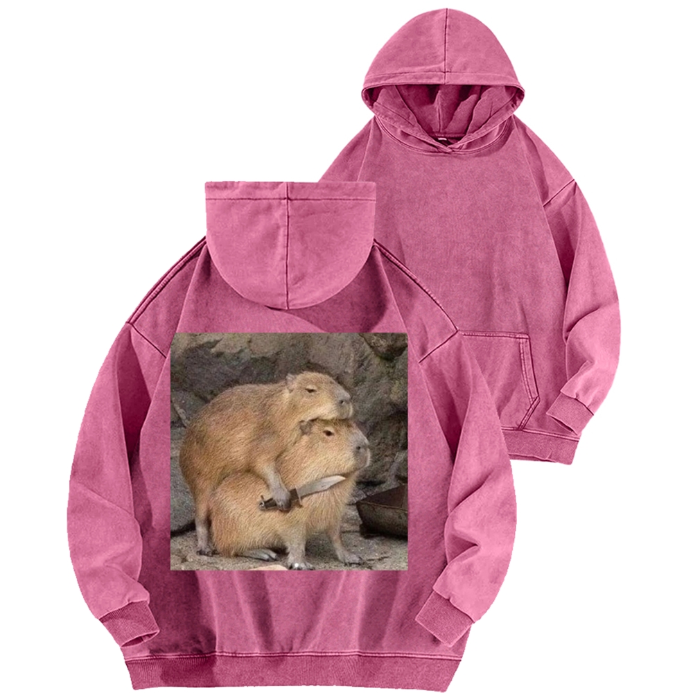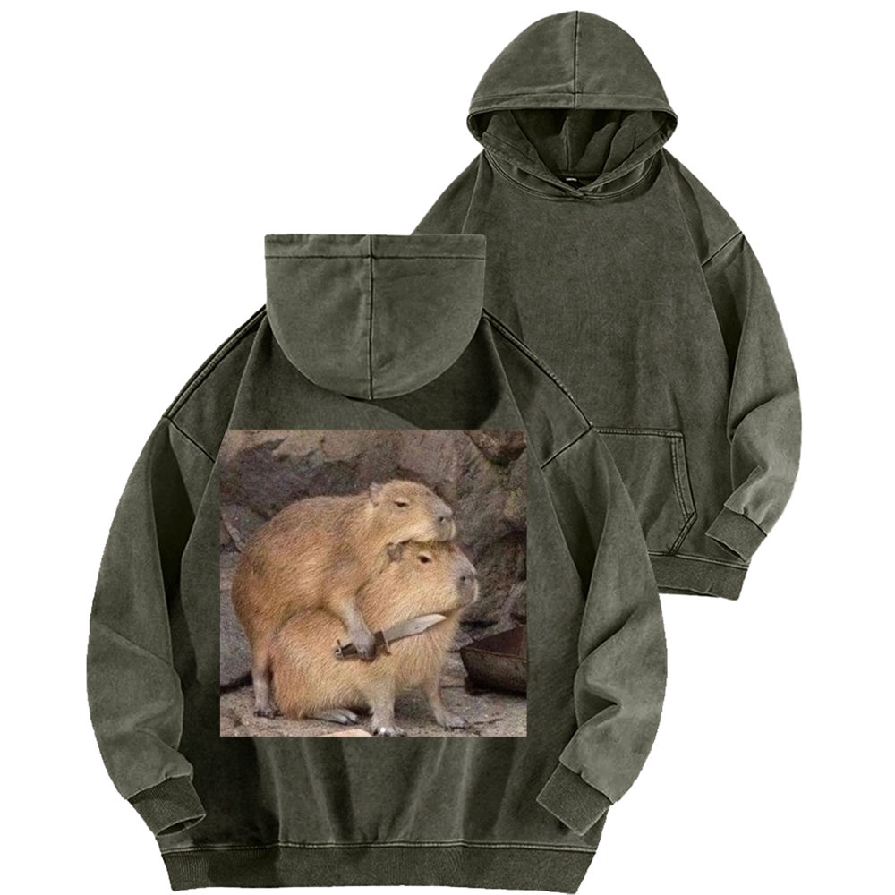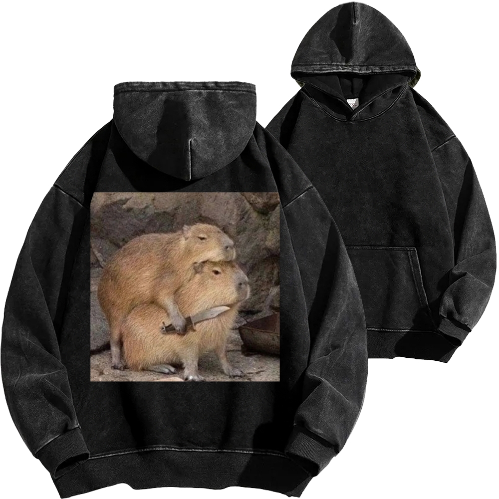 Capybara Killer Funny Back Printing Vintage Washed Hoodie