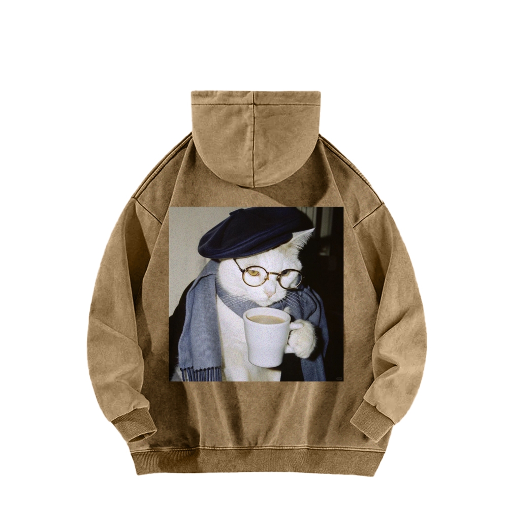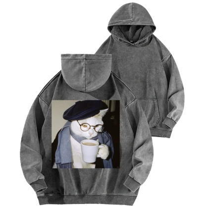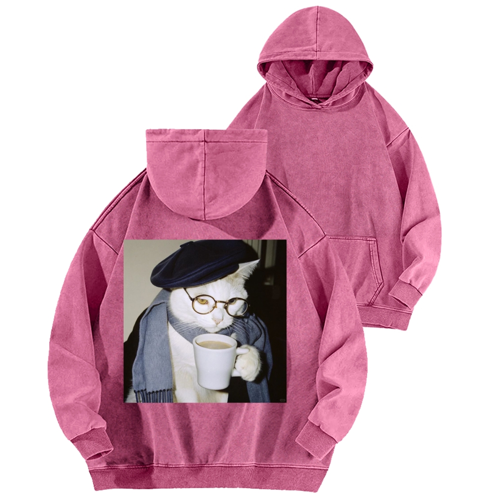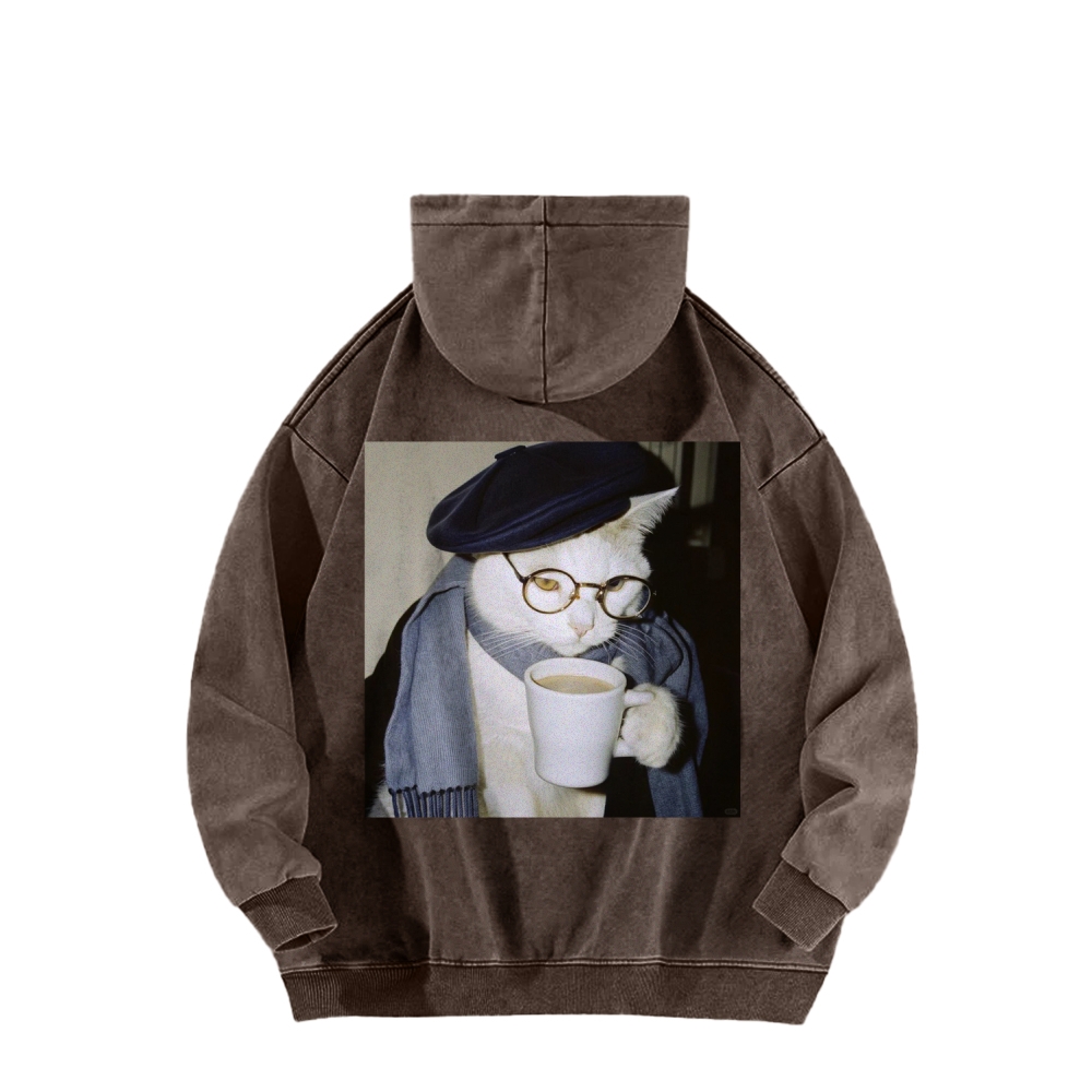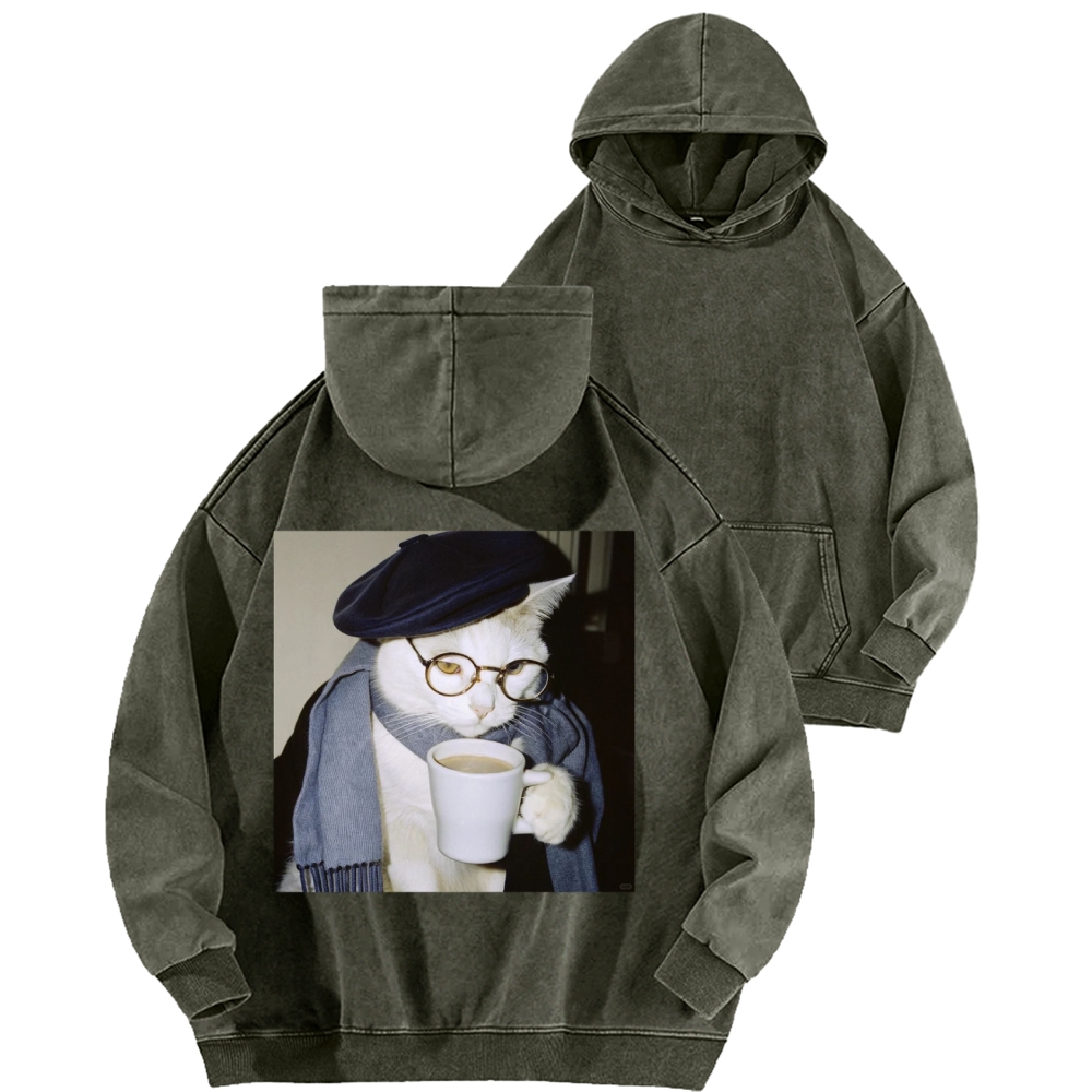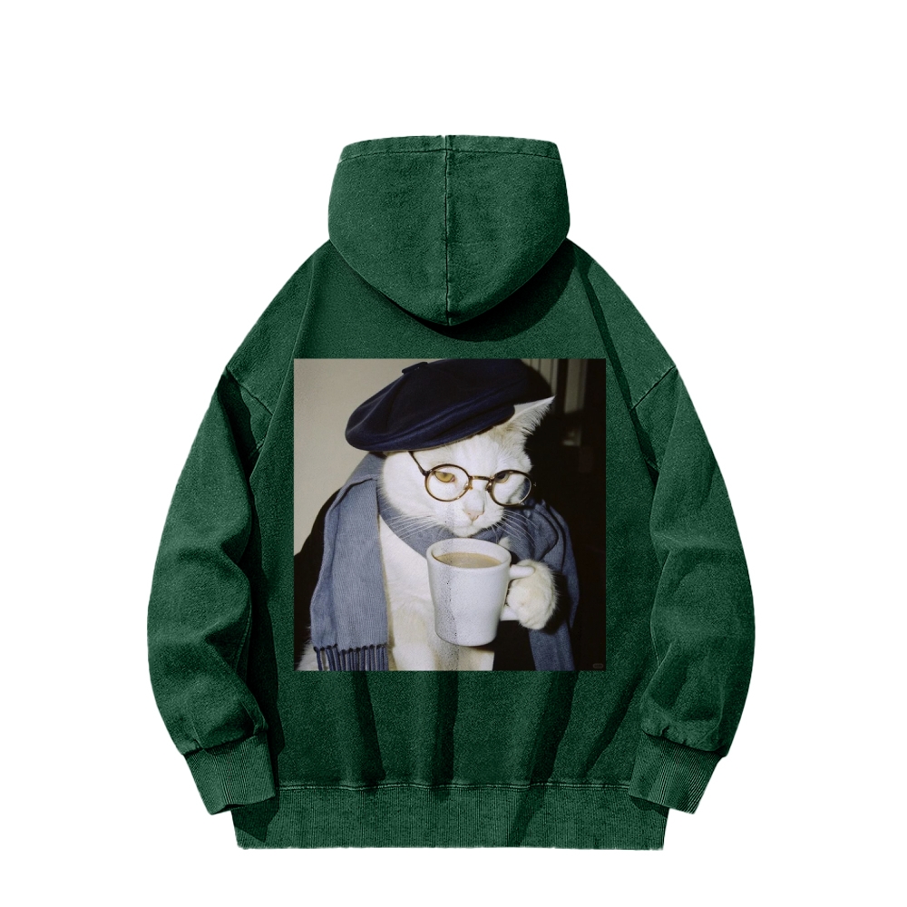 Coffee Cat Back Printing Vintage Washed Hoodie