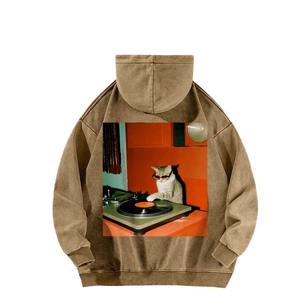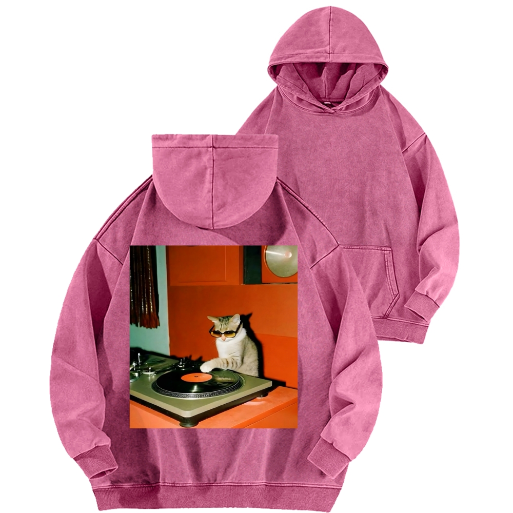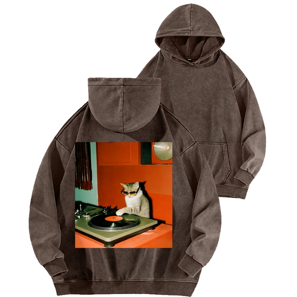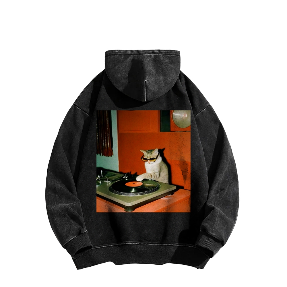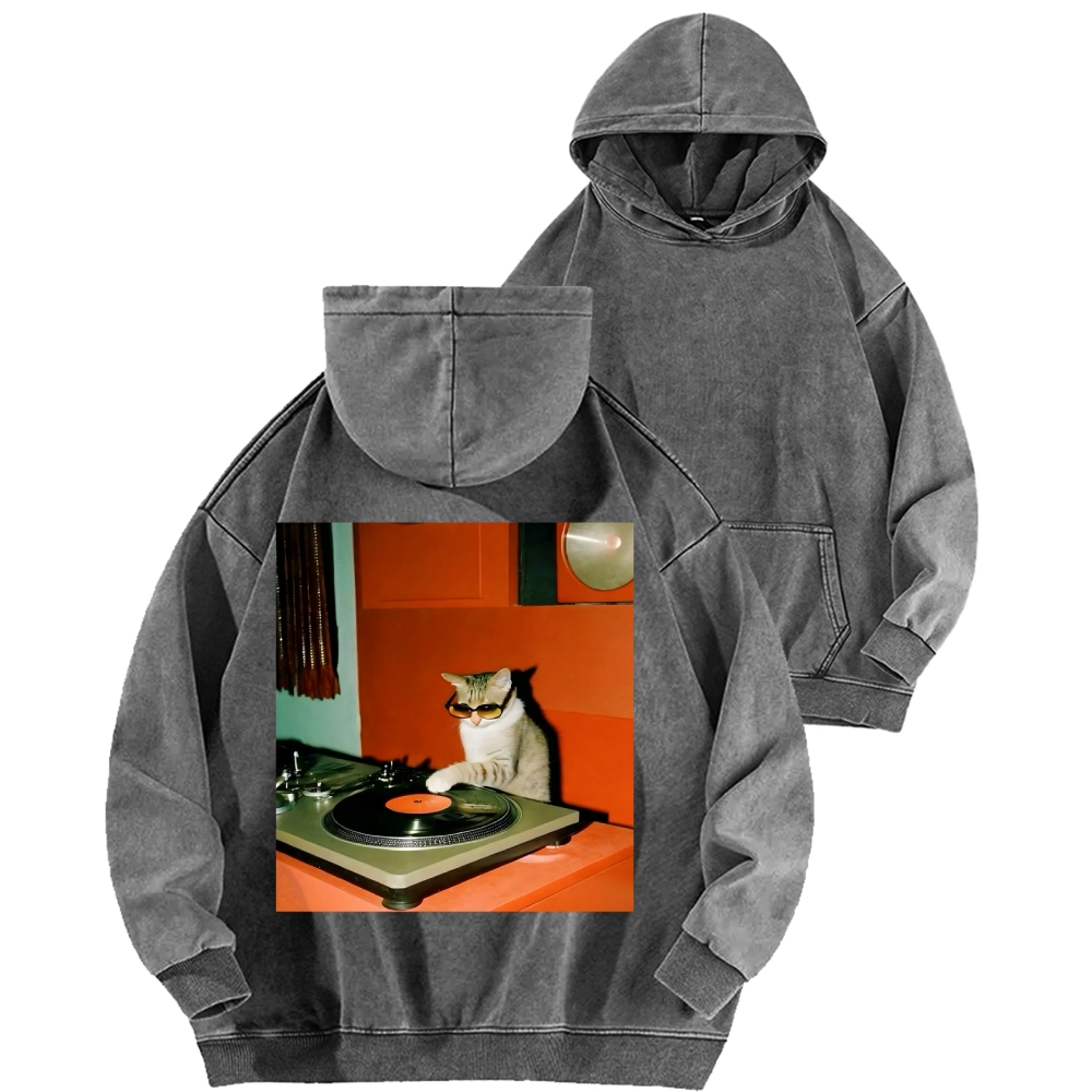 Funny Cat DJ Meme Back-printed Vintage Washed Hoodie