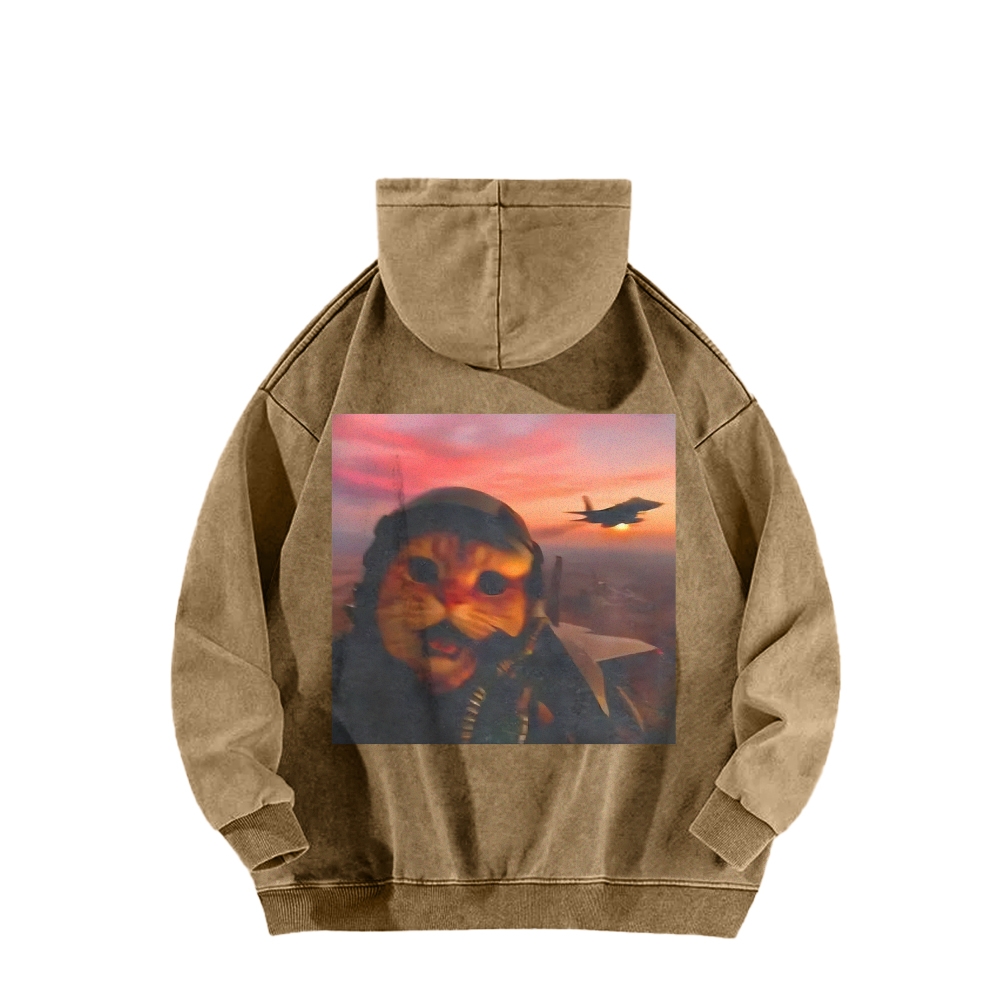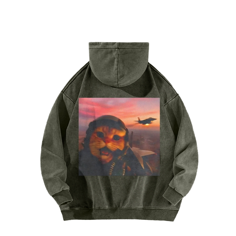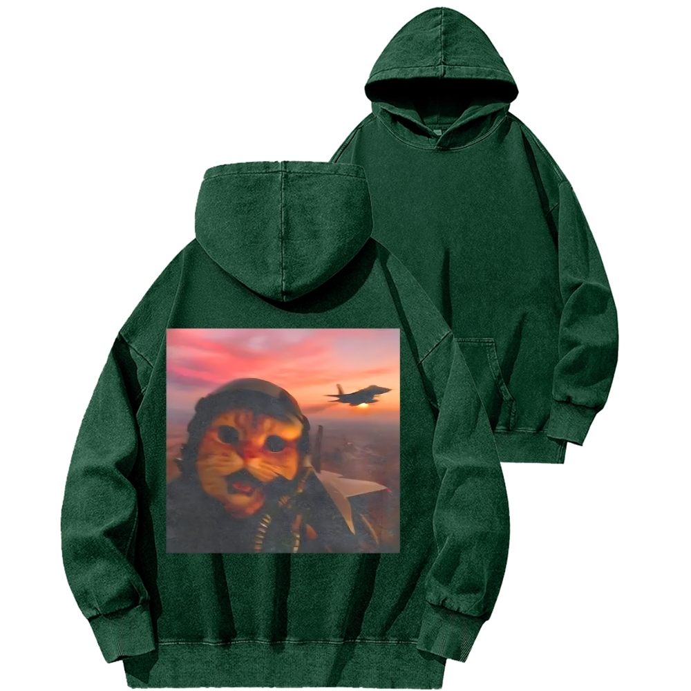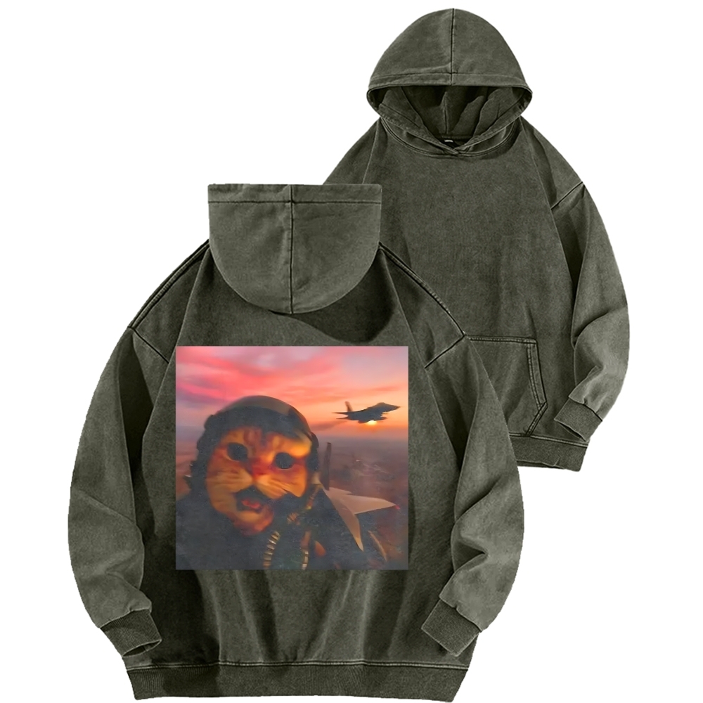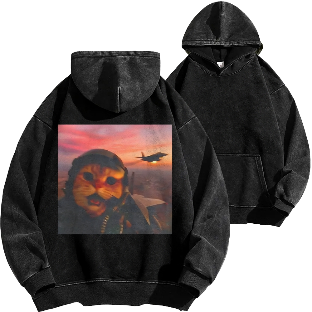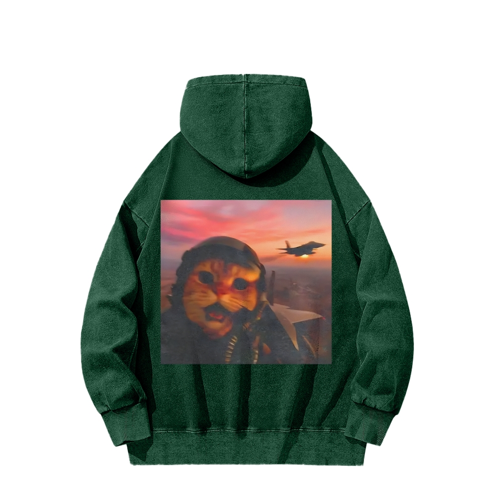 Funny Fighter Pilot Cat Back-printed Vintage Washed Hoodie