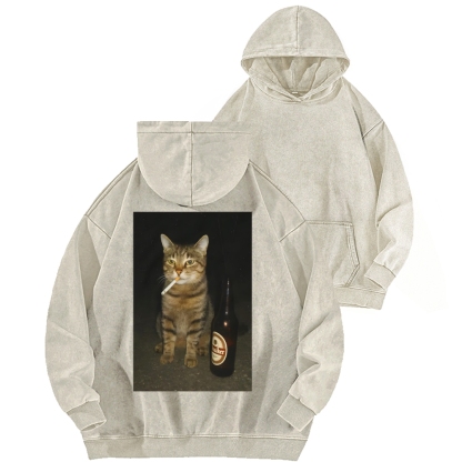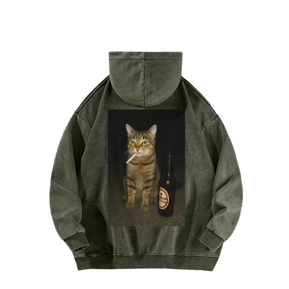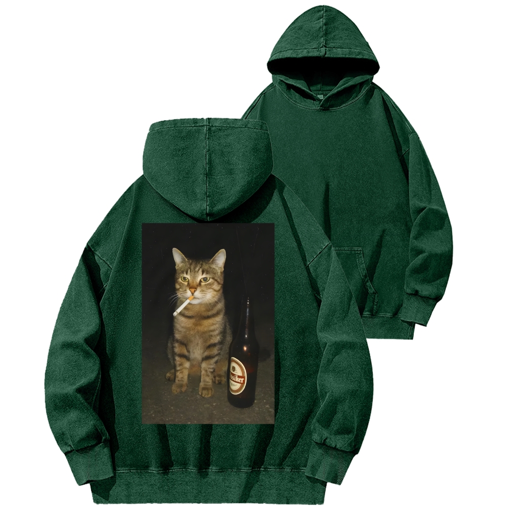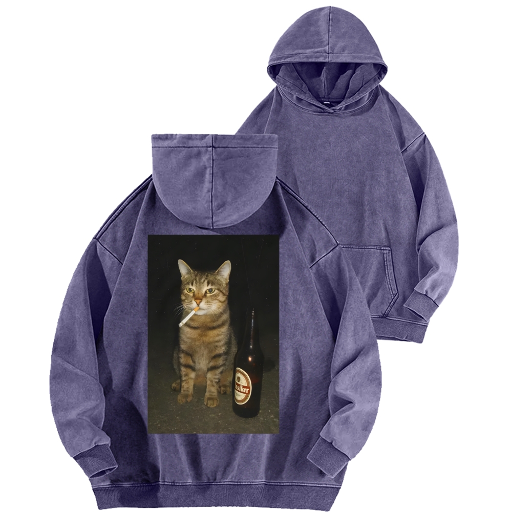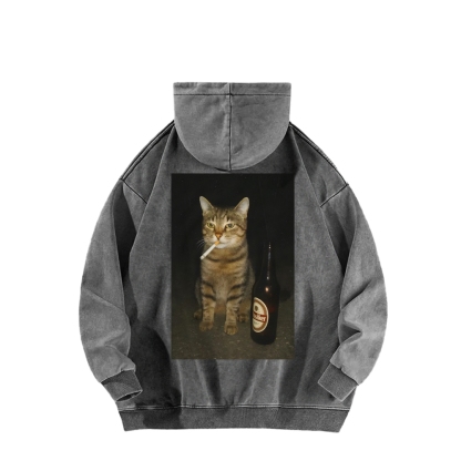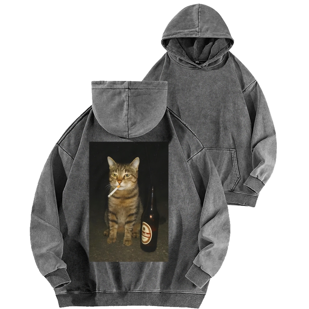 Funny Smoking Cat Back Printing Vintage Washed Hoodie