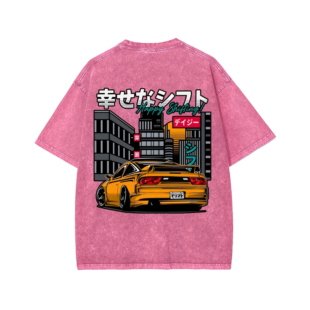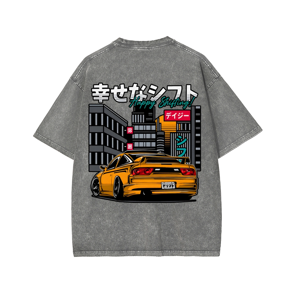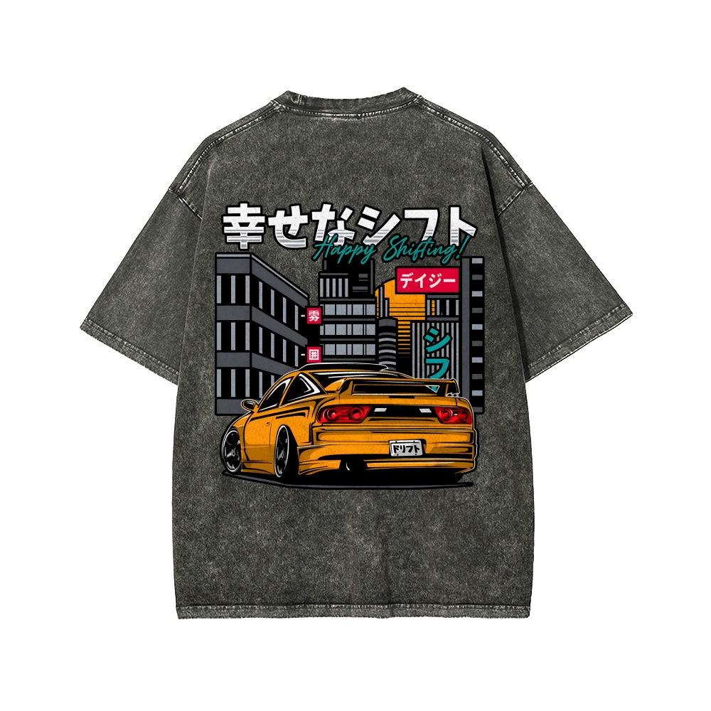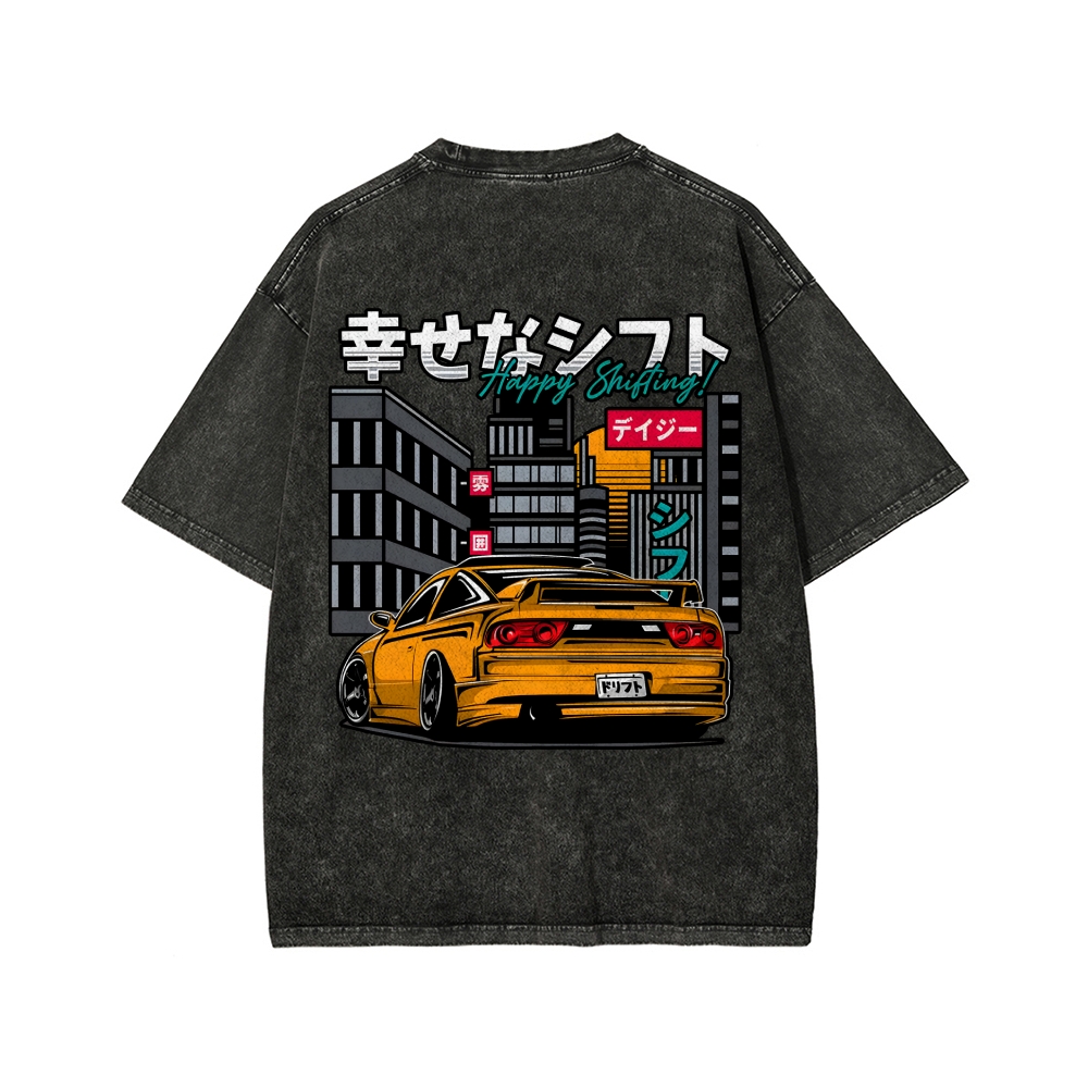 HAPPY SHIFT!! Retro Japanese Car Front And Back Printing Washed T-shirt