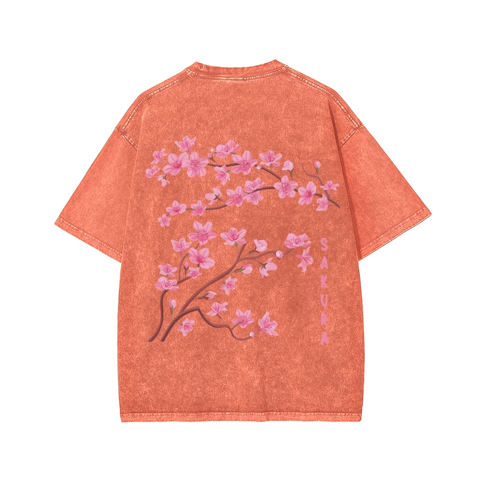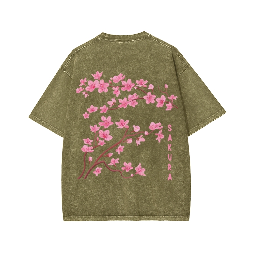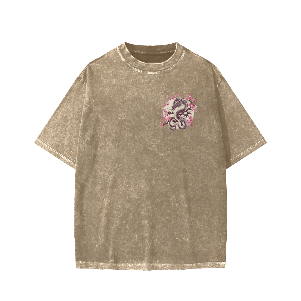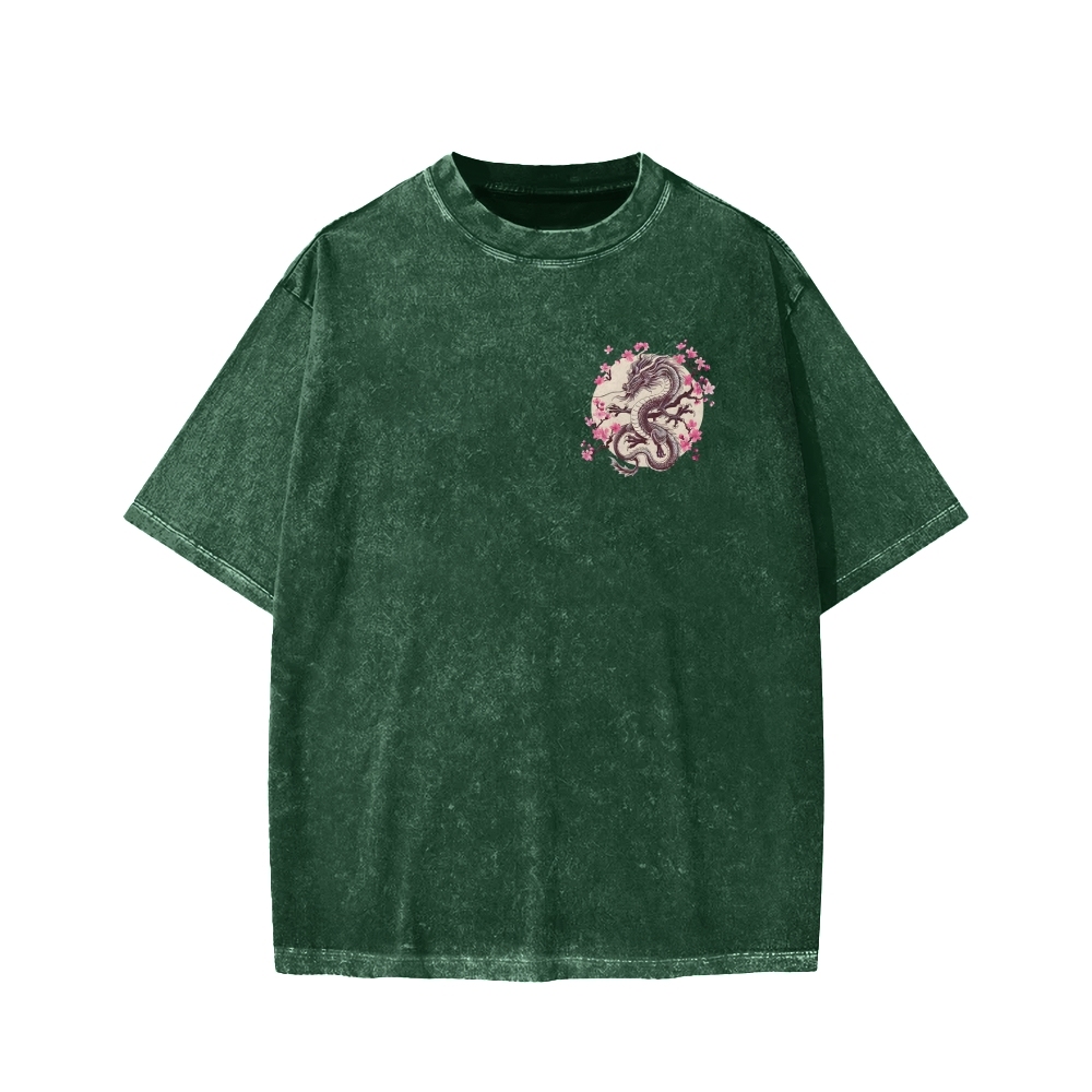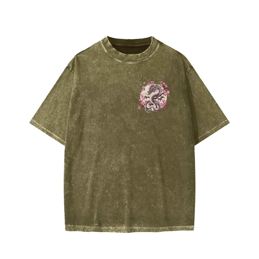 Japanese Sakura Dragon Front And Back Printing Washed T-shirt